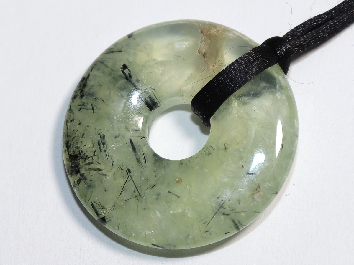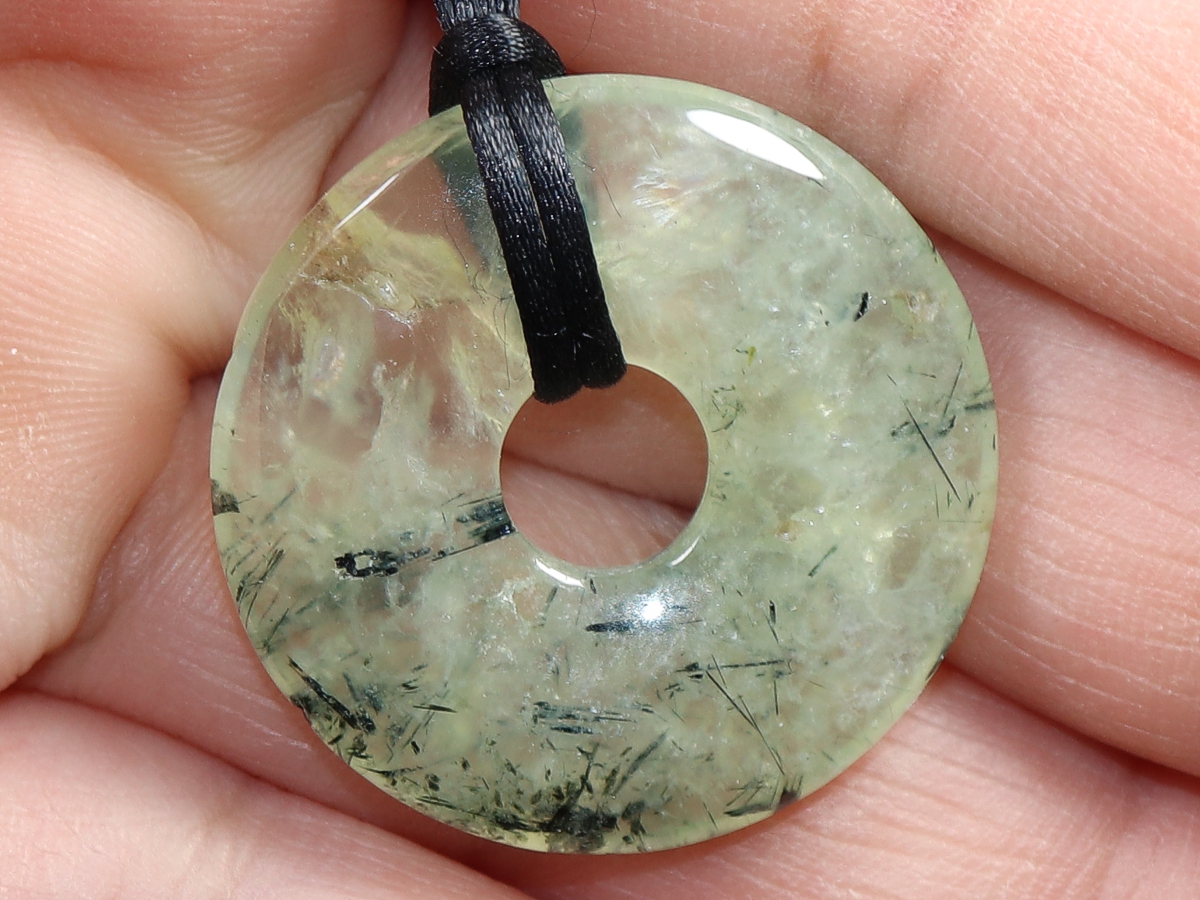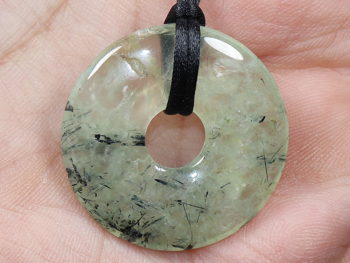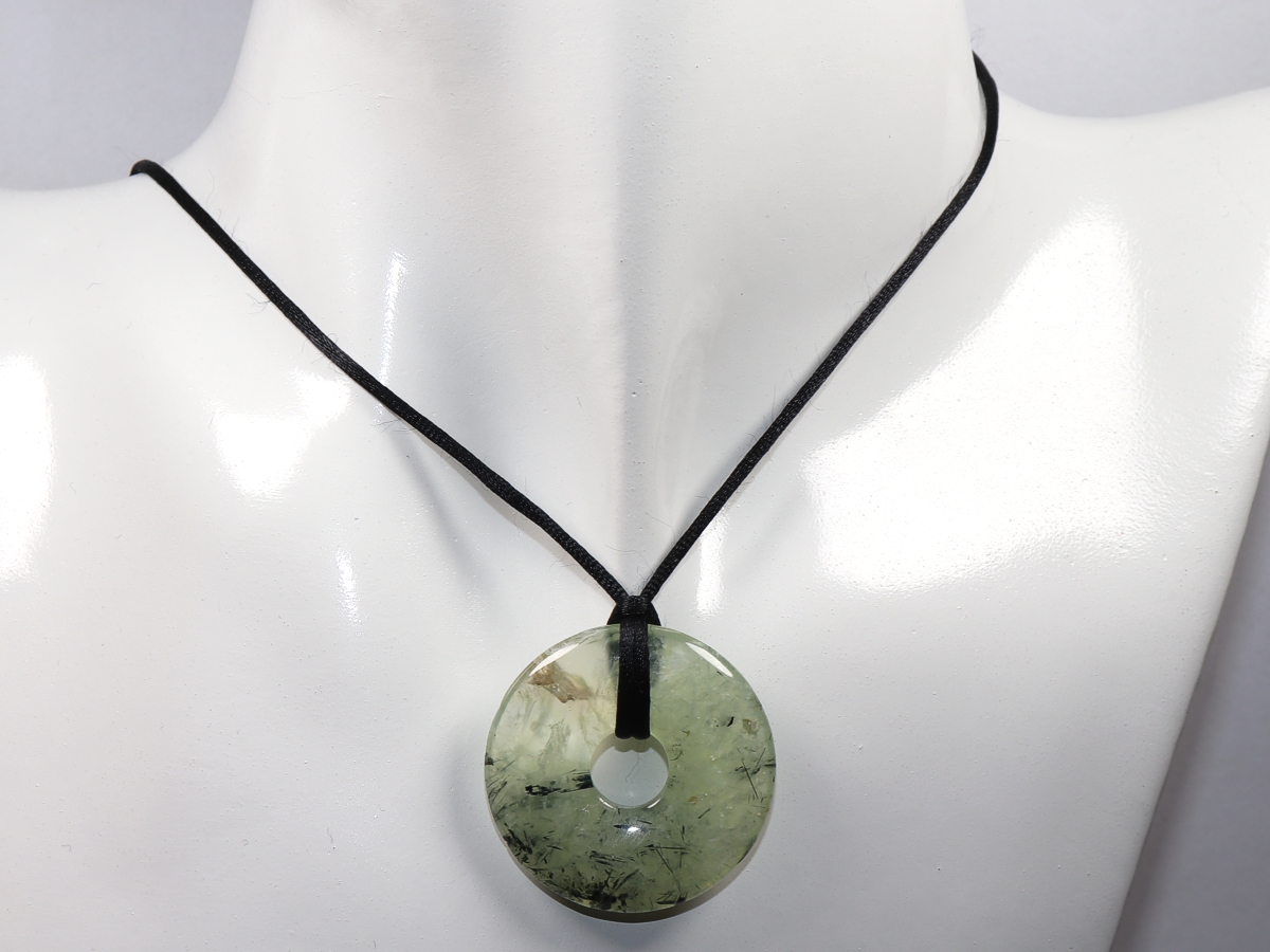 Die Halskette mit dem Donut aus Prehnit mit Epidot und einem schwarzen Band wird nach Ihren Angaben individualisiert. Der Verschluss ist aus Edelstahl.