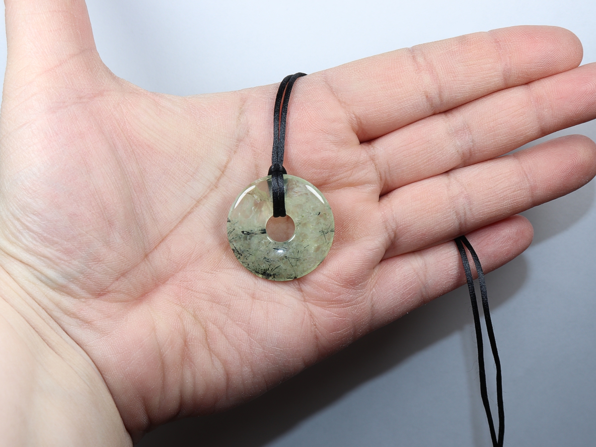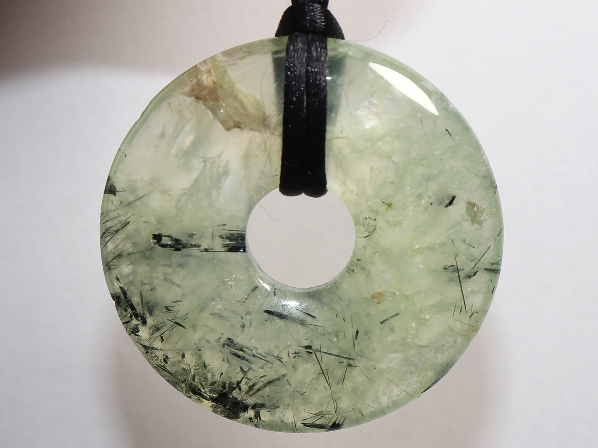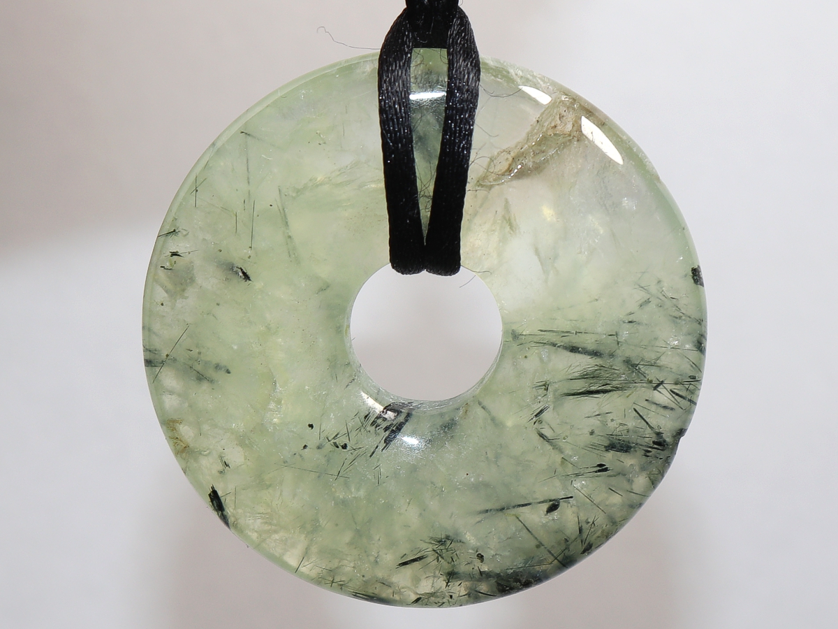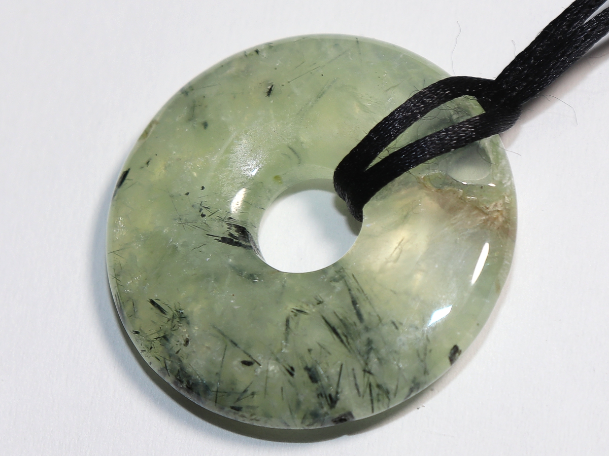 Die Halskette mit dem Donut aus Prehnit mit Epidot und einem schwarzen Band wird nach Ihren Angaben individualisiert. Der Verschluss ist aus Edelstahl.