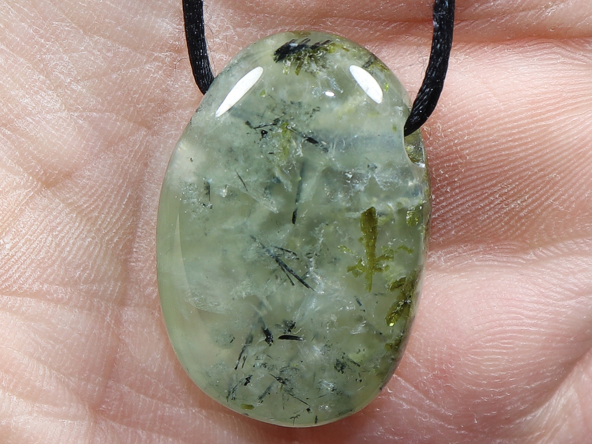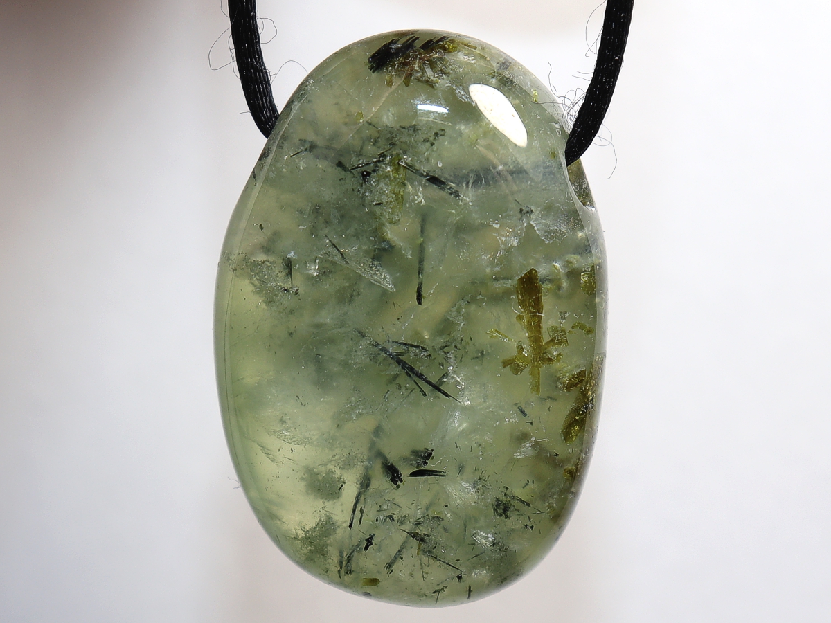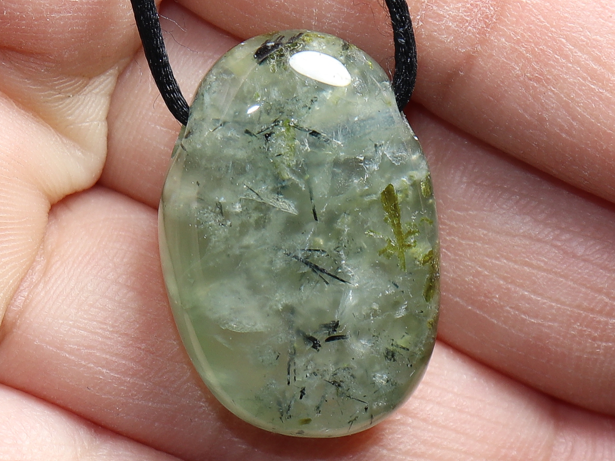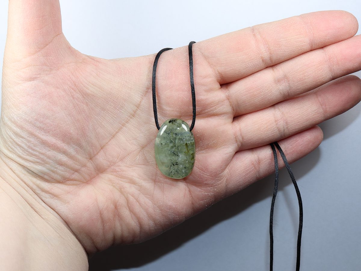 Die Halskette mit Prehnit mit Epidot wird nach Ihren Angaben individualisiert. Sie haben die Wahl zwischen einem schwarzen Band mit einem Verschluss aus Edelstahl oder einer Kette aus Silber 925.