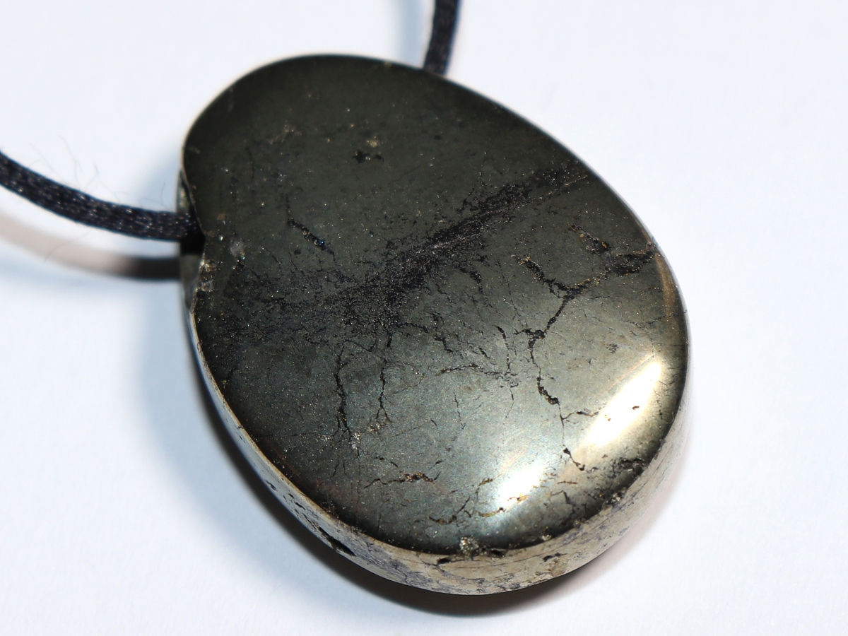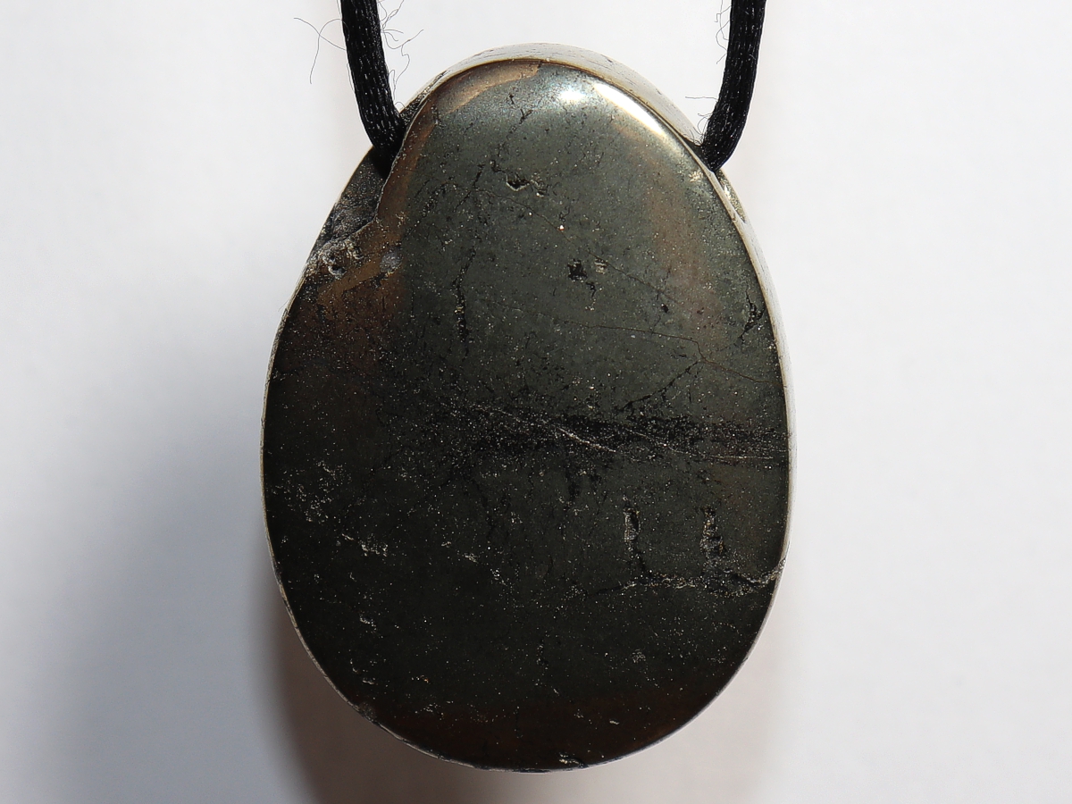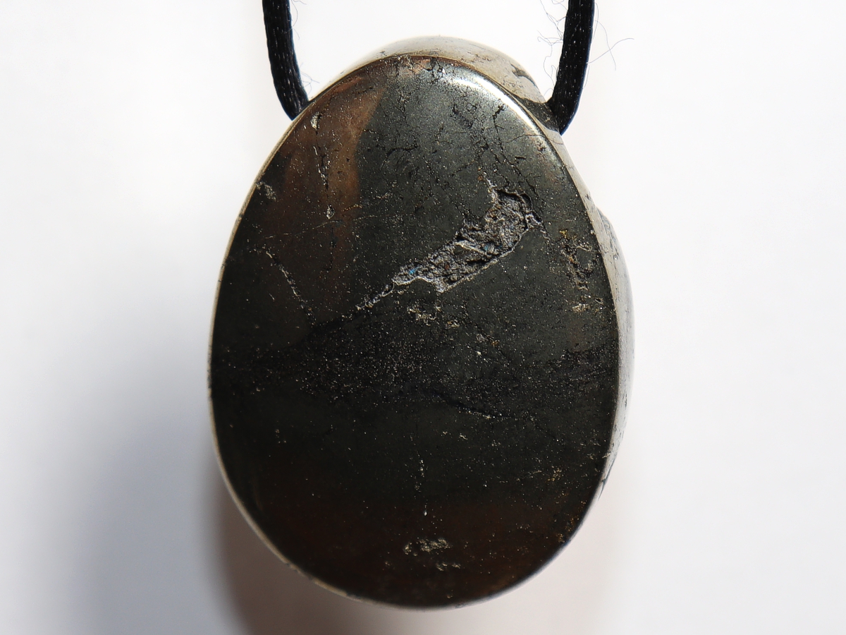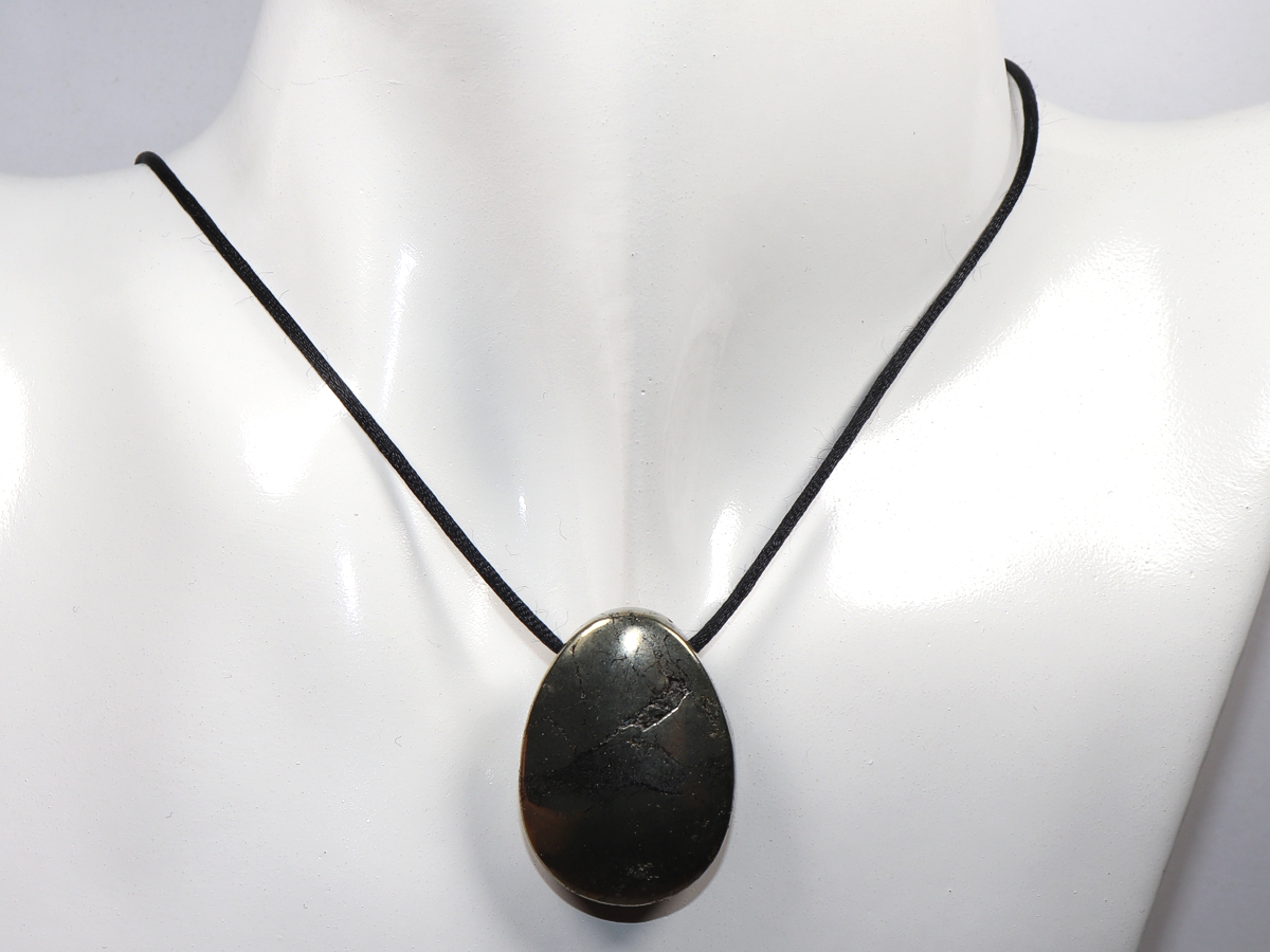 Die Halskette mit Pyrit wird nach Ihren Angaben individualisiert. Sie haben die Wahl zwischen einem schwarzen Band mit einem Verschluss aus Edelstahl oder einer Kette aus Silber 925.