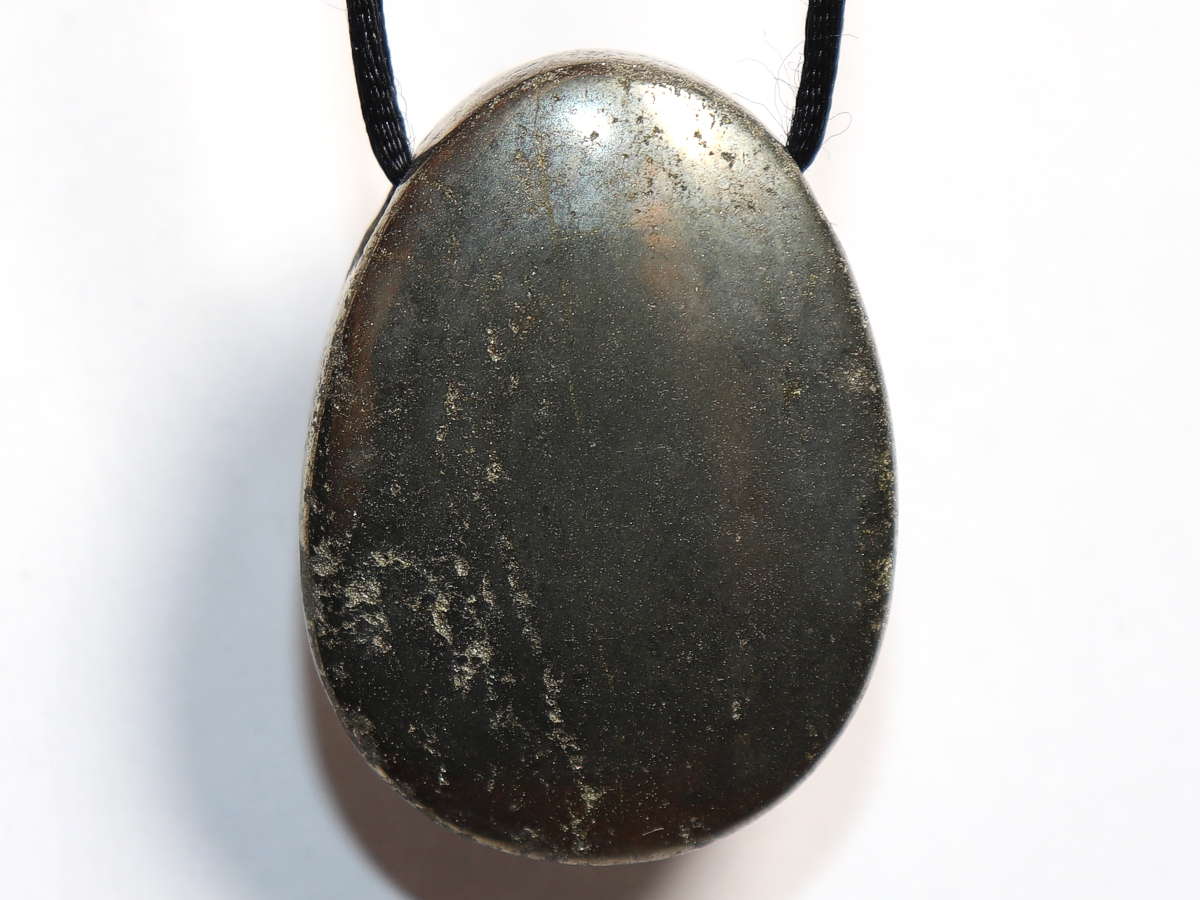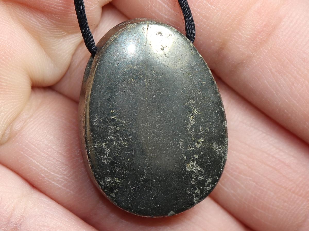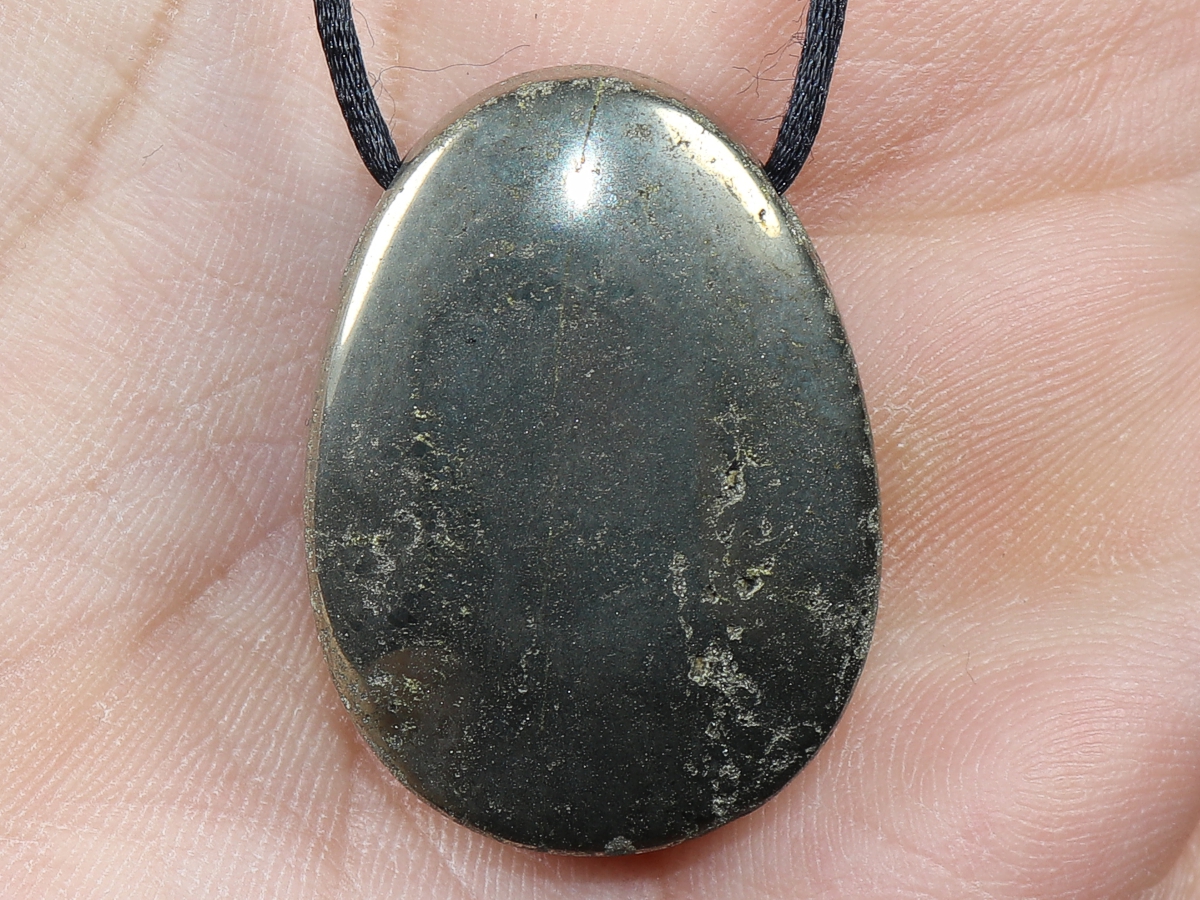 Die Halskette mit Pyrit wird nach Ihren Angaben individualisiert. Sie haben die Wahl zwischen einem schwarzen Band mit einem Verschluss aus Edelstahl oder einer Kette aus Silber 925.