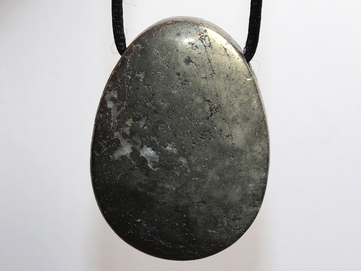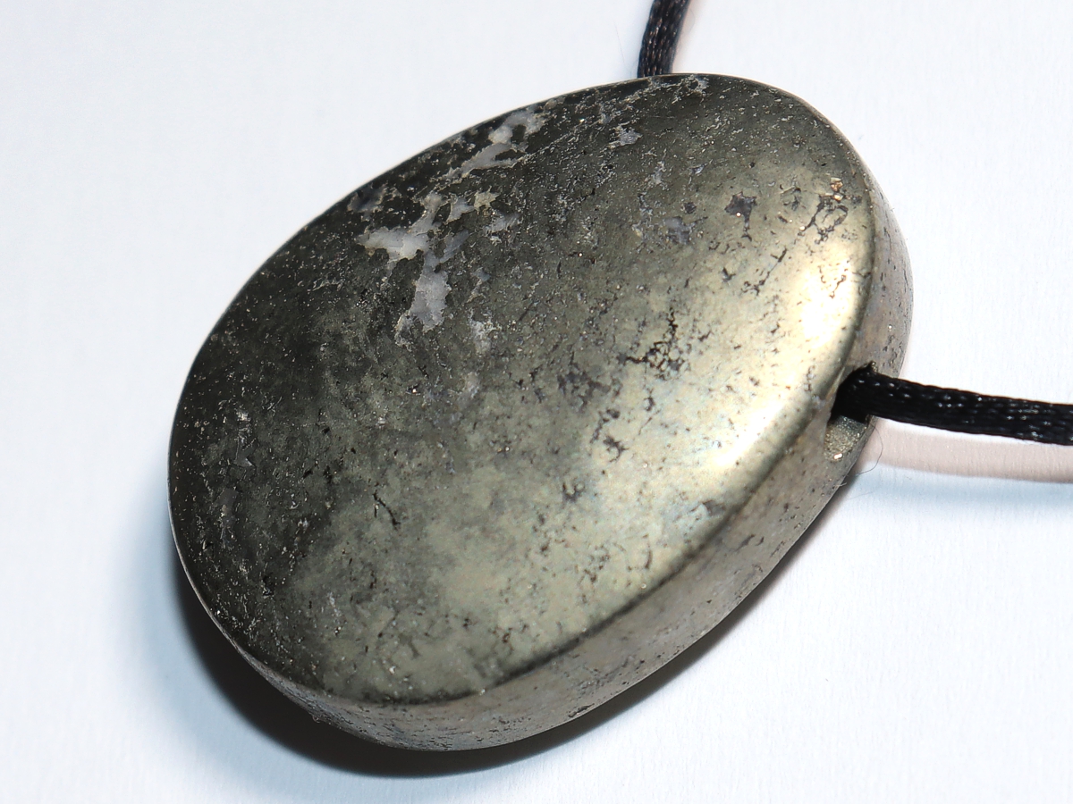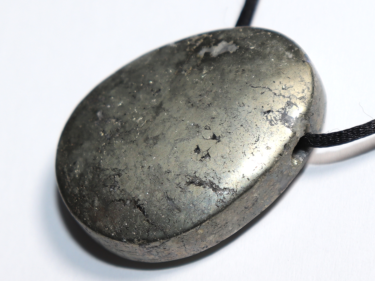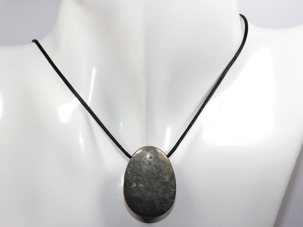 Die Halskette mit Pyrit wird nach Ihren Angaben individualisiert. Sie haben die Wahl zwischen einem schwarzen Band mit einem Verschluss aus Edelstahl oder einer Kette aus Silber 925.