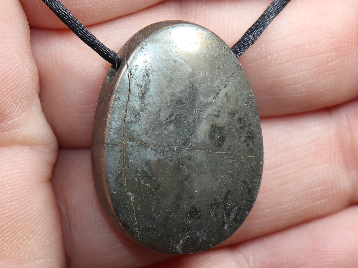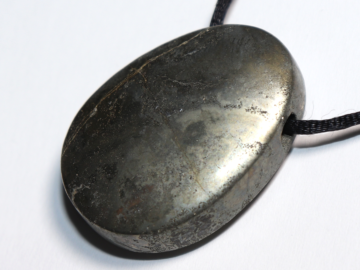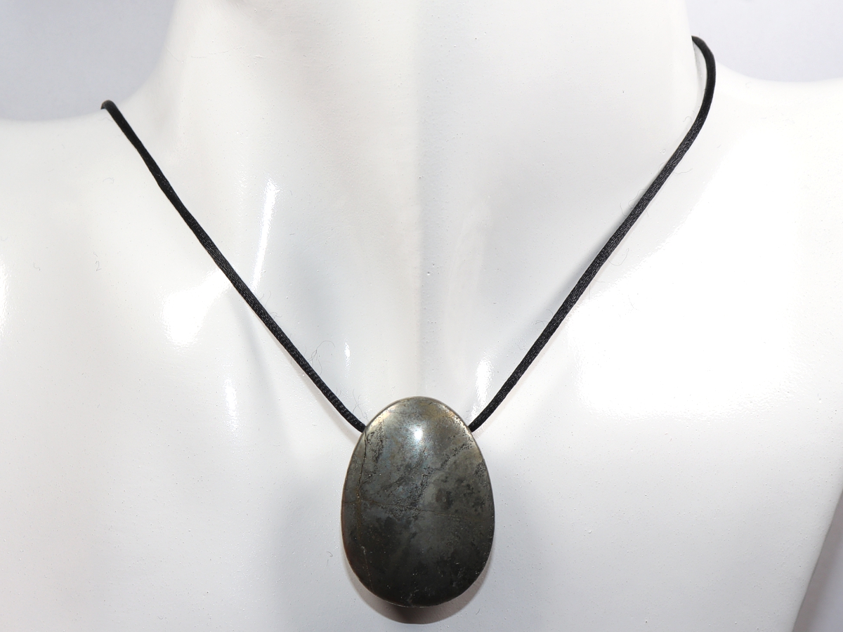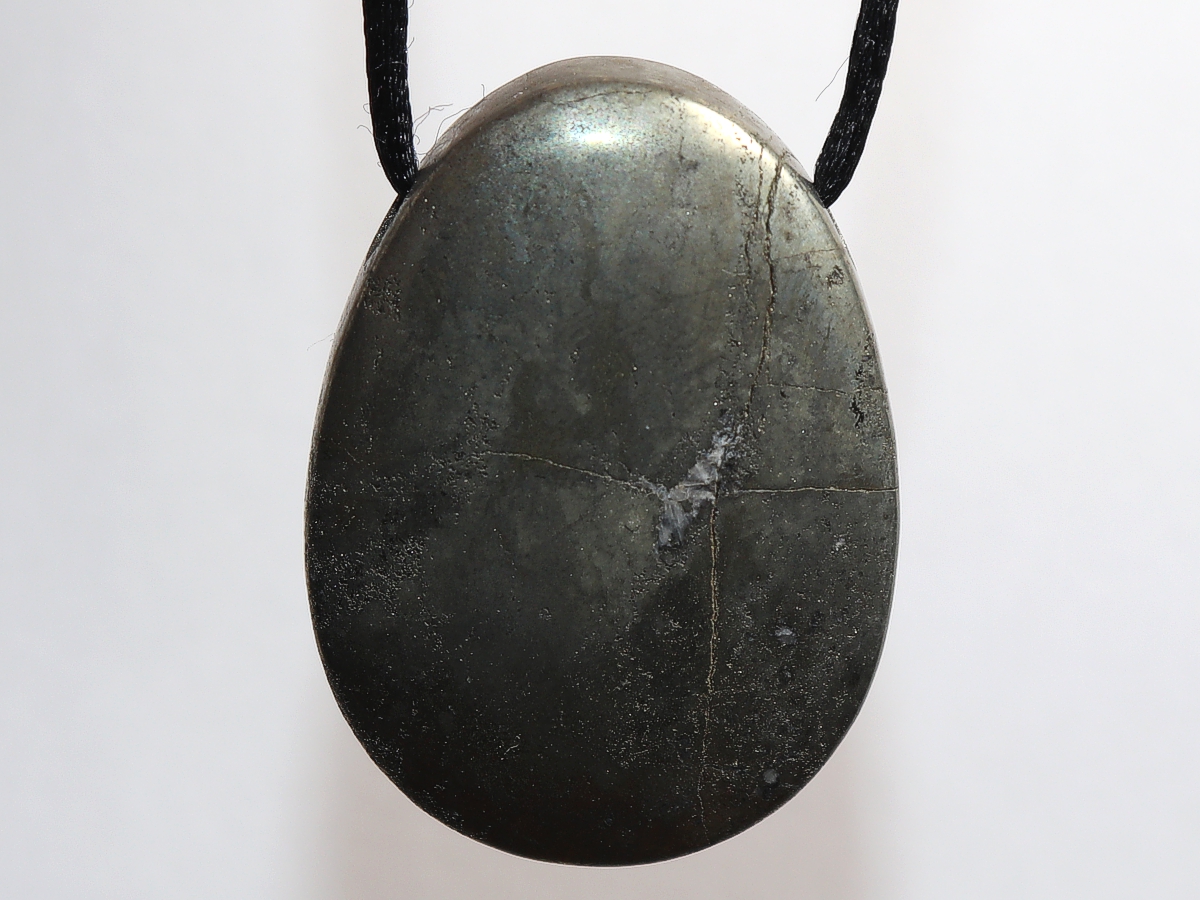 Die Halskette mit Pyrit wird nach Ihren Angaben individualisiert. Sie haben die Wahl zwischen einem schwarzen Band mit einem Verschluss aus Edelstahl oder einer Kette aus Silber 925.