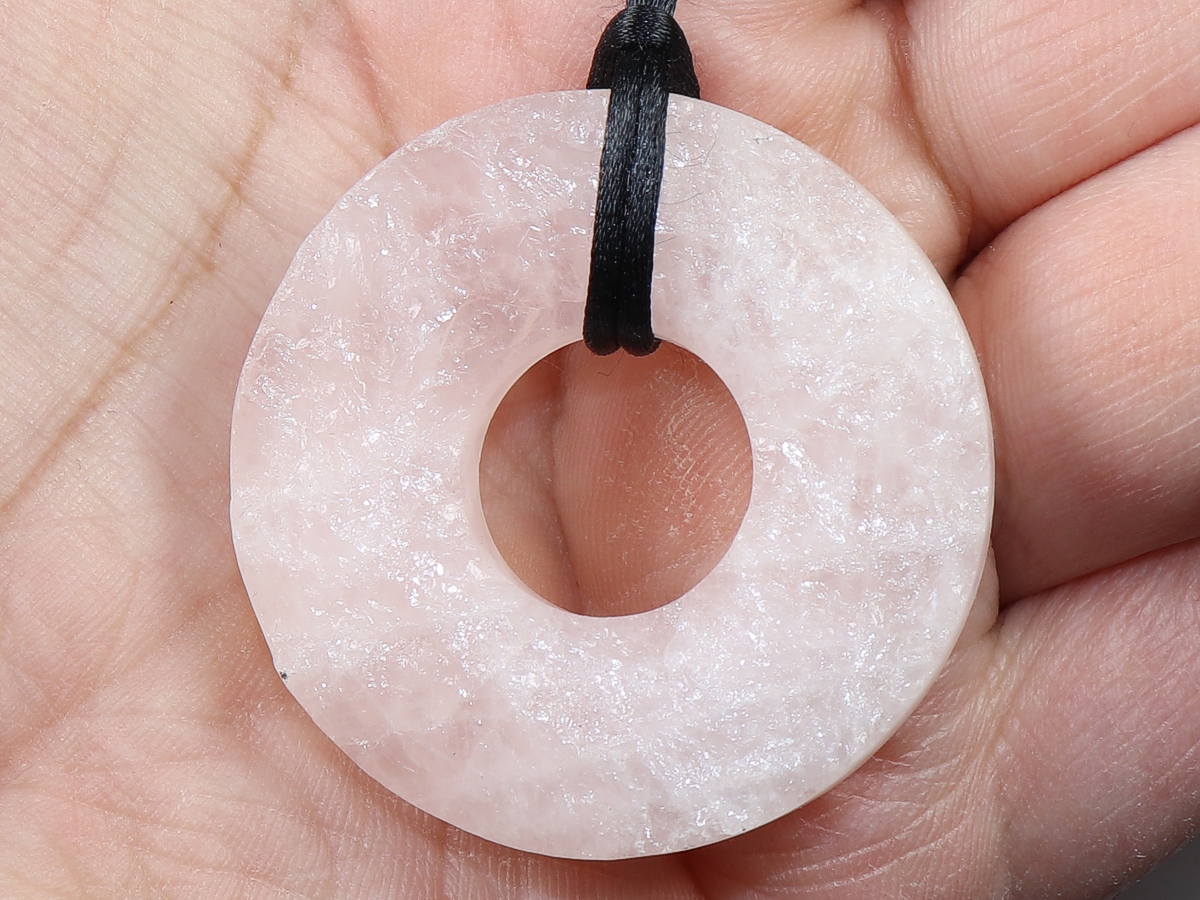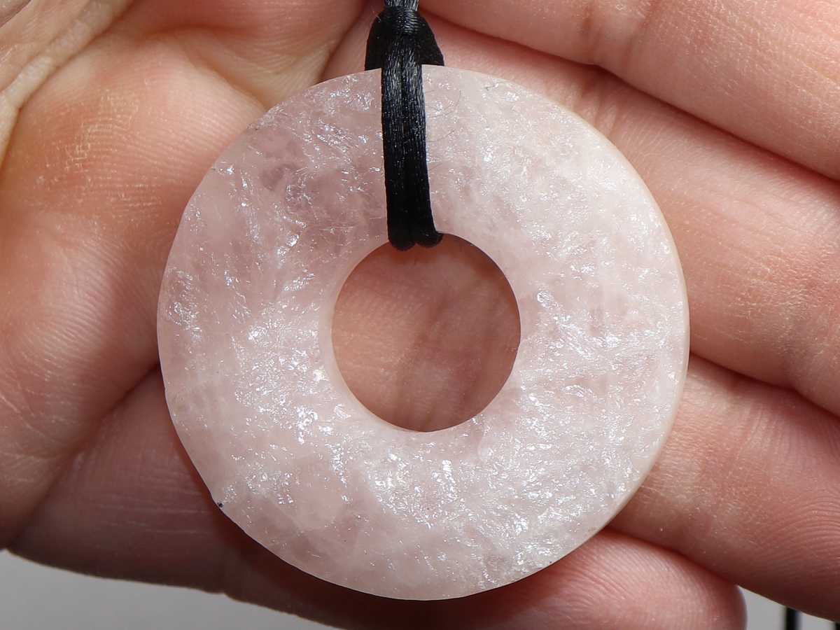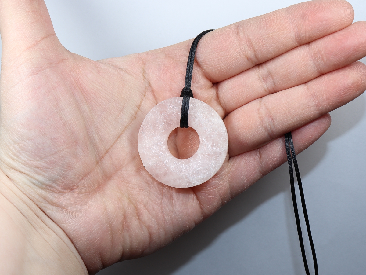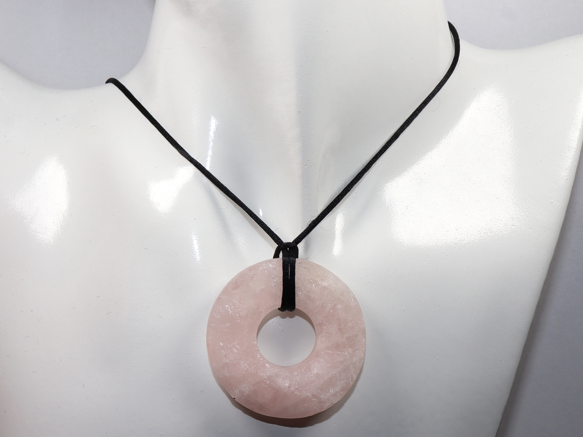 Die Halskette mit dem Donut aus Rosenquarz und einem schwarzen Band wird nach Ihren Angaben individualisiert. Der Verschluss ist aus Edelstahl.