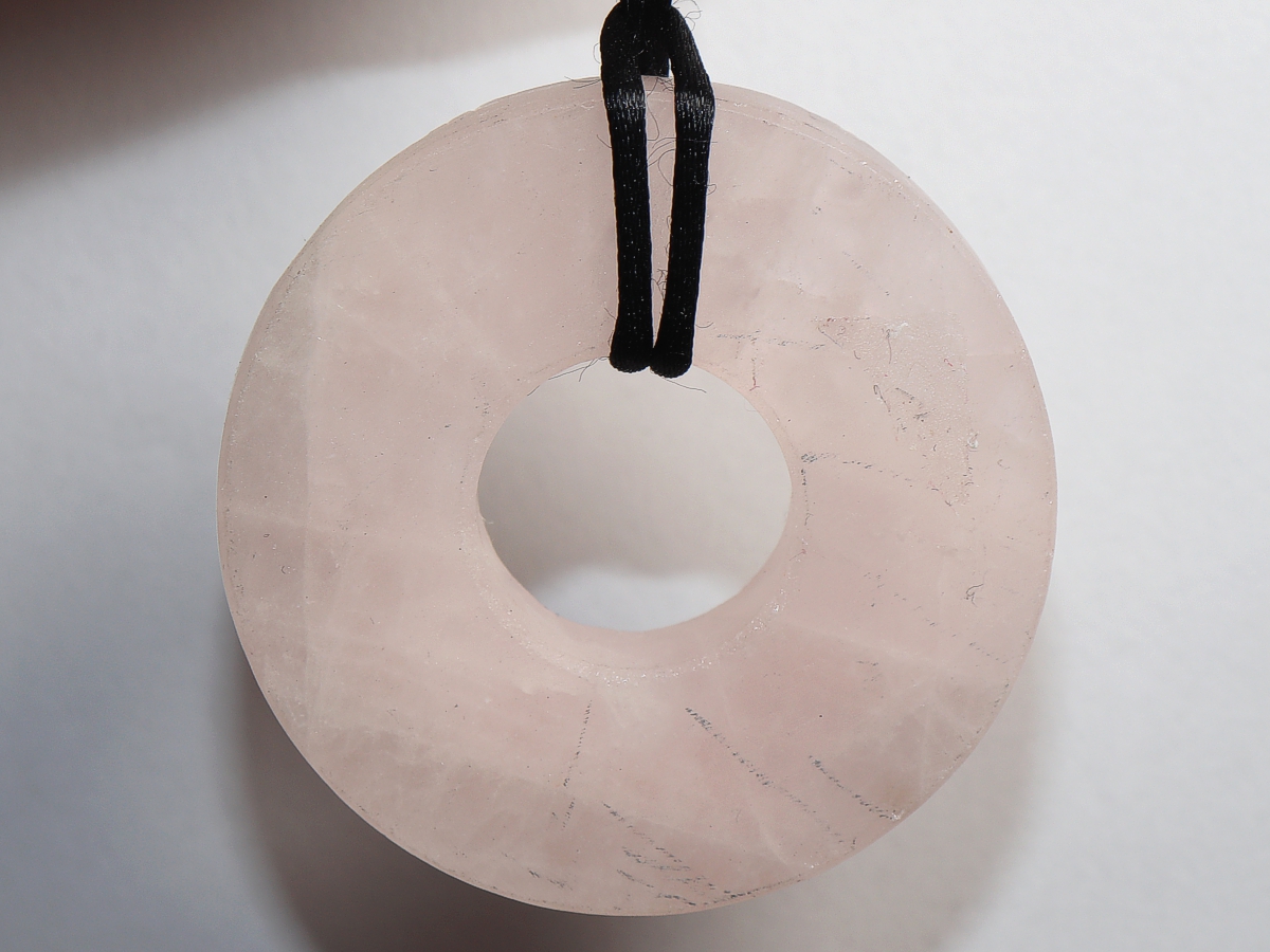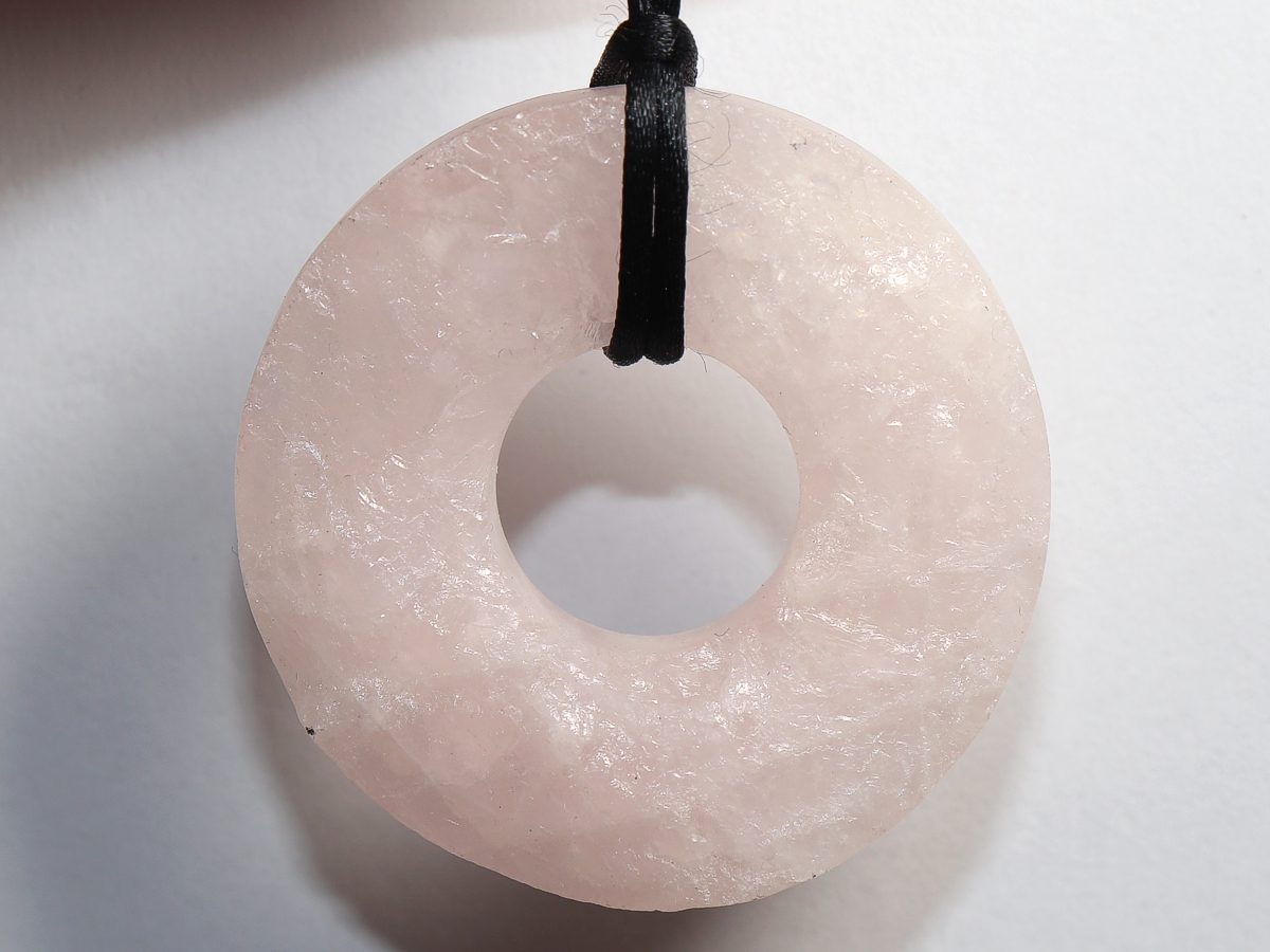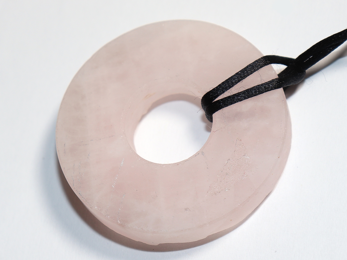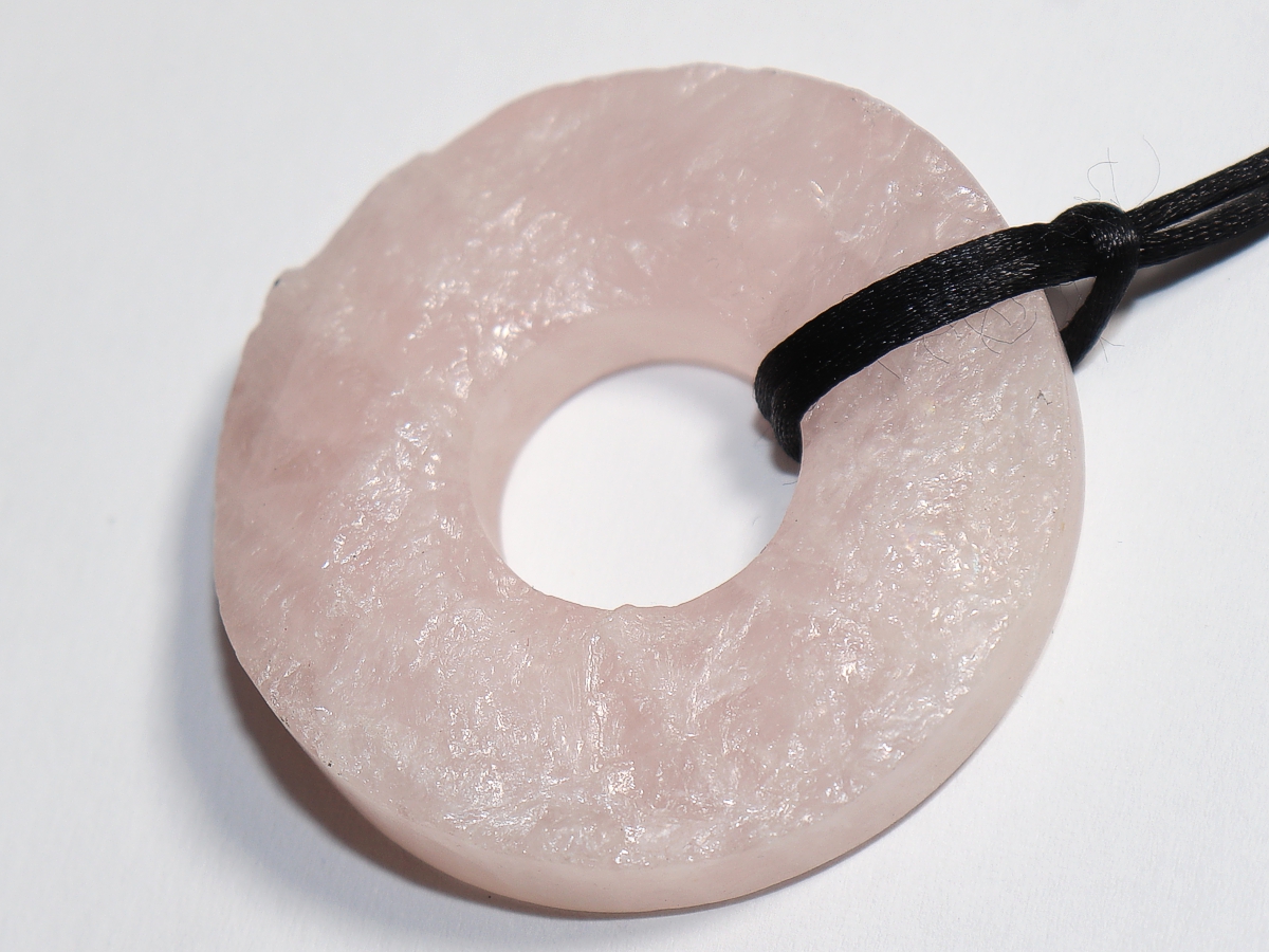 Die Halskette mit dem Donut aus Rosenquarz und einem schwarzen Band wird nach Ihren Angaben individualisiert. Der Verschluss ist aus Edelstahl.