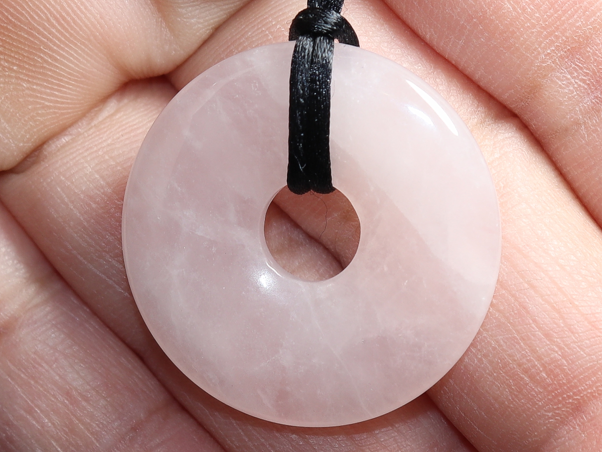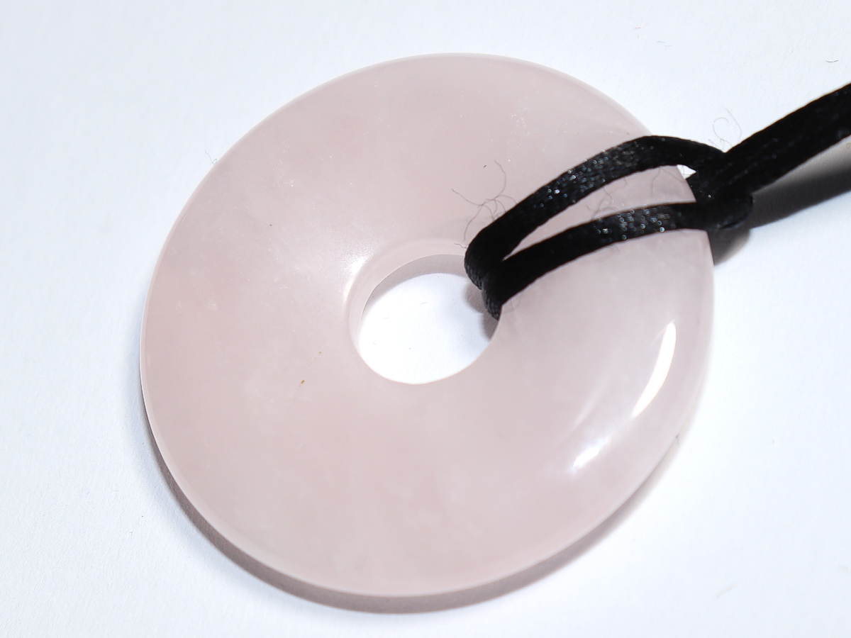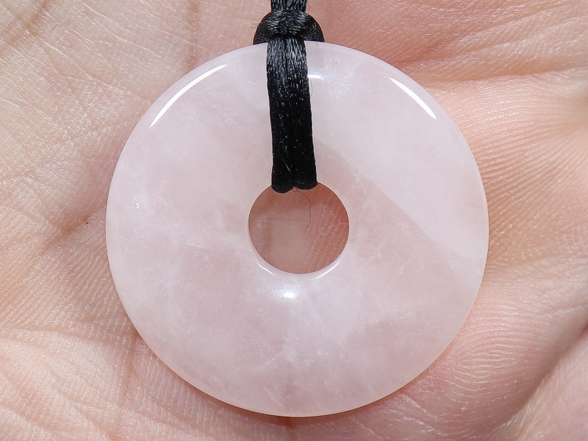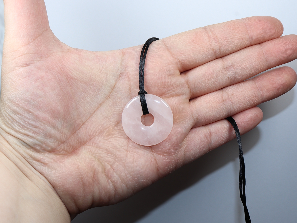 Die Halskette mit dem Donut aus Rosenquarz und einem schwarzen Band wird nach Ihren Angaben individualisiert. Der Verschluss ist aus Edelstahl.