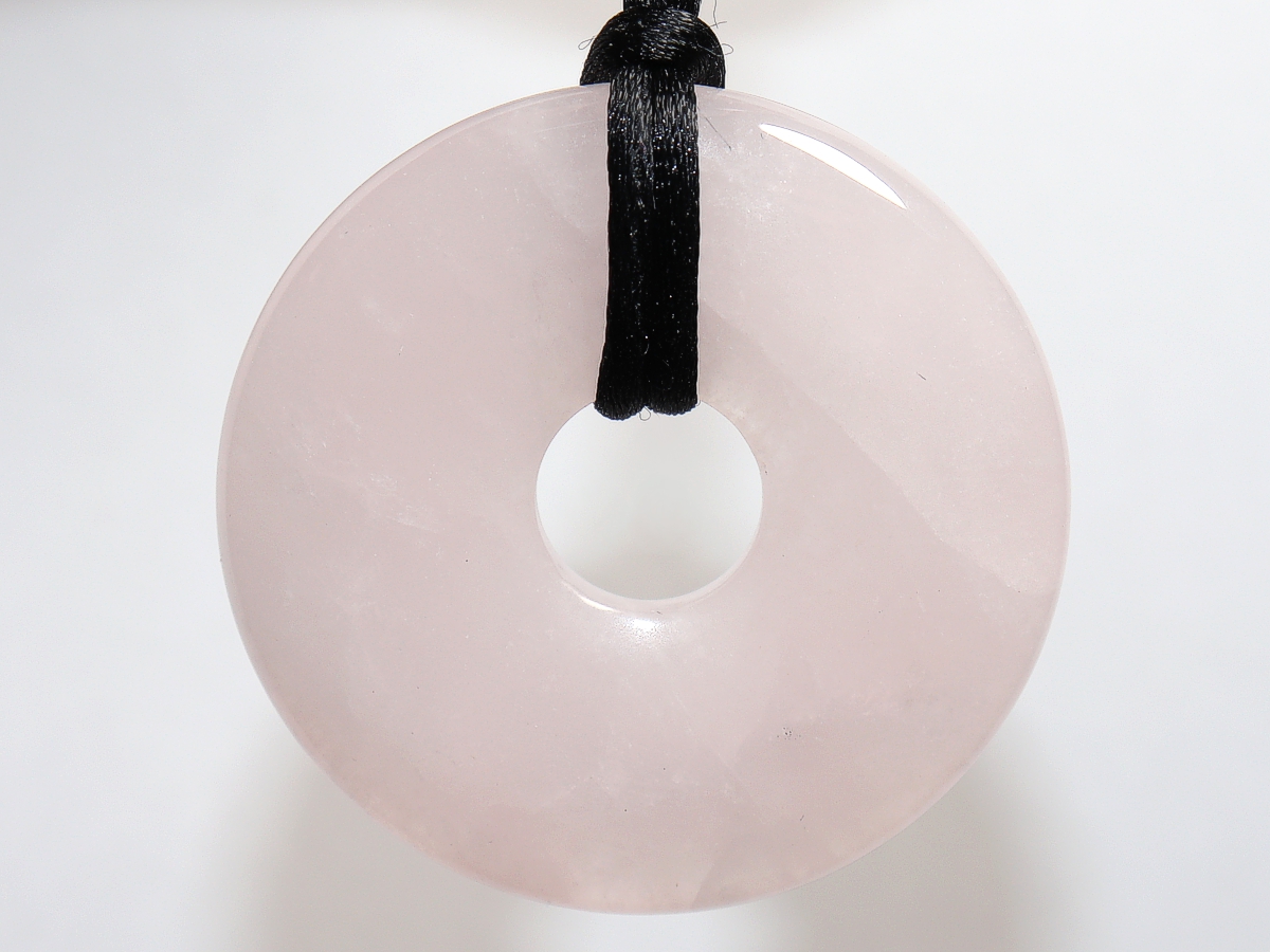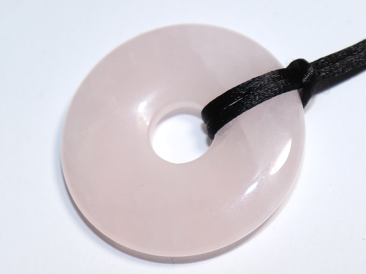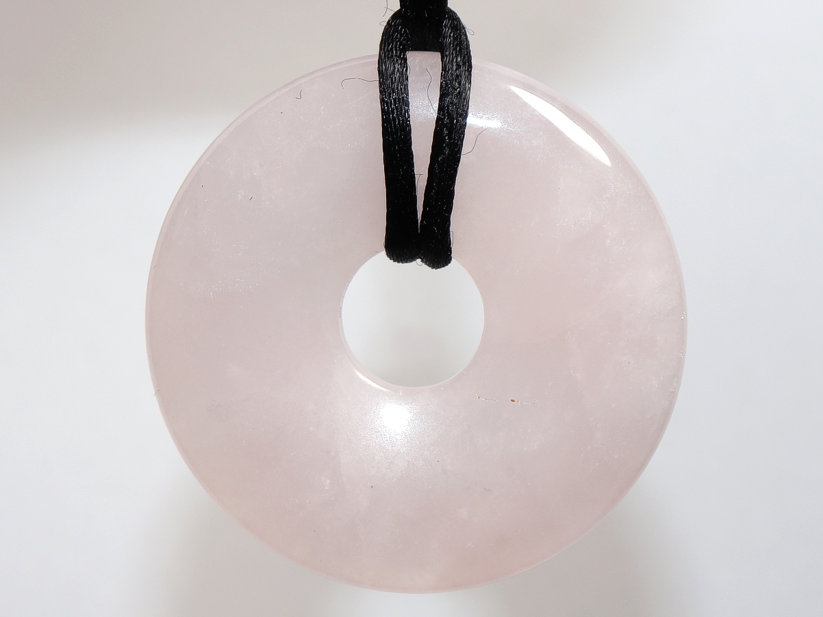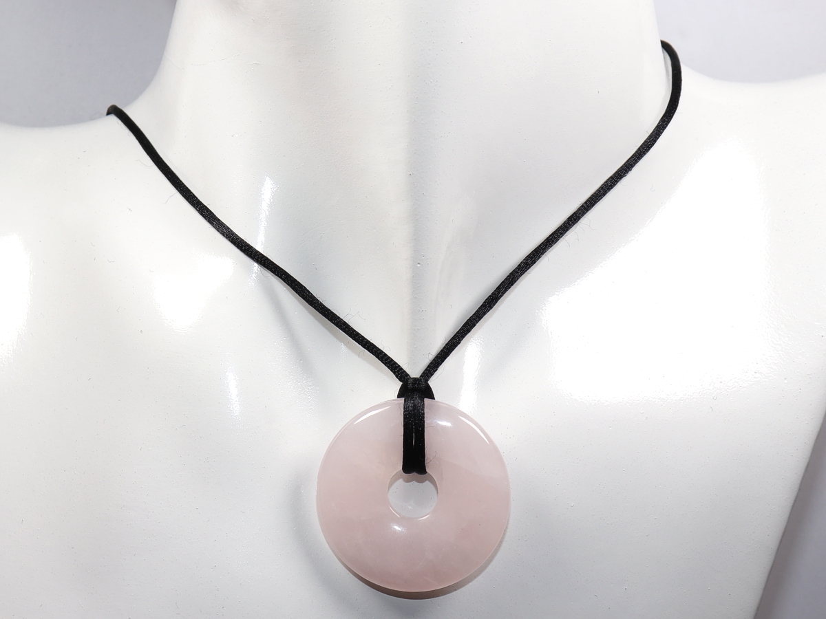 Die Halskette mit dem Donut aus Rosenquarz und einem schwarzen Band wird nach Ihren Angaben individualisiert. Der Verschluss ist aus Edelstahl.