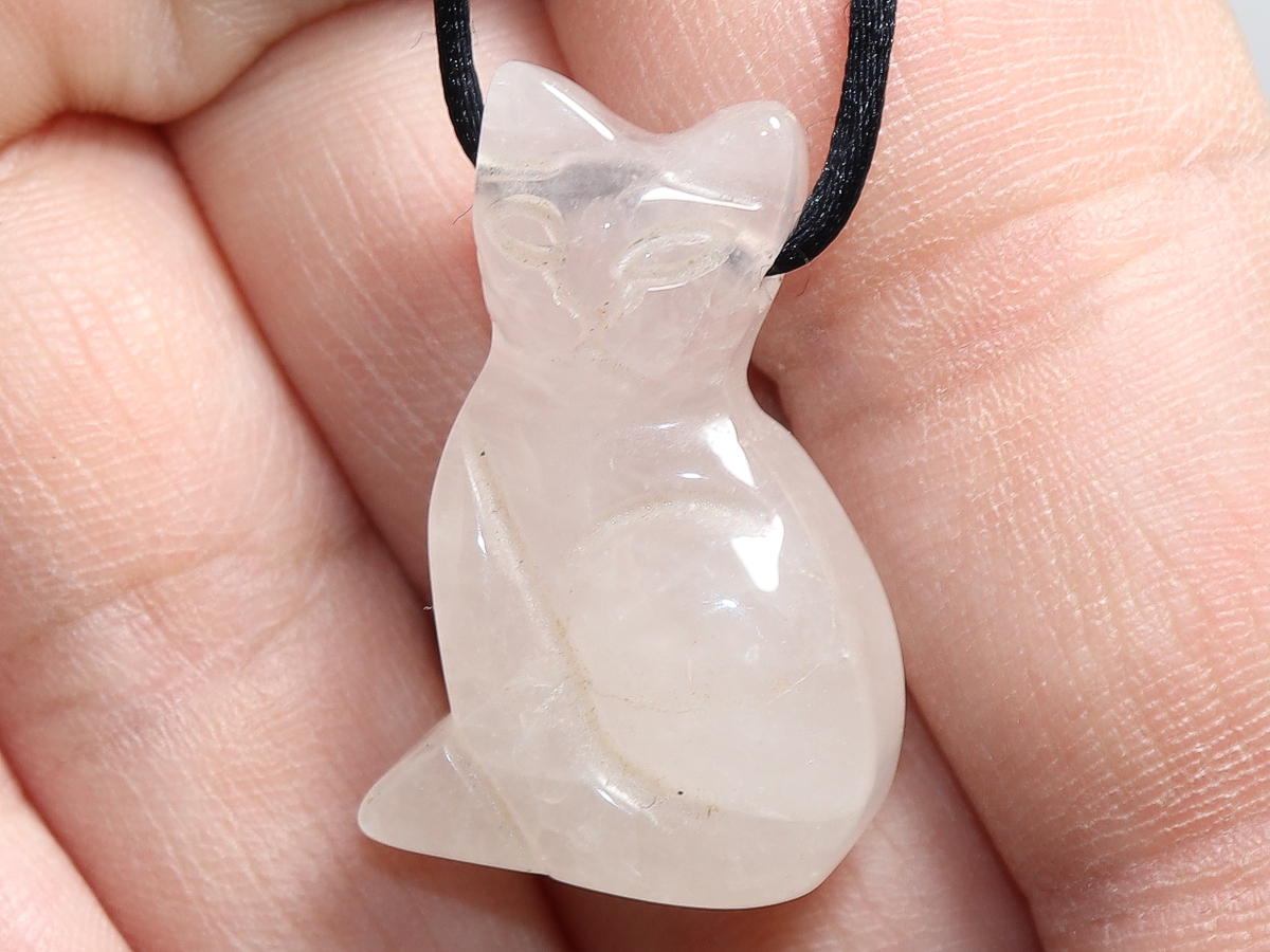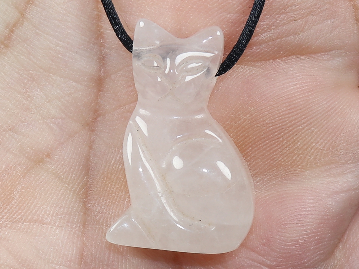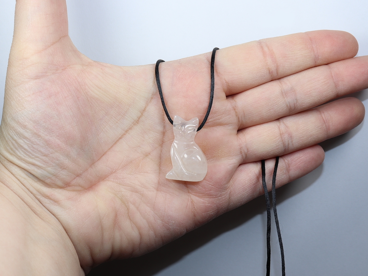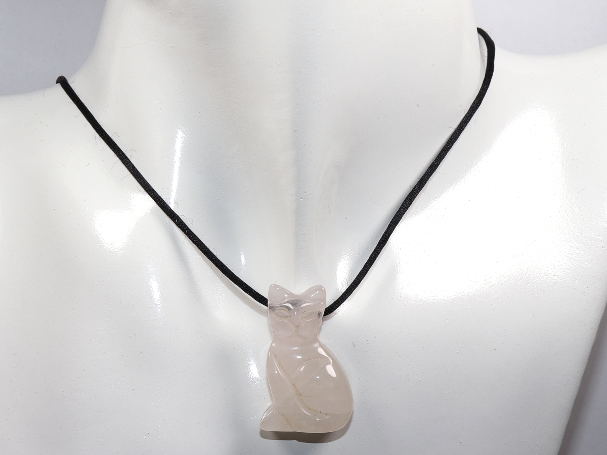Die Halskette mit der Katze aus Rosenquarz wird nach Ihren Angaben individualisiert. Sie haben die Wahl zwischen einem schwarzen Band mit einem Verschluss aus Edelstahl oder einer Kette aus Silber 925.