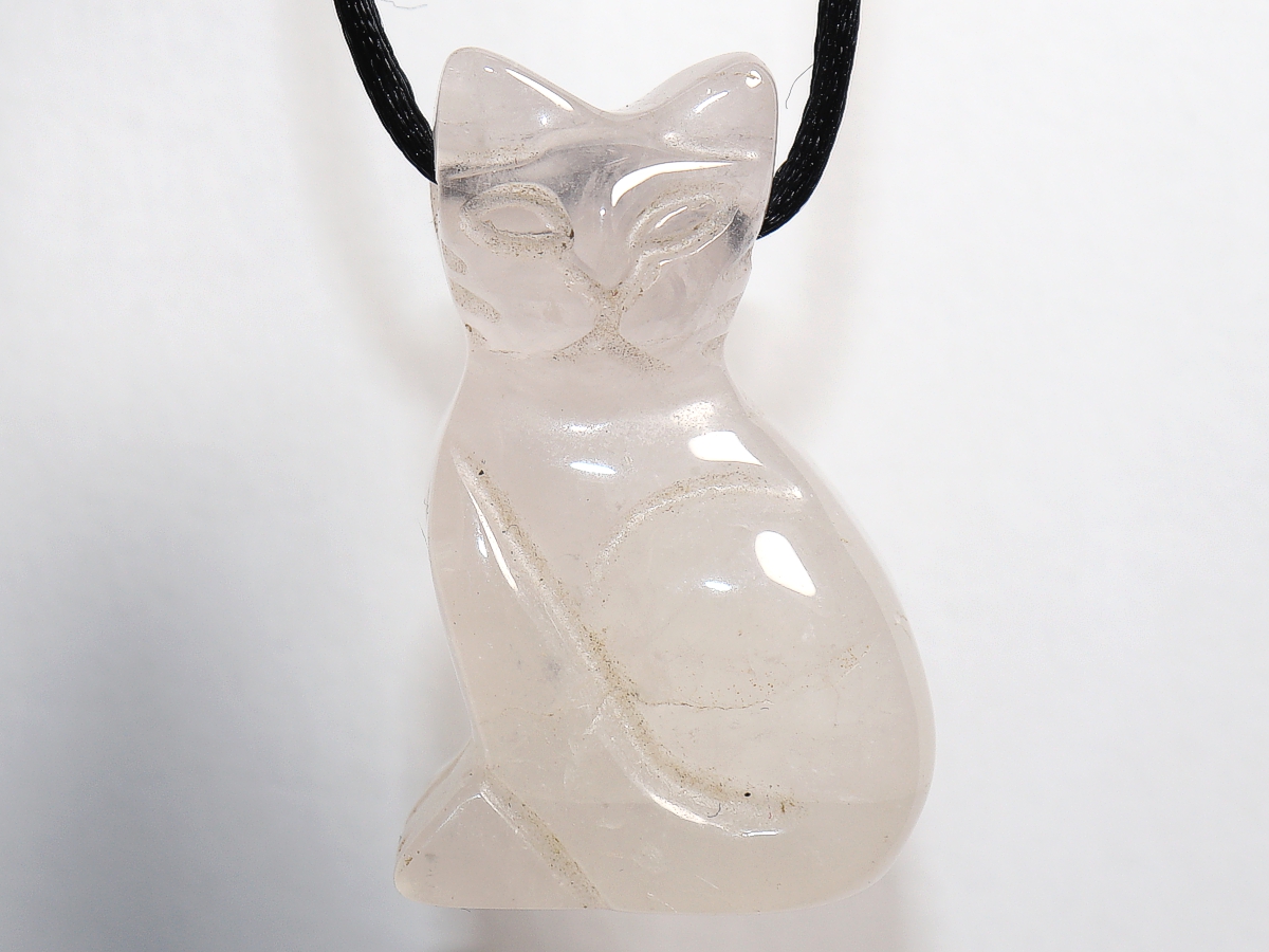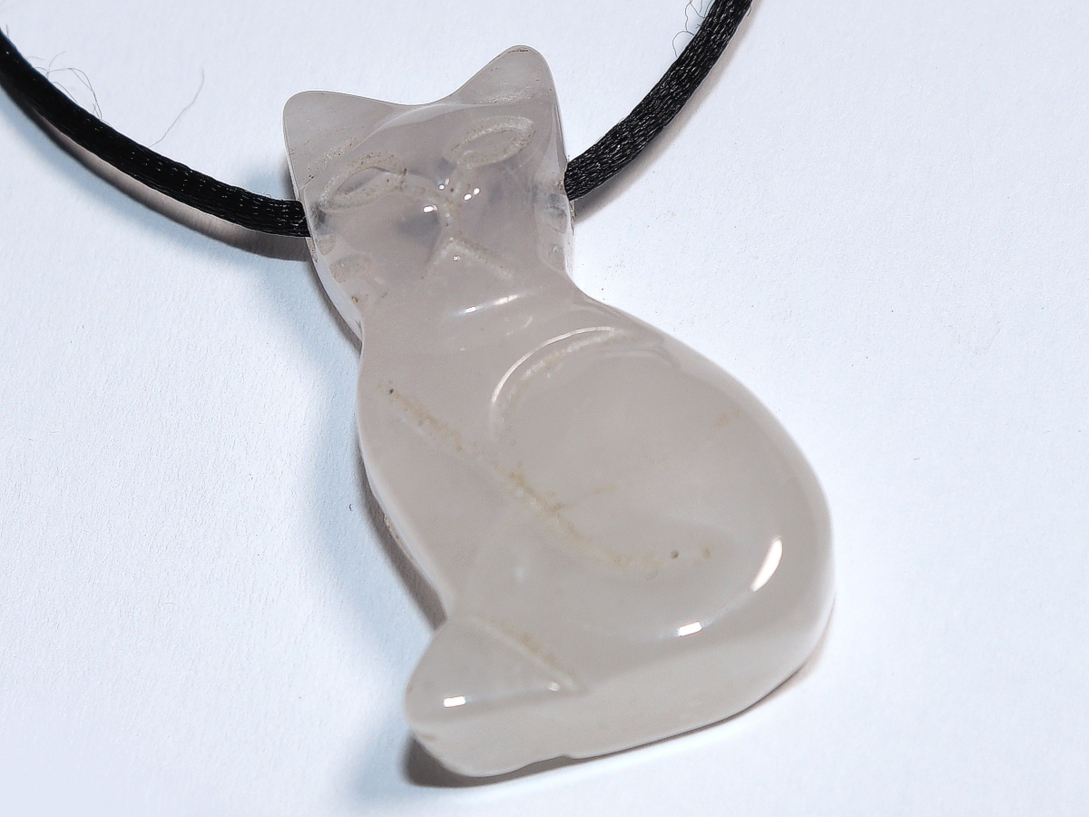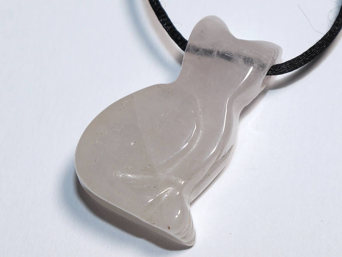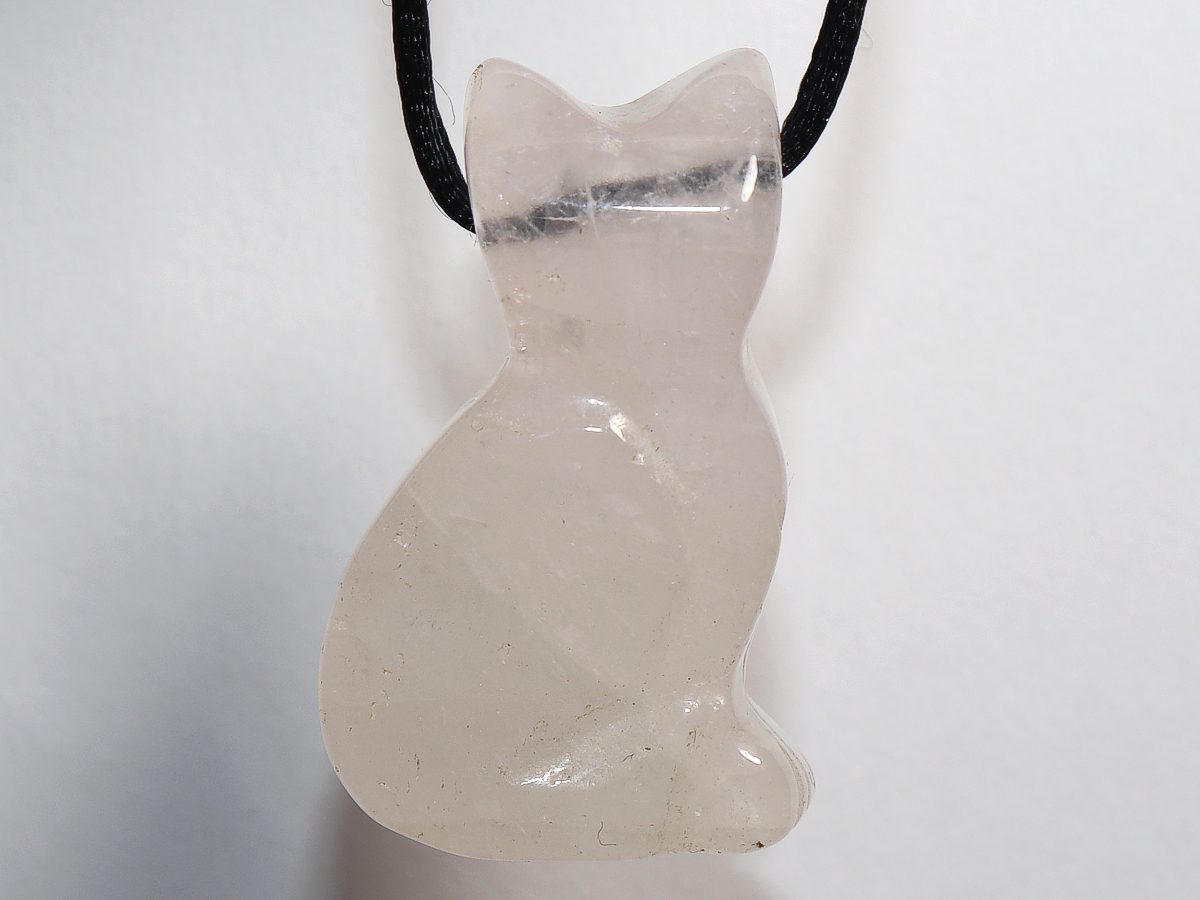 Die Halskette mit der Katze aus Rosenquarz wird nach Ihren Angaben individualisiert. Sie haben die Wahl zwischen einem schwarzen Band mit einem Verschluss aus Edelstahl oder einer Kette aus Silber 925.