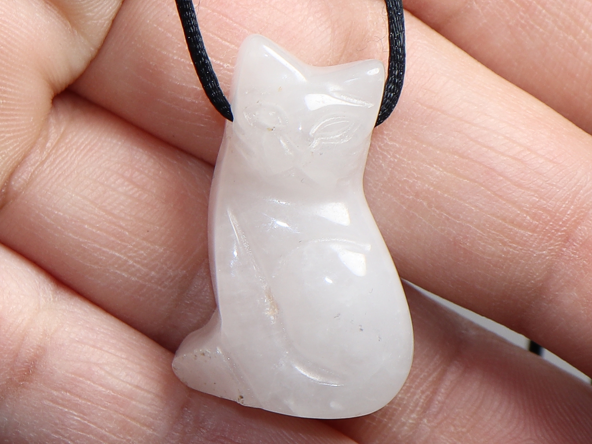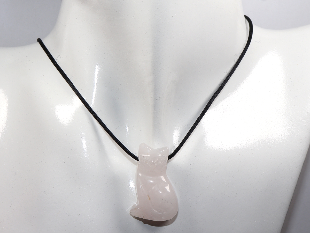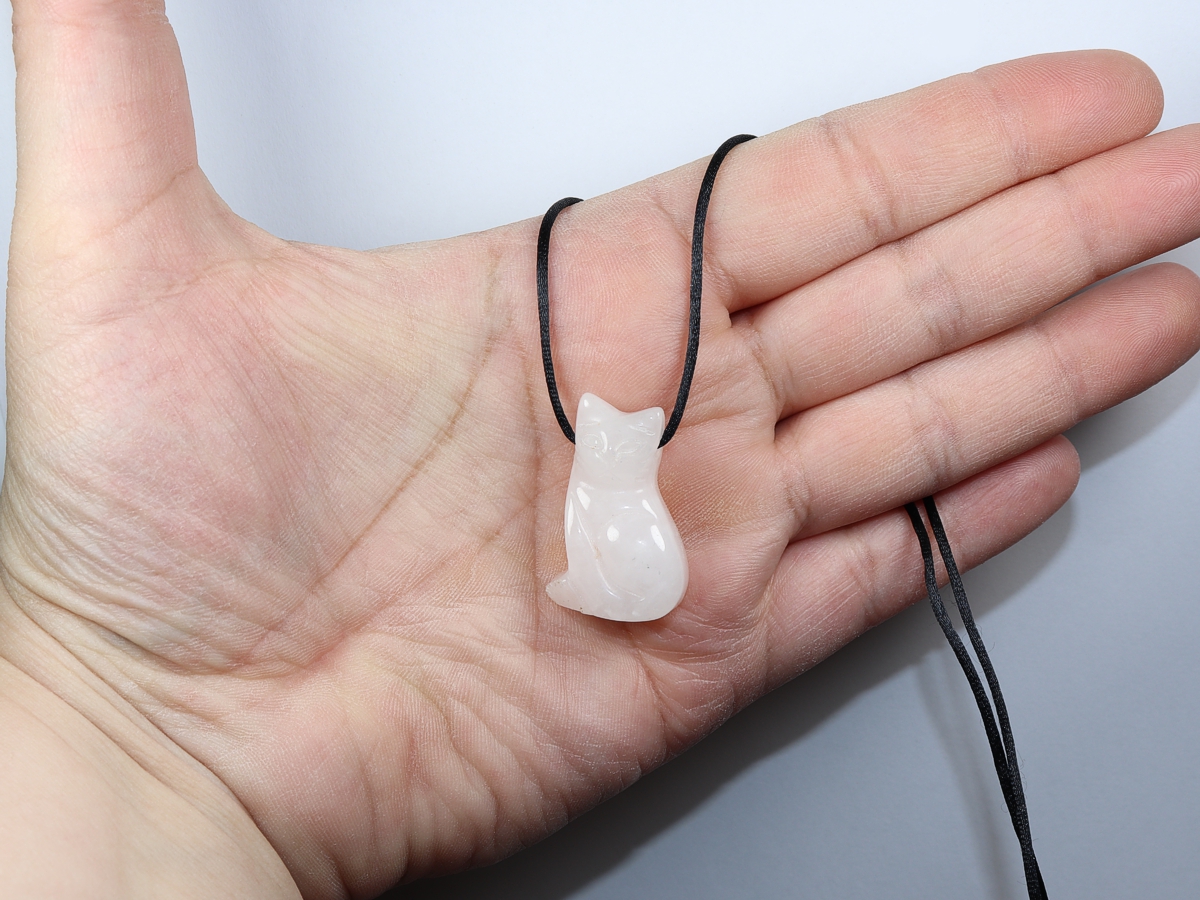 Die Halskette mit der Katze aus Rosenquarz wird nach Ihren Angaben individualisiert. Sie haben die Wahl zwischen einem schwarzen Band mit einem Verschluss aus Edelstahl oder einer Kette aus Silber 925.