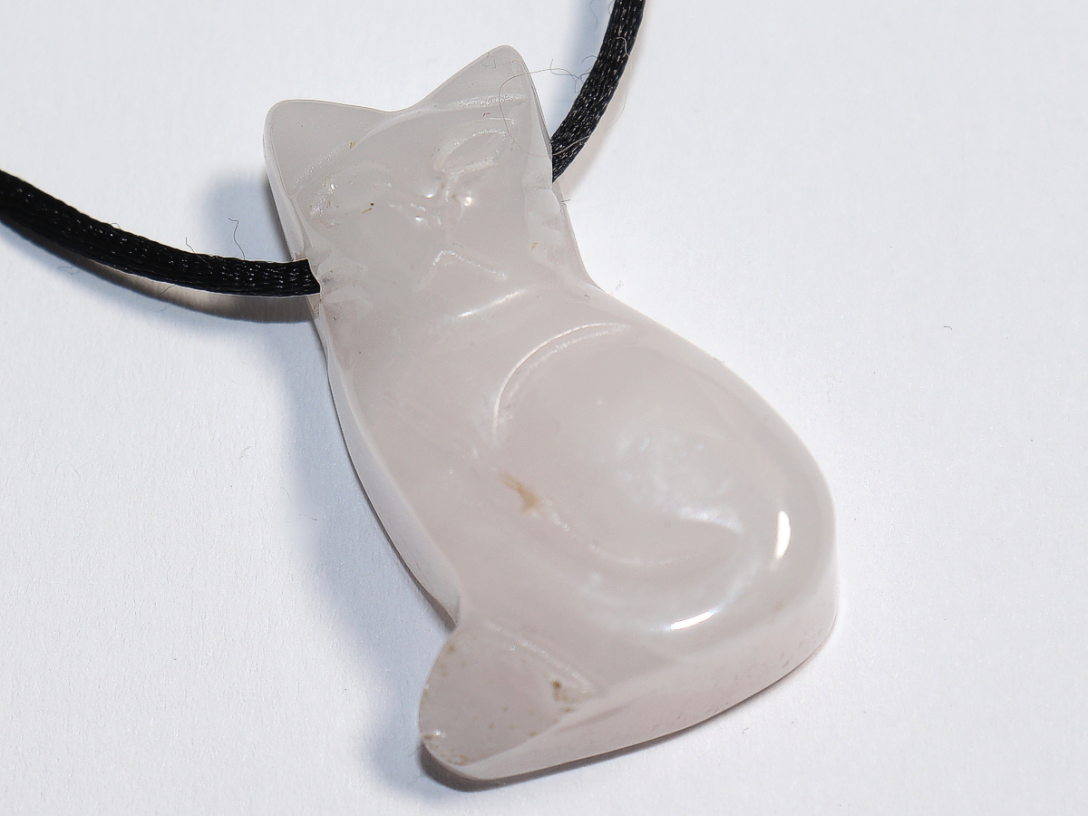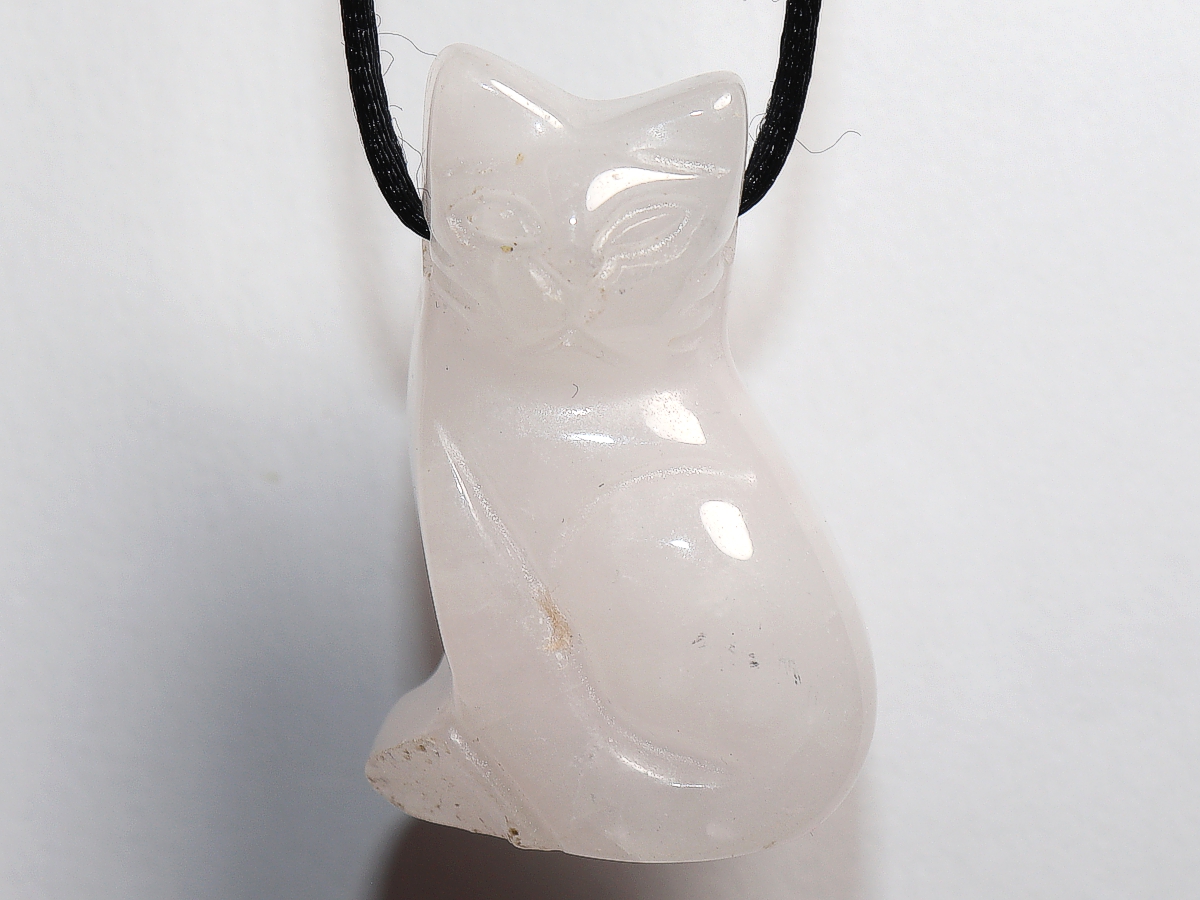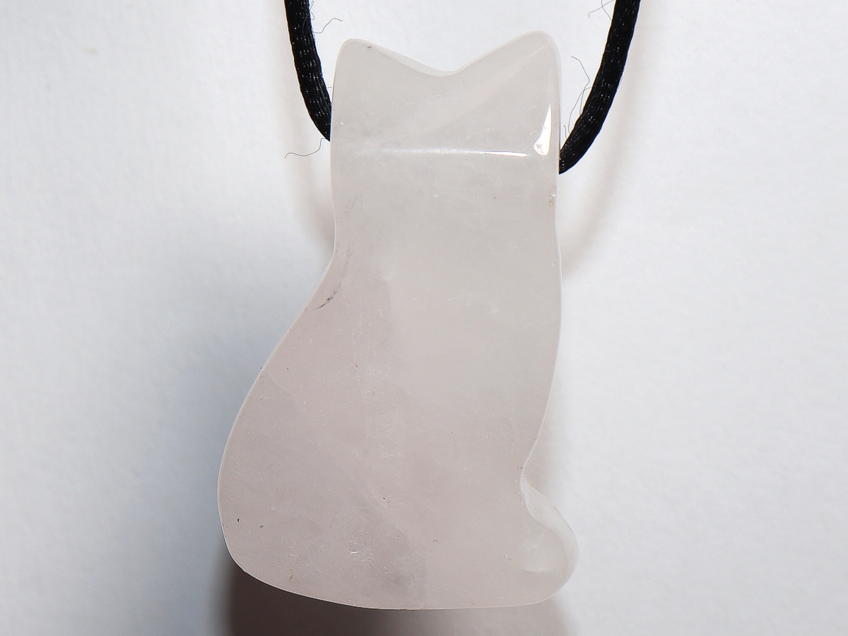 Die Halskette mit der Katze aus Rosenquarz wird nach Ihren Angaben individualisiert. Sie haben die Wahl zwischen einem schwarzen Band mit einem Verschluss aus Edelstahl oder einer Kette aus Silber 925.