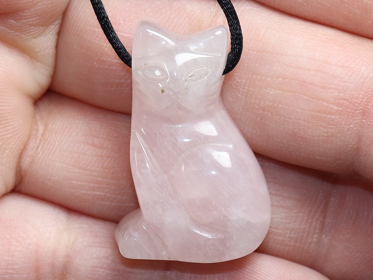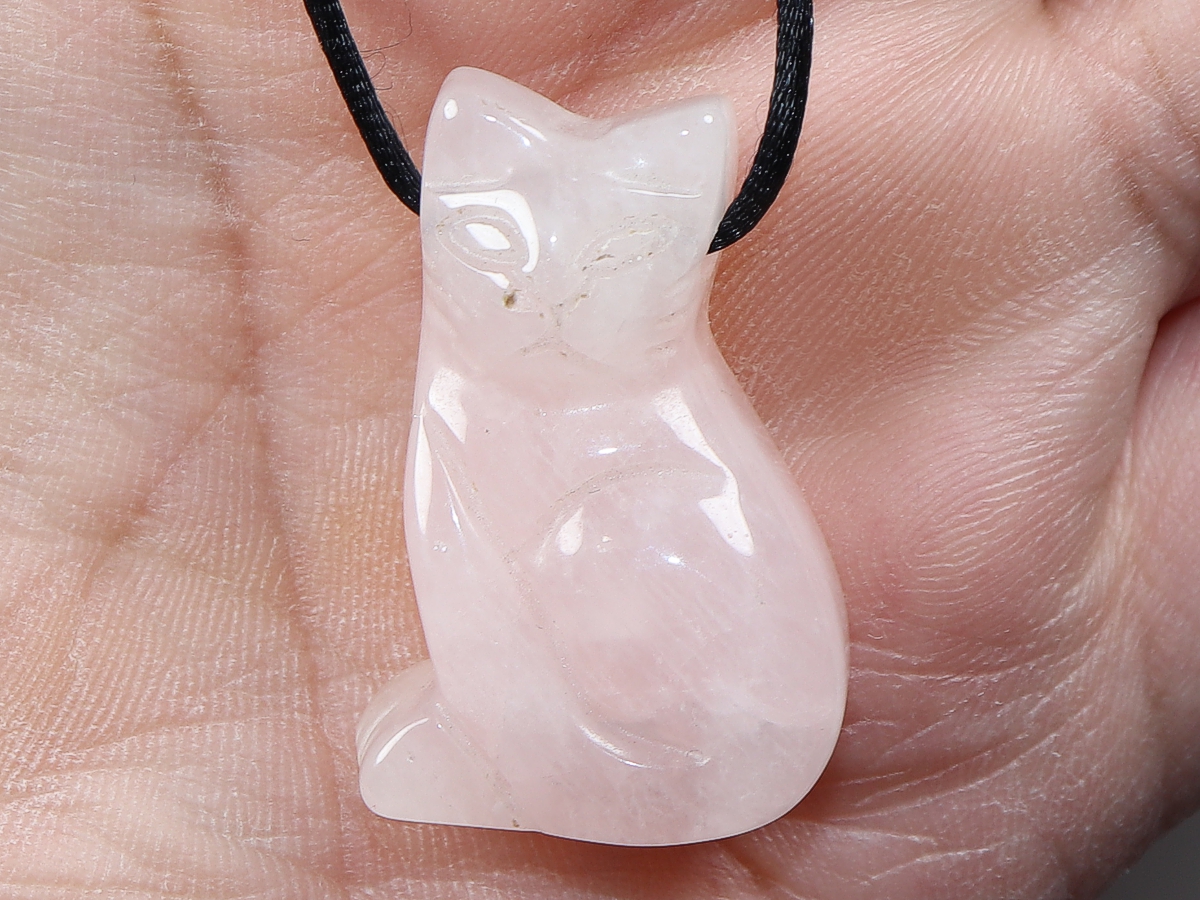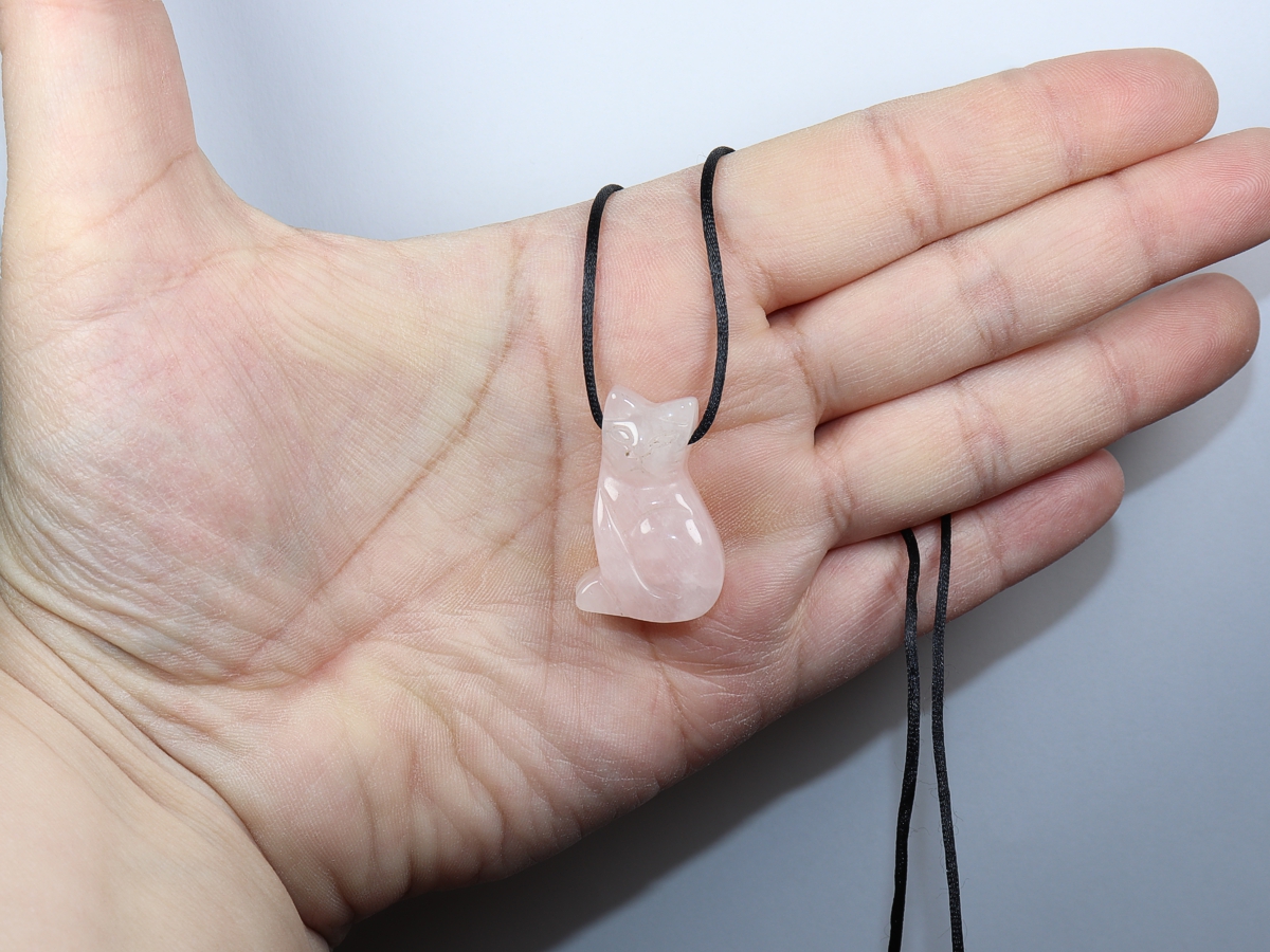Die Halskette mit der Katze aus Rosenquarz wird nach Ihren Angaben individualisiert. Sie haben die Wahl zwischen einem schwarzen Band mit einem Verschluss aus Edelstahl oder einer Kette aus Silber 925.
