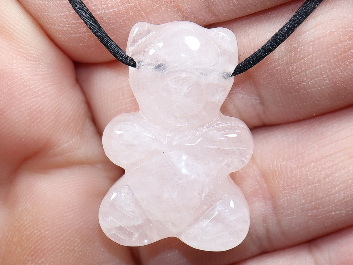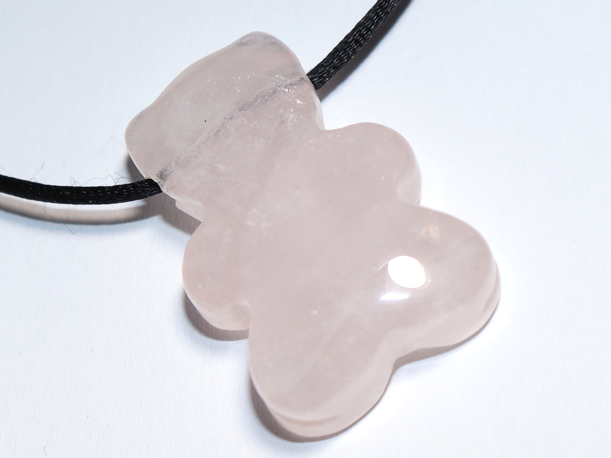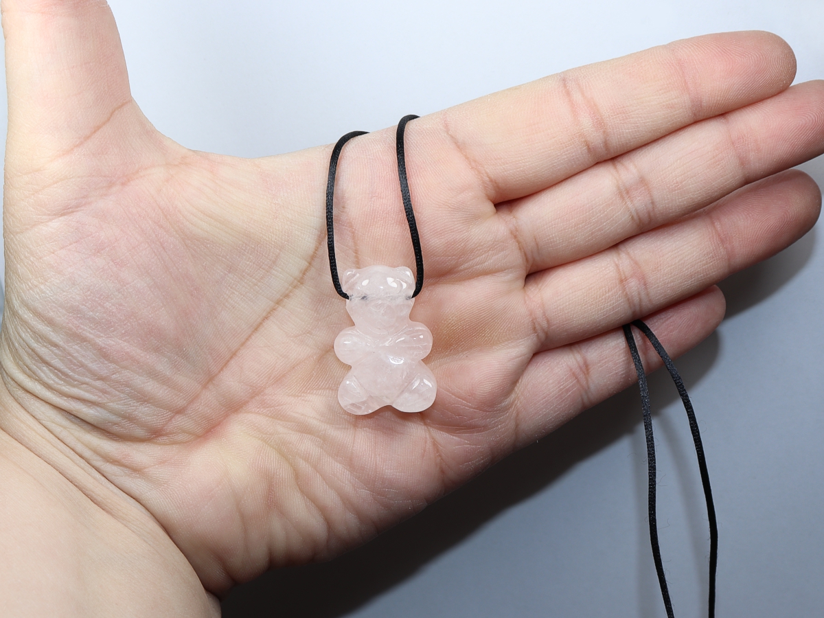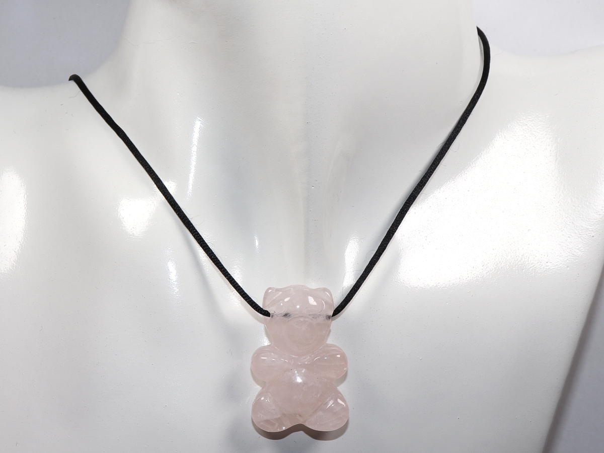 Die Halskette mit dem Bär aus Rosenquarz wird nach Ihren Angaben individualisiert. Sie haben die Wahl zwischen einem schwarzen Band mit einem Verschluss aus Edelstahl oder einer Kette aus Silber 925.
