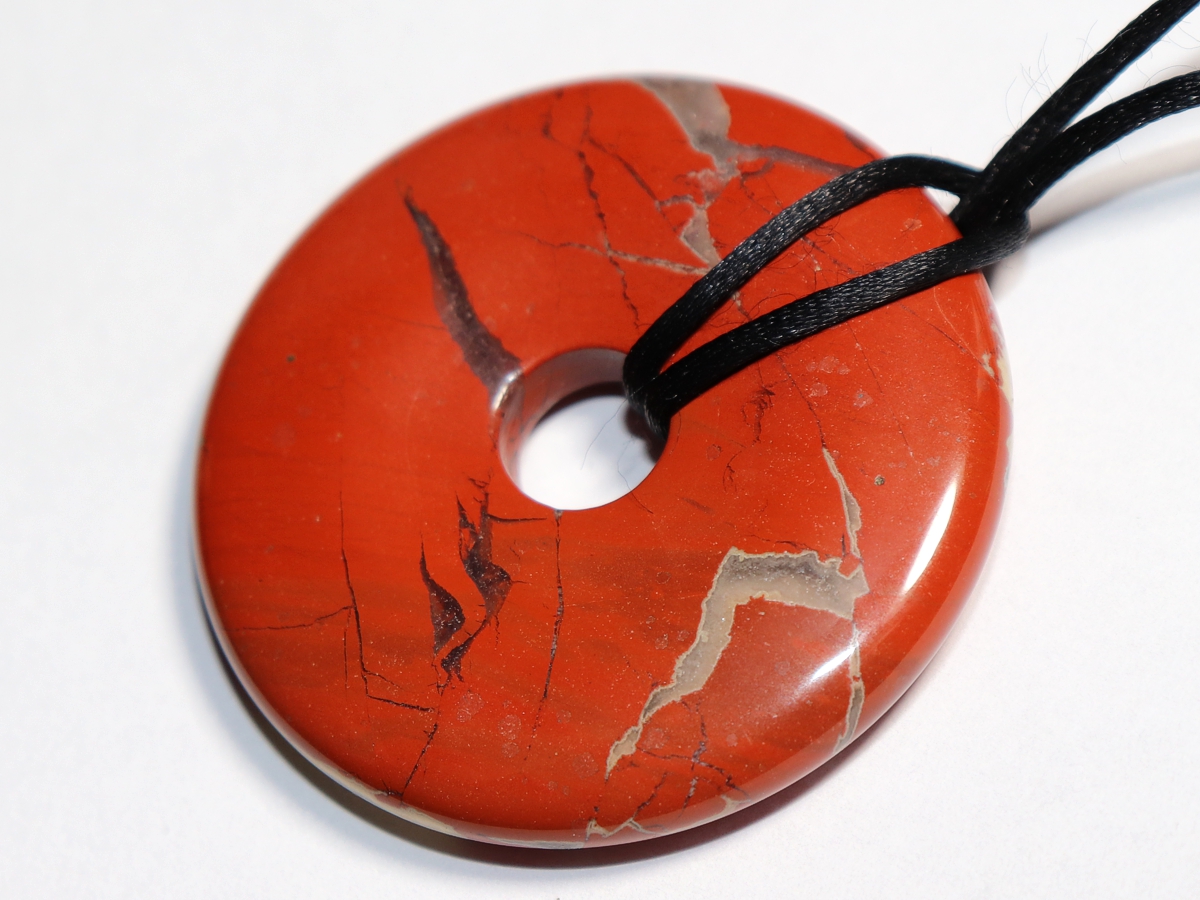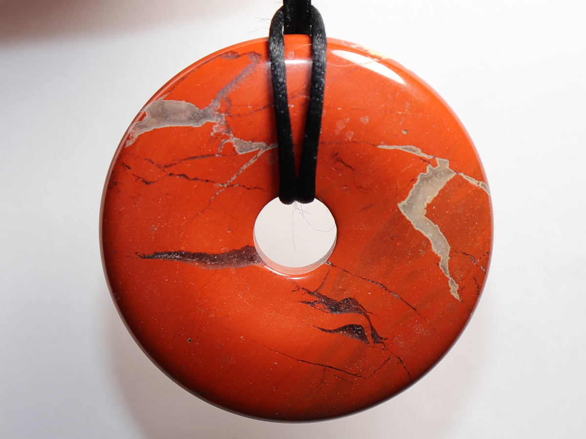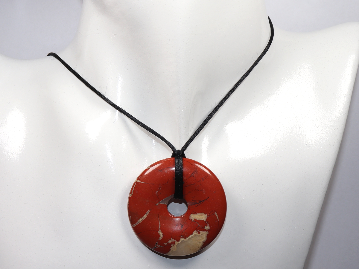 Die Halskette mit dem Donut aus rotem Jaspis und einem schwarzen Band wird nach Ihren Angaben individualisiert. Der Verschluss ist aus Edelstahl.