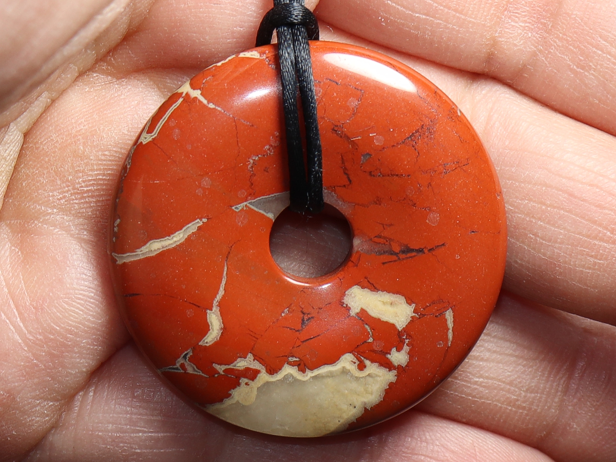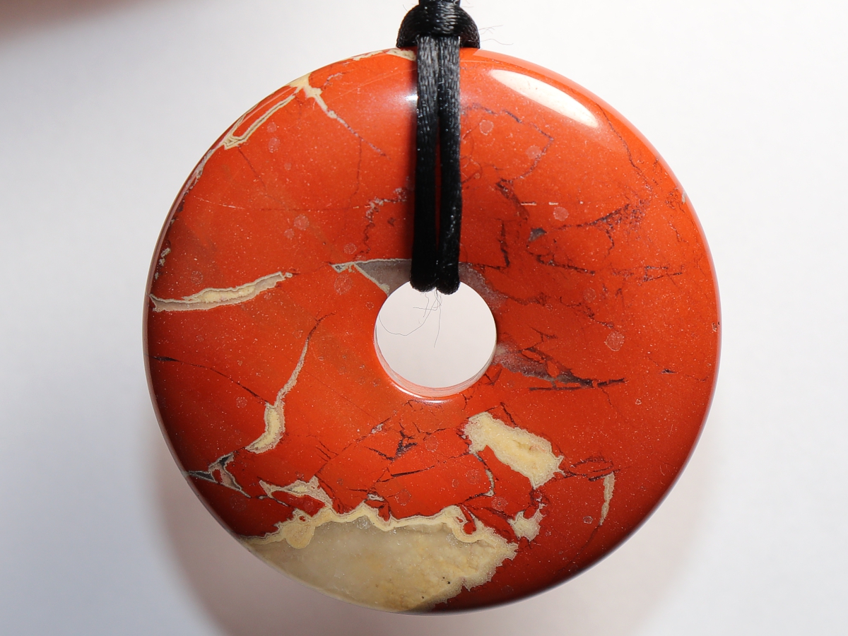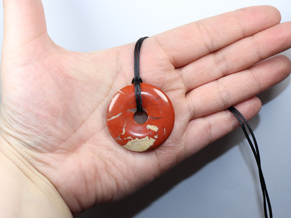 Die Halskette mit dem Donut aus rotem Jaspis und einem schwarzen Band wird nach Ihren Angaben individualisiert. Der Verschluss ist aus Edelstahl.