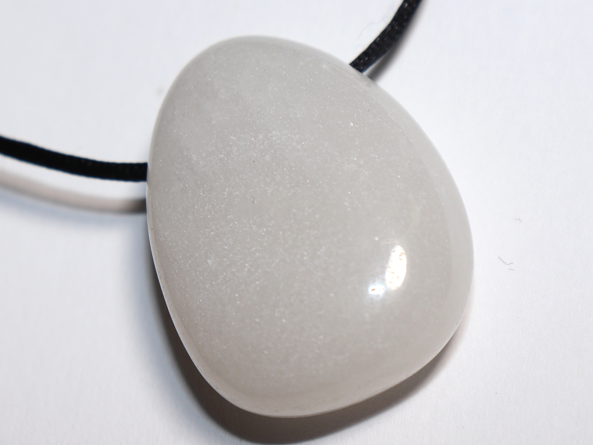 Die Halskette mit Schneequarz wird nach Ihren Angaben individualisiert. Sie haben die Wahl zwischen einem schwarzen Band mit einem Verschluss aus Edelstahl oder einer Kette aus Silber 925.