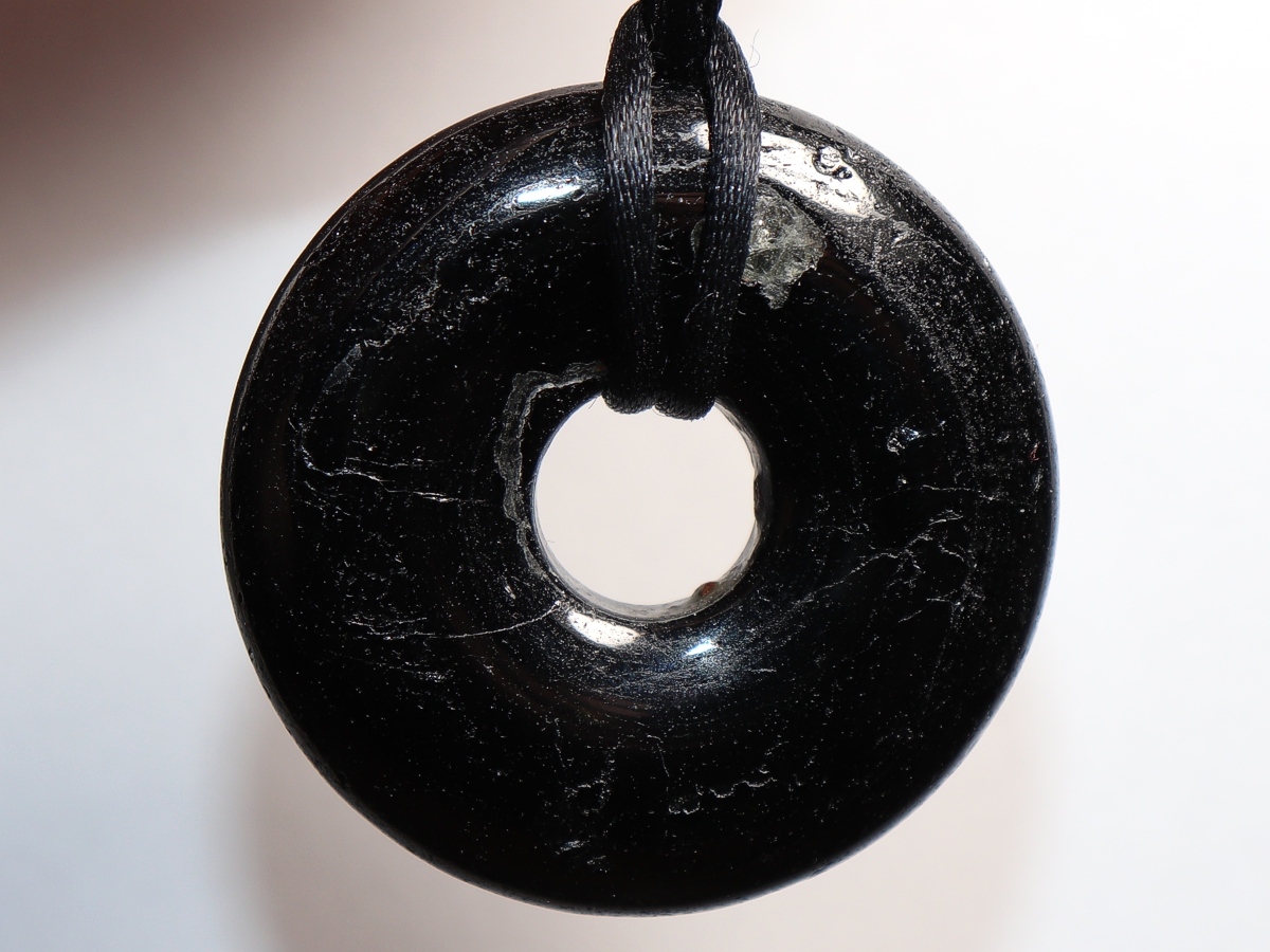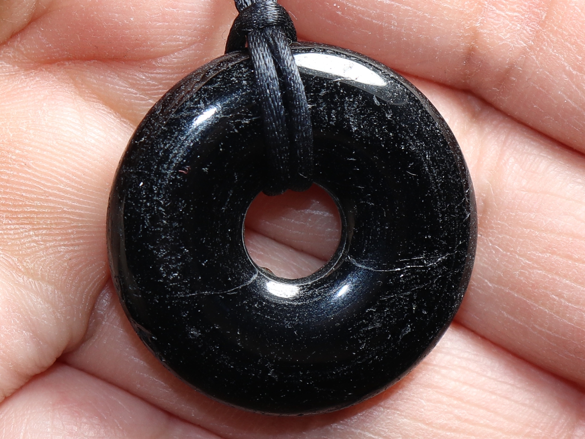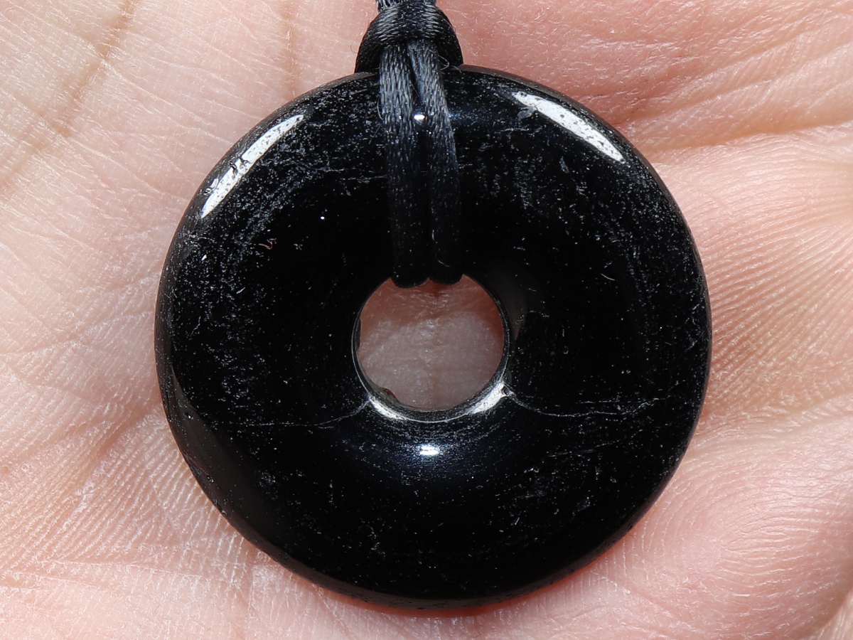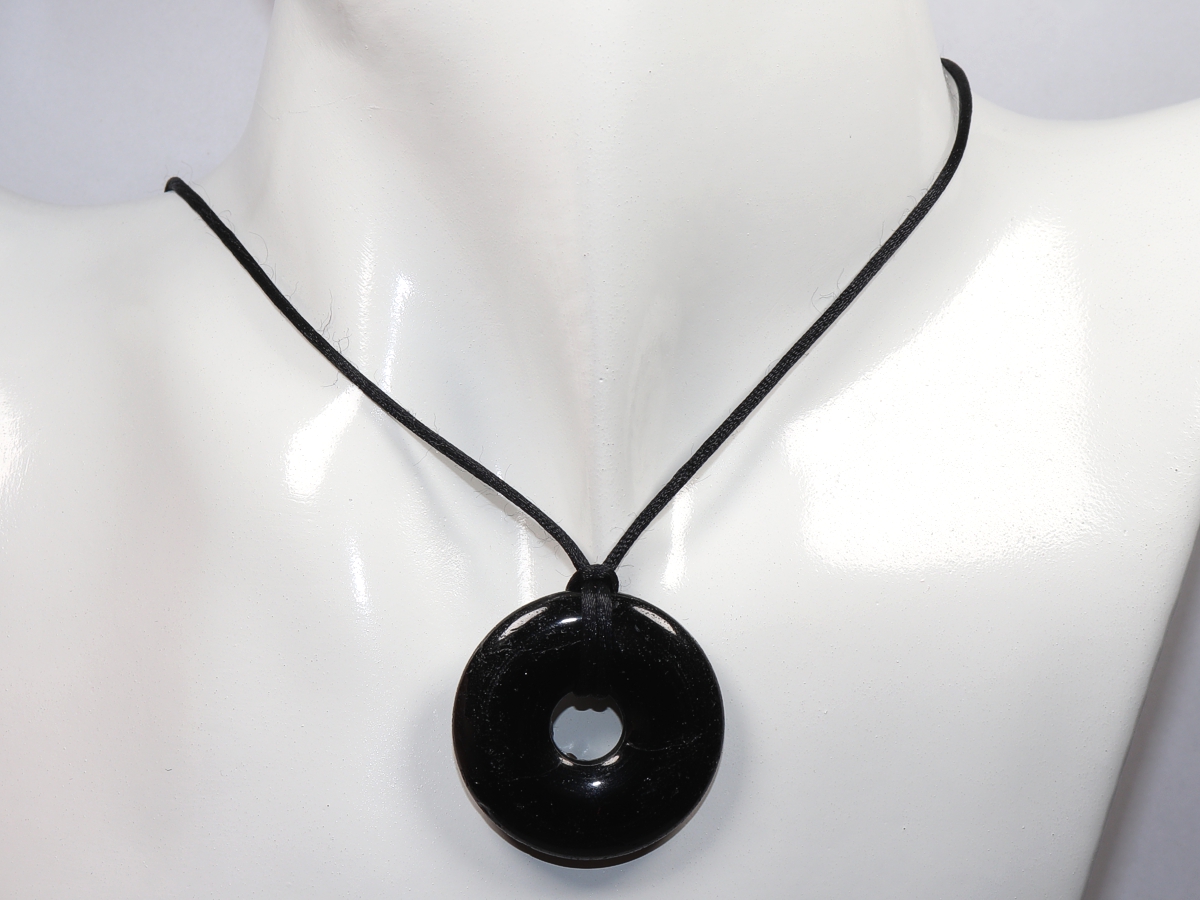 Die Halskette mit dem Donut aus schwarzer Turmalin (Schörl) und einem schwarzen Band wird nach Ihren Angaben individualisiert. Der Verschluss ist aus Edelstahl.