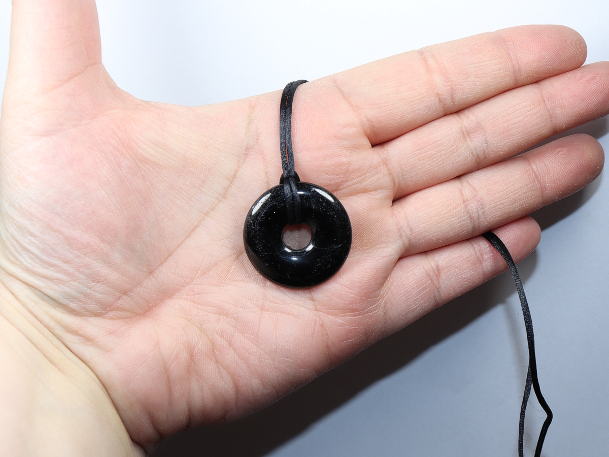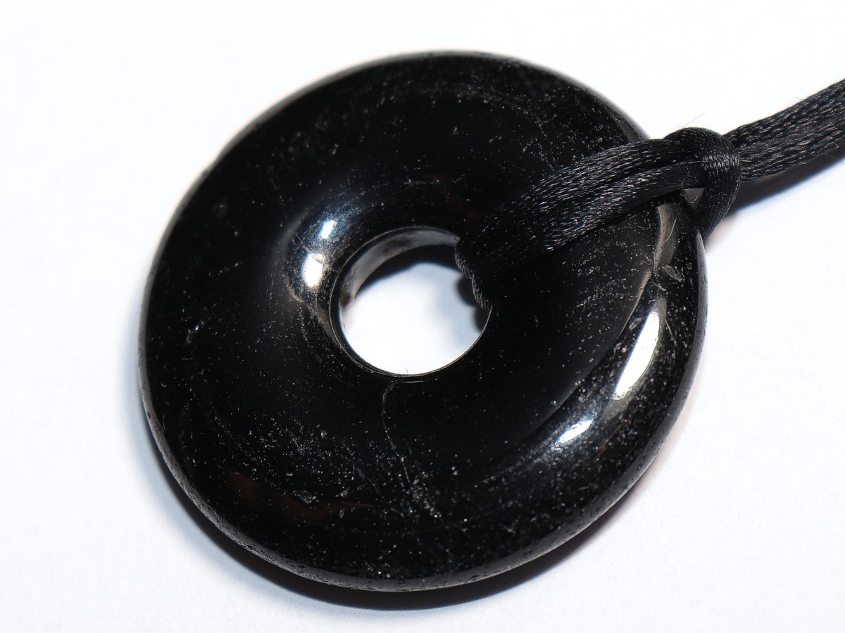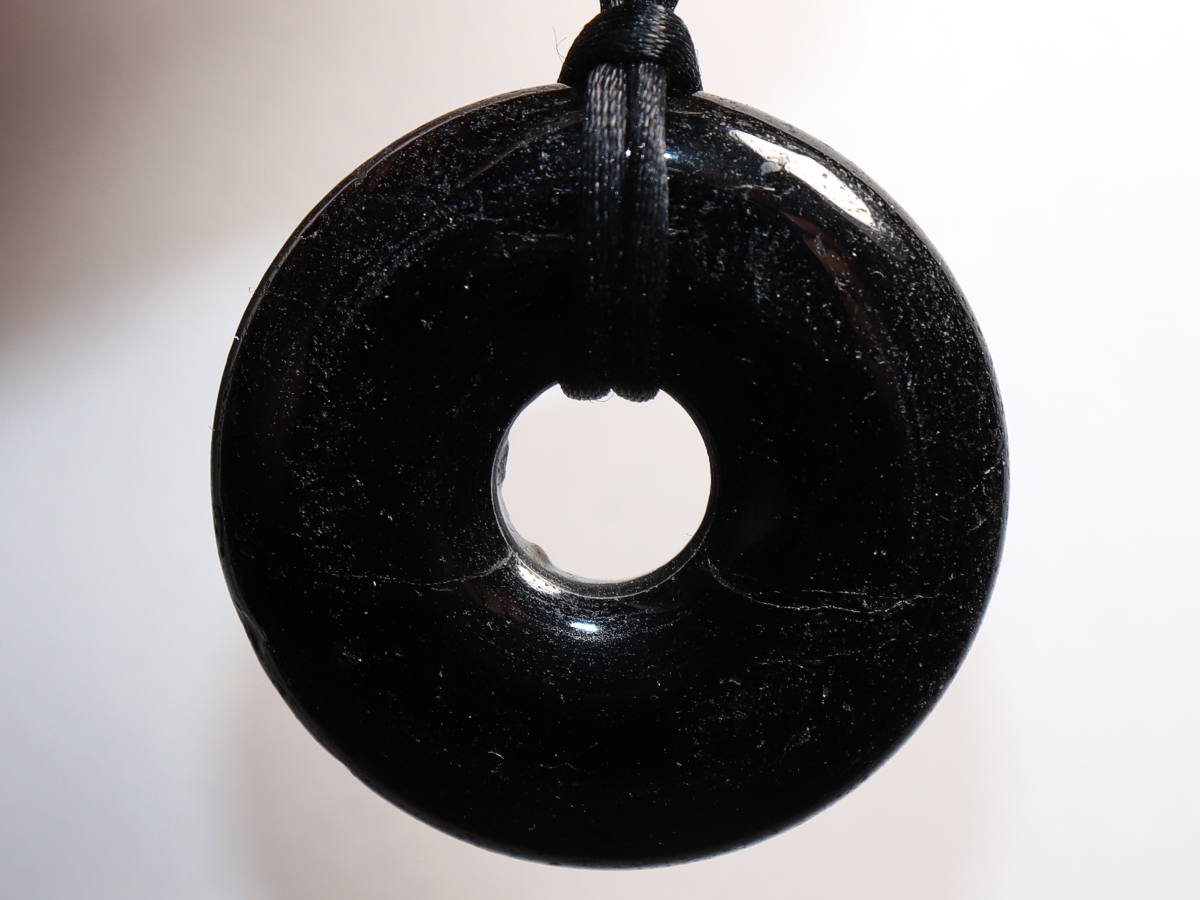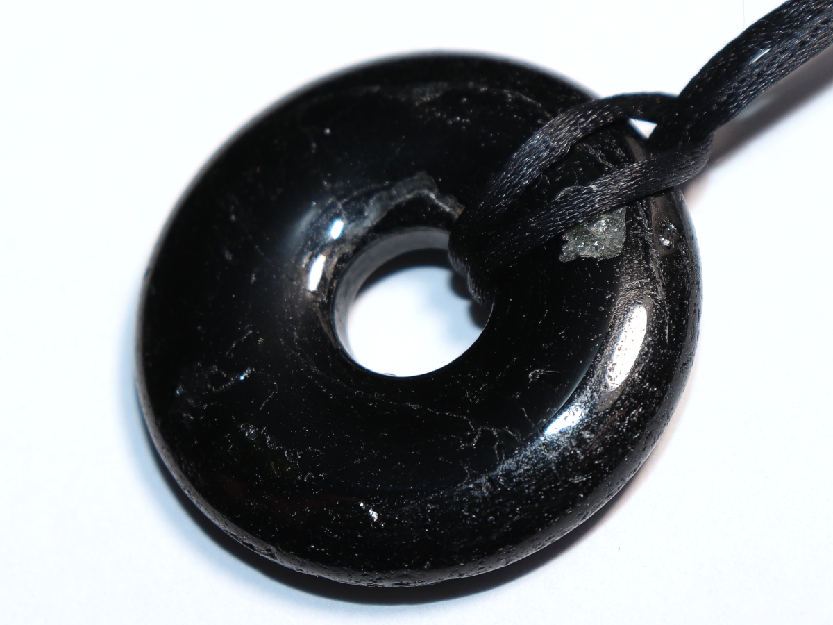 Die Halskette mit dem Donut aus schwarzer Turmalin (Schörl) und einem schwarzen Band wird nach Ihren Angaben individualisiert. Der Verschluss ist aus Edelstahl.