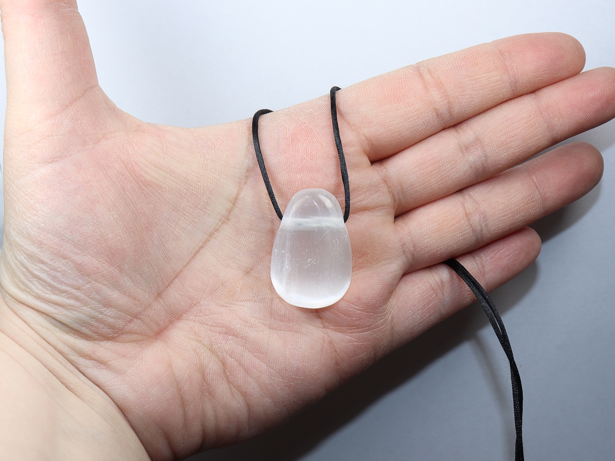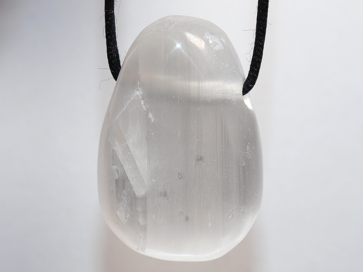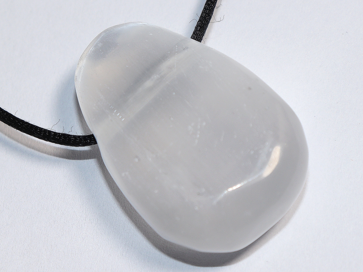 Die Halskette mit Selenit wird nach Ihren Angaben individualisiert. Sie haben die Wahl zwischen einem schwarzen Band mit einem Verschluss aus Edelstahl oder einer Kette aus Silber 925.