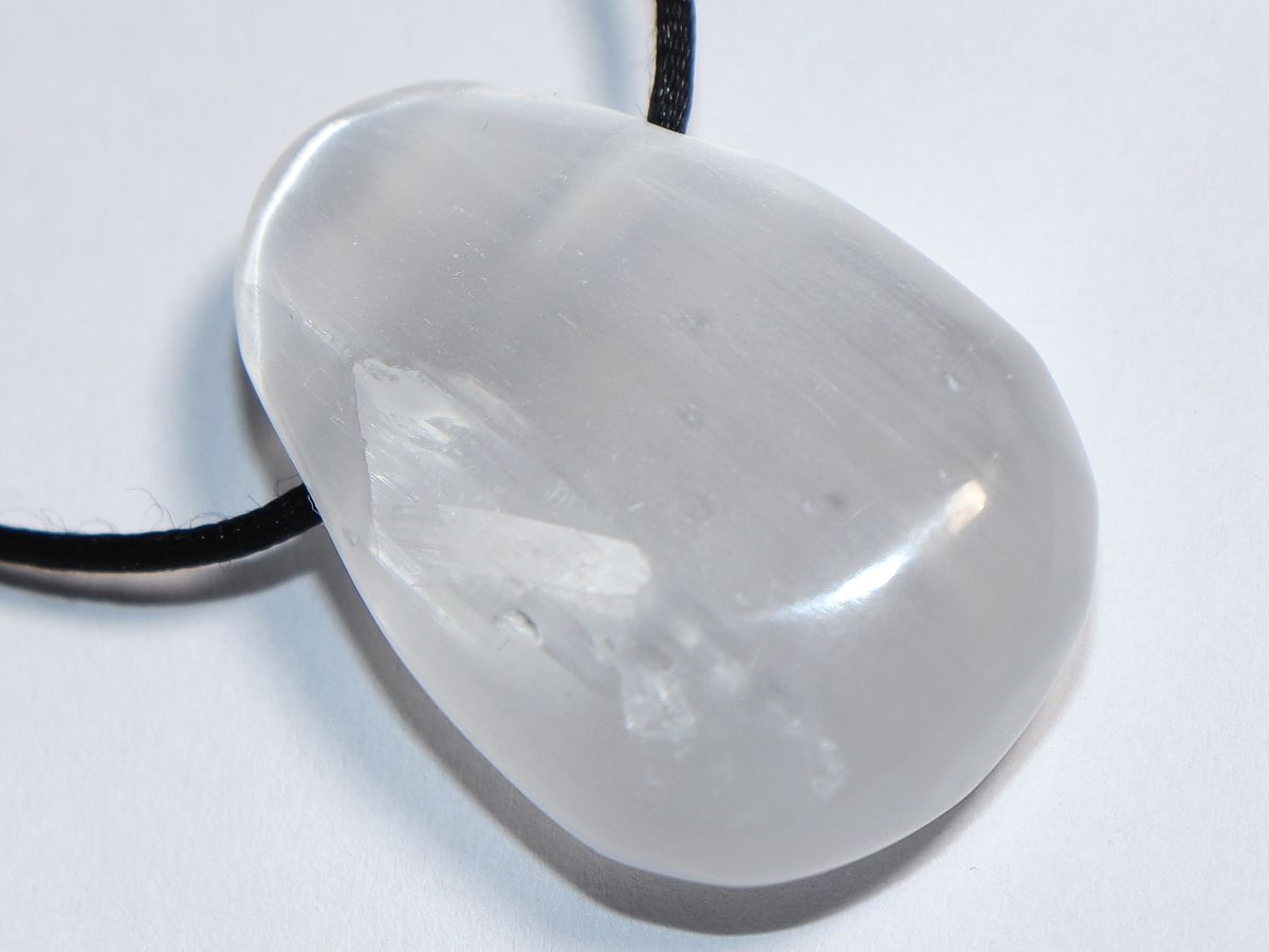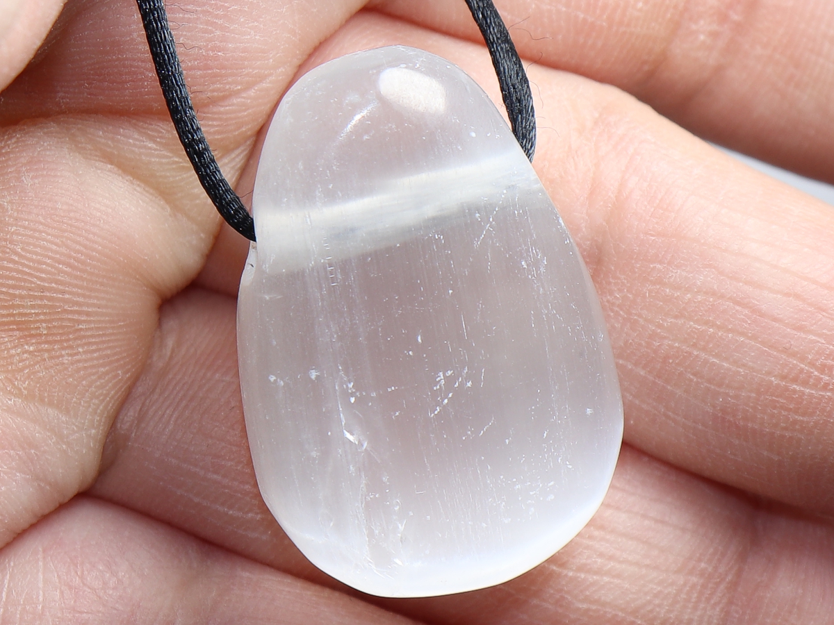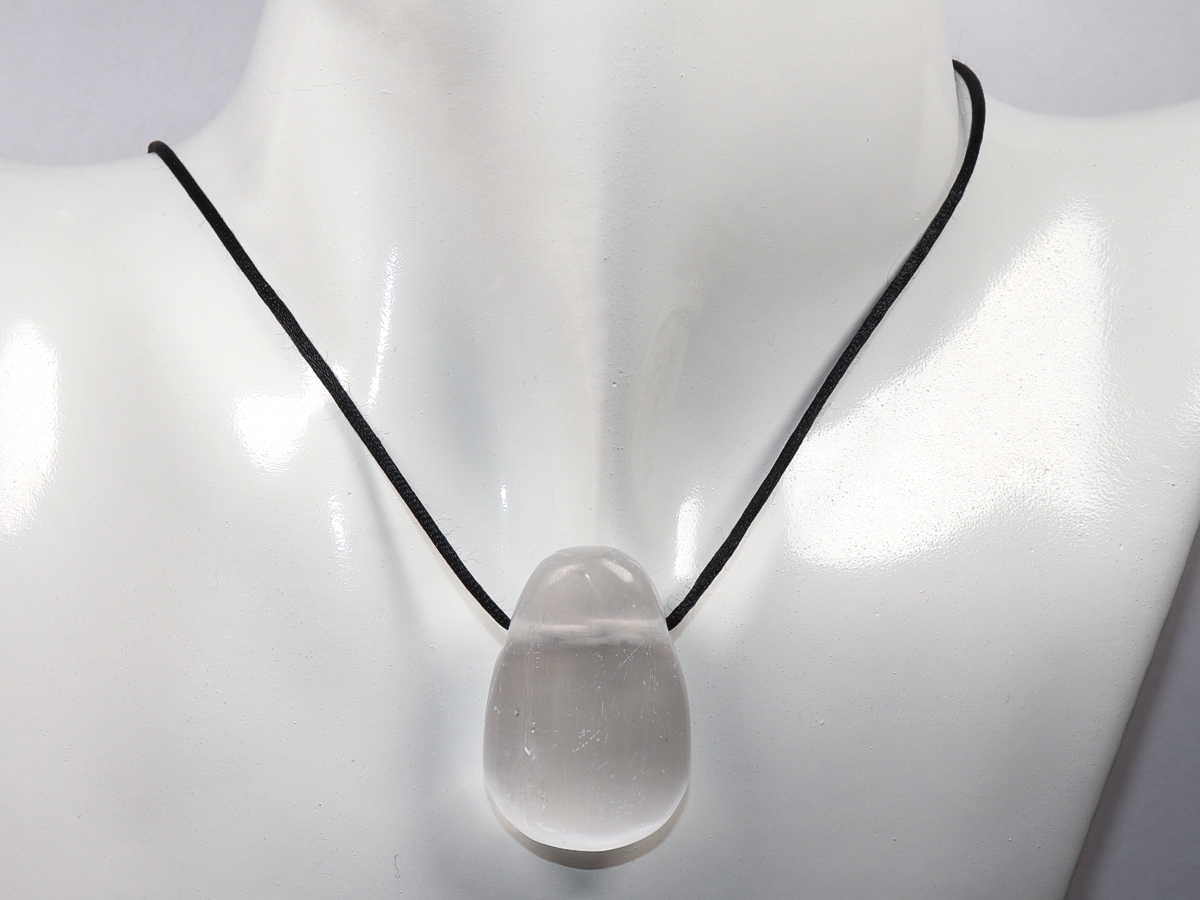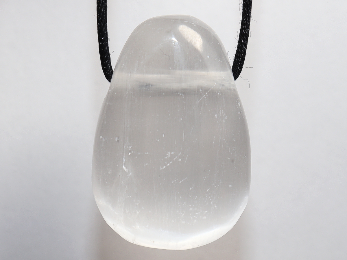 Die Halskette mit Selenit wird nach Ihren Angaben individualisiert. Sie haben die Wahl zwischen einem schwarzen Band mit einem Verschluss aus Edelstahl oder einer Kette aus Silber 925.