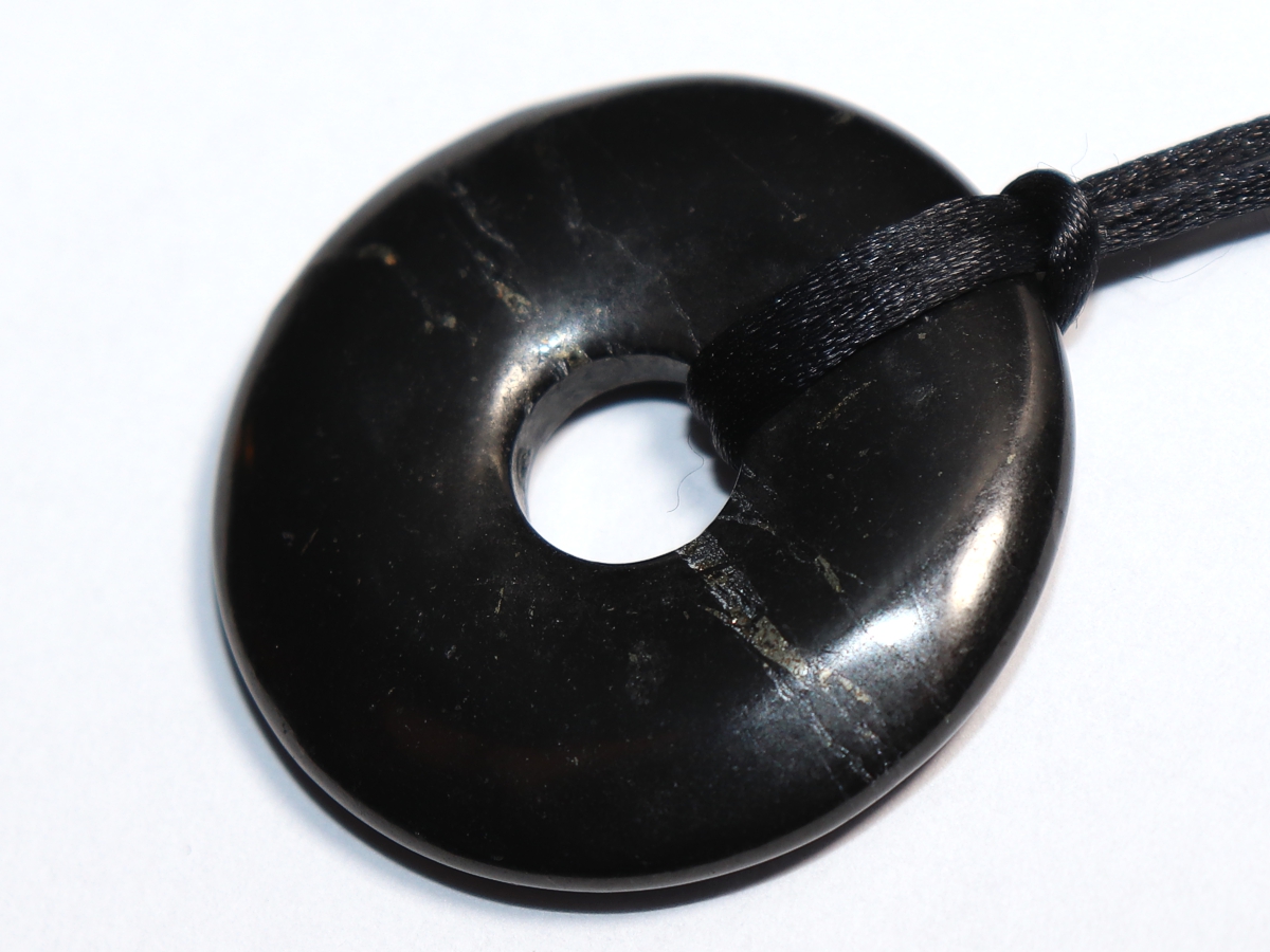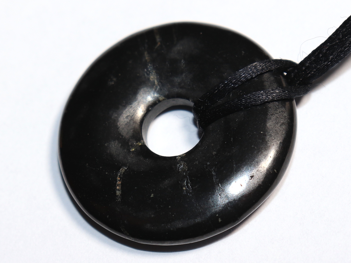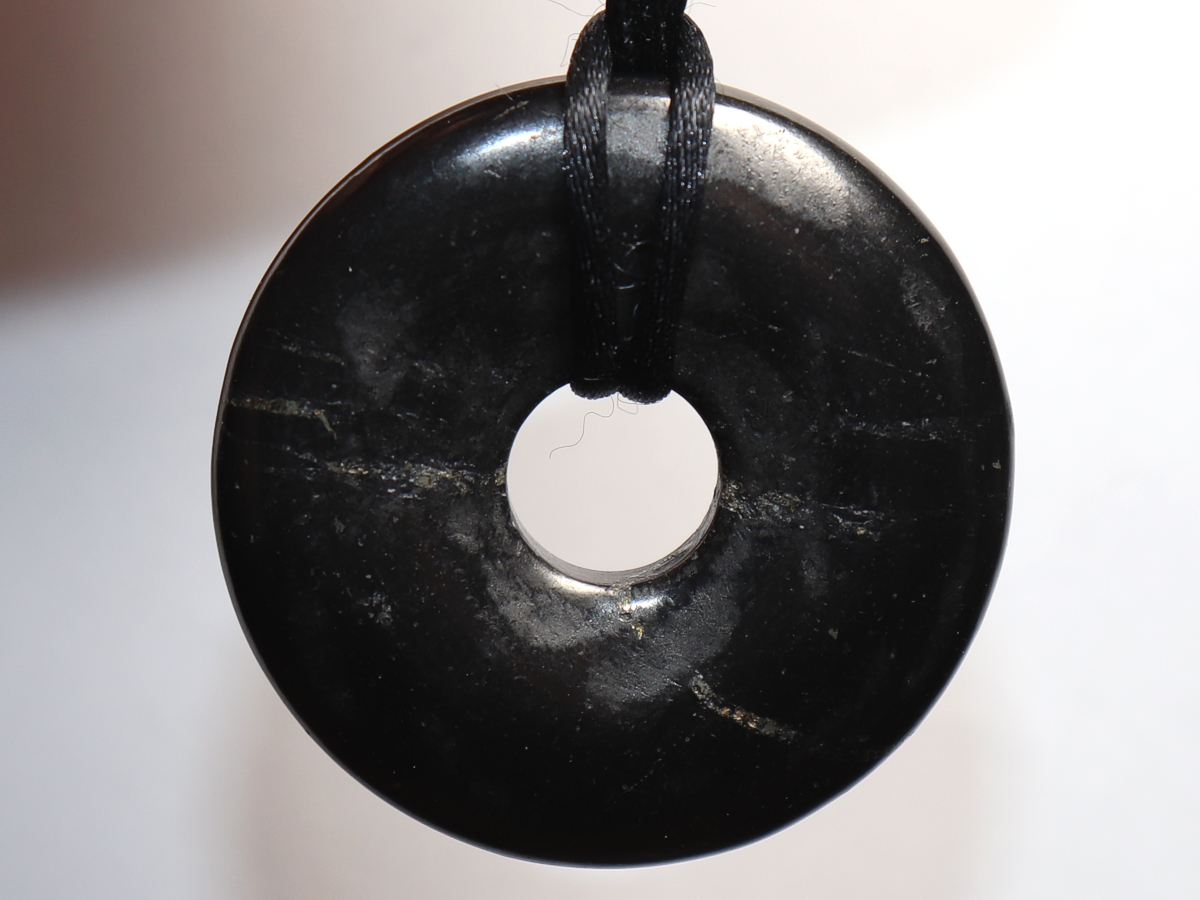 Die Halskette mit dem Donut aus Shungit und einem schwarzen Band wird nach Ihren Angaben individualisiert. Der Verschluss ist aus Edelstahl.