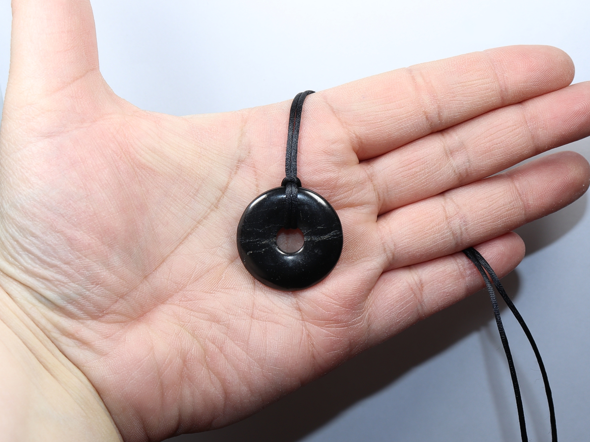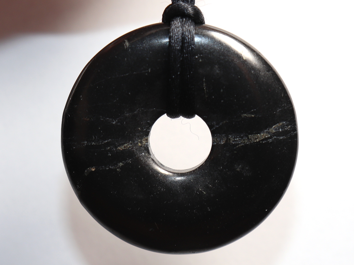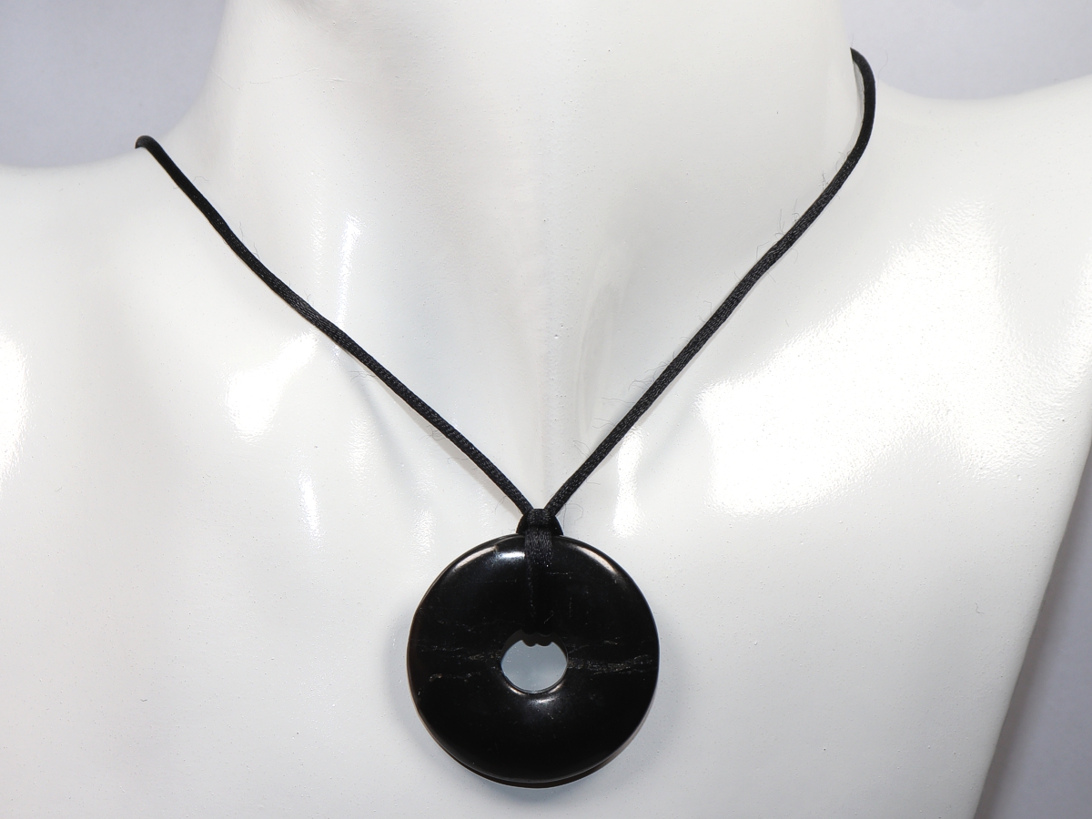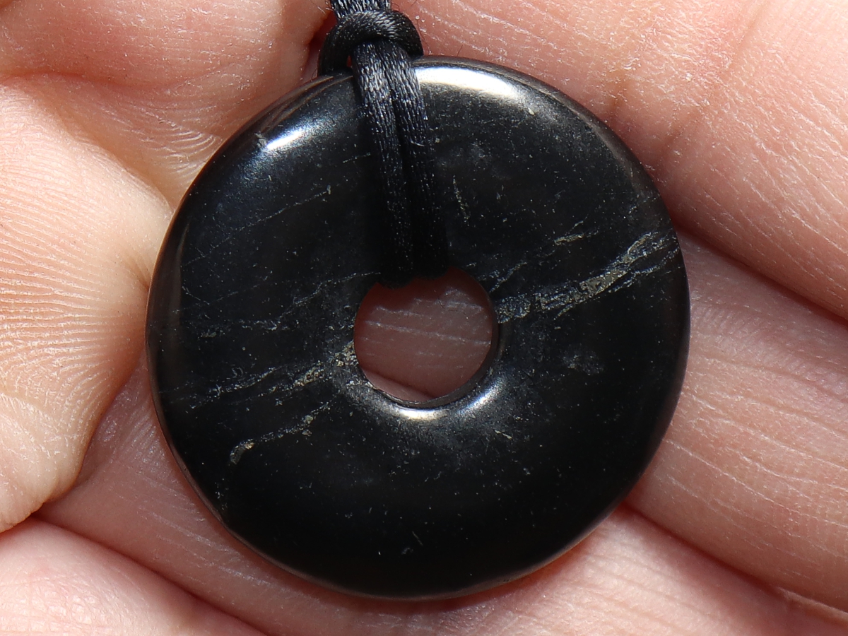Die Halskette mit dem Donut aus Shungit und einem schwarzen Band wird nach Ihren Angaben individualisiert. Der Verschluss ist aus Edelstahl.
