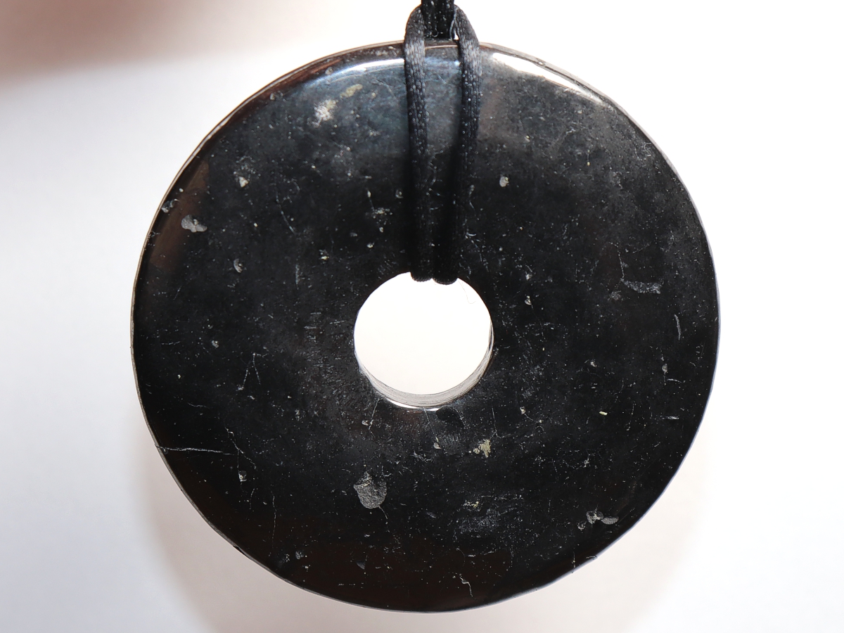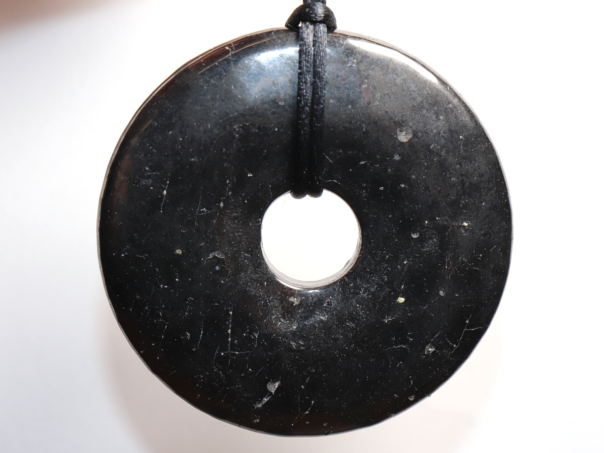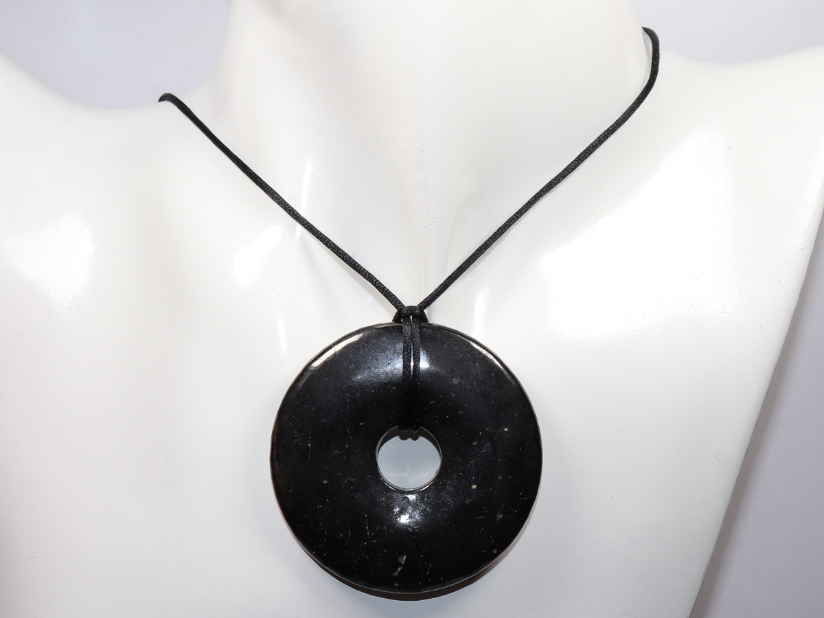 Die Halskette mit dem Donut aus Shungit und einem schwarzen Band wird nach Ihren Angaben individualisiert. Der Verschluss ist aus Edelstahl.