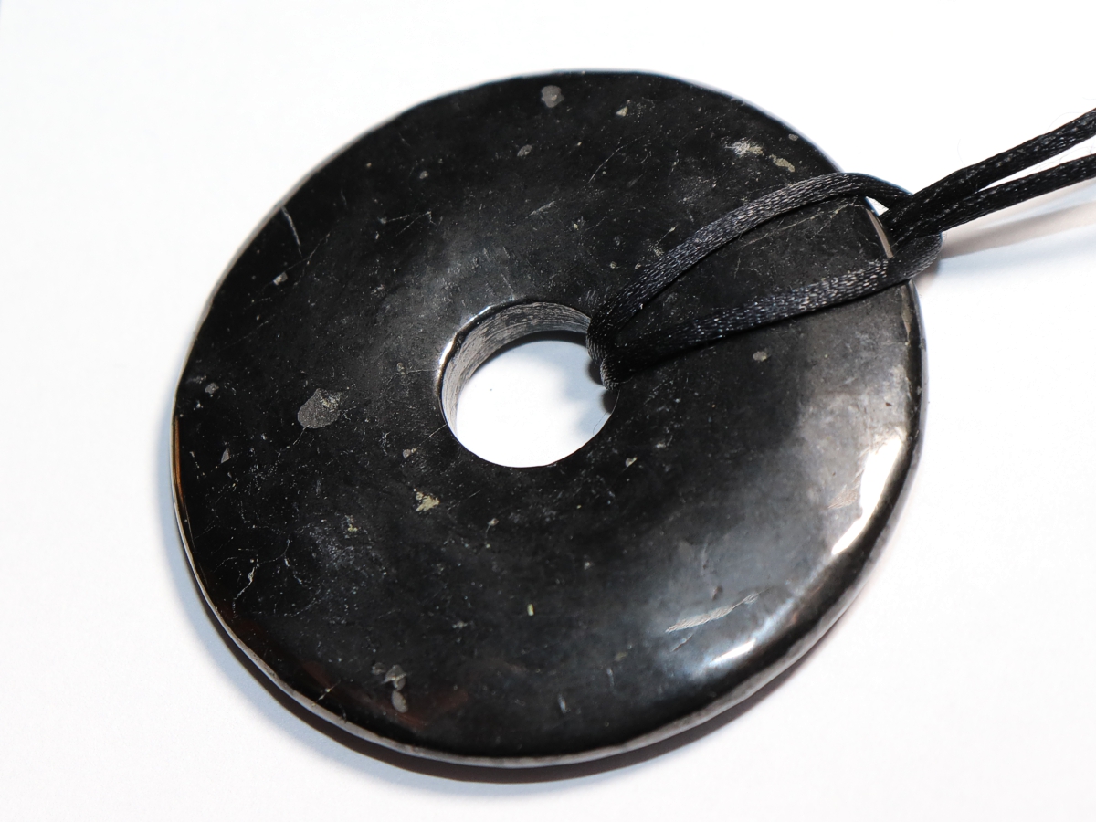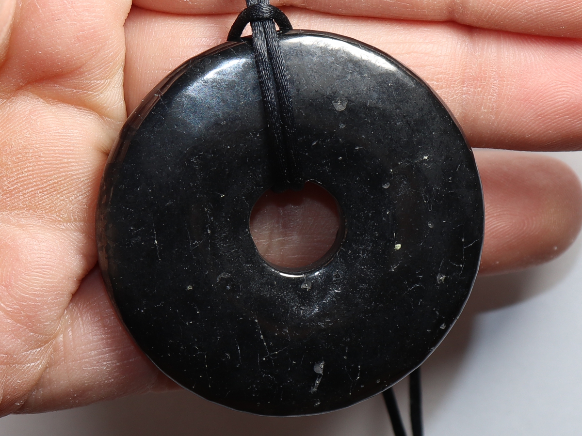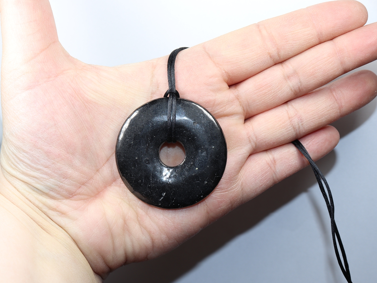 Die Halskette mit dem Donut aus Shungit und einem schwarzen Band wird nach Ihren Angaben individualisiert. Der Verschluss ist aus Edelstahl.