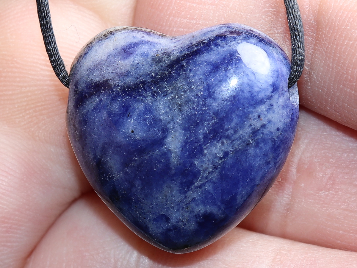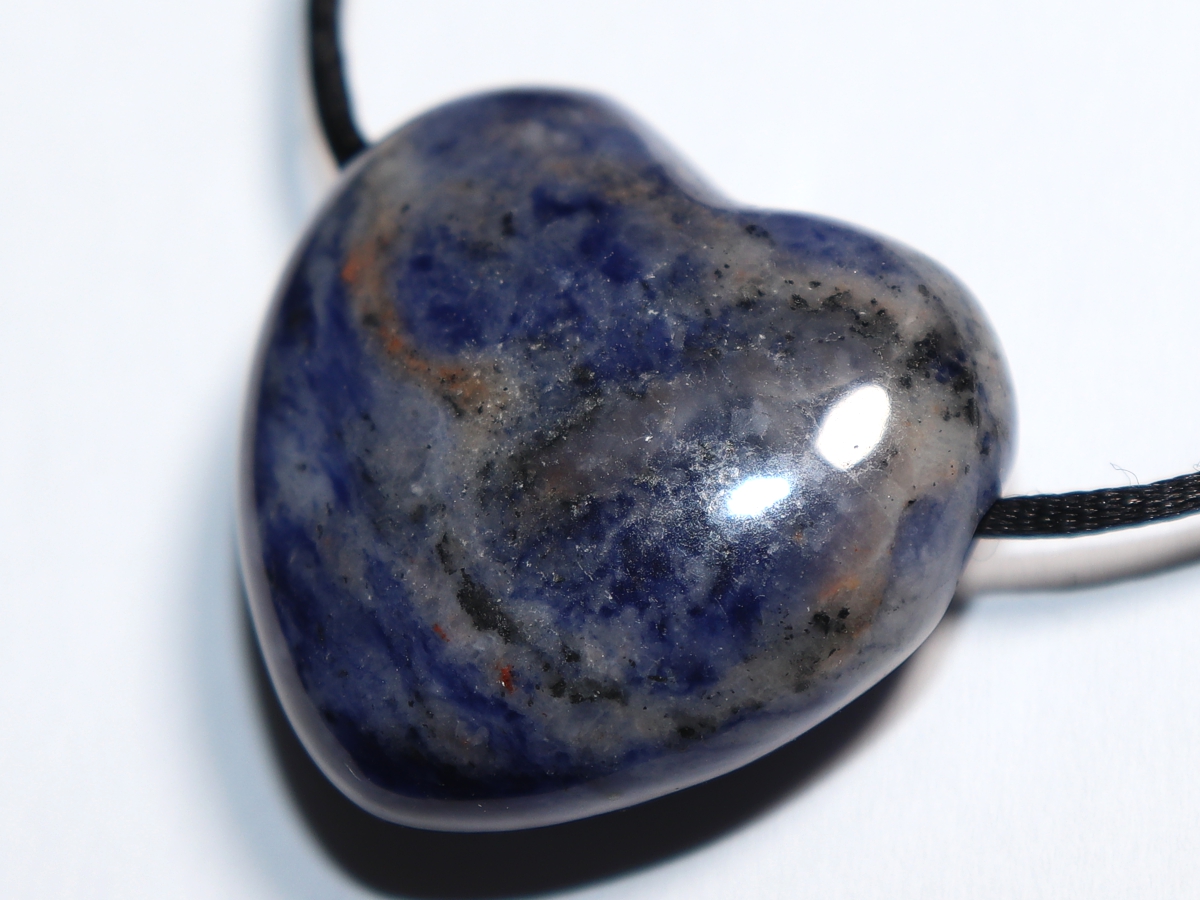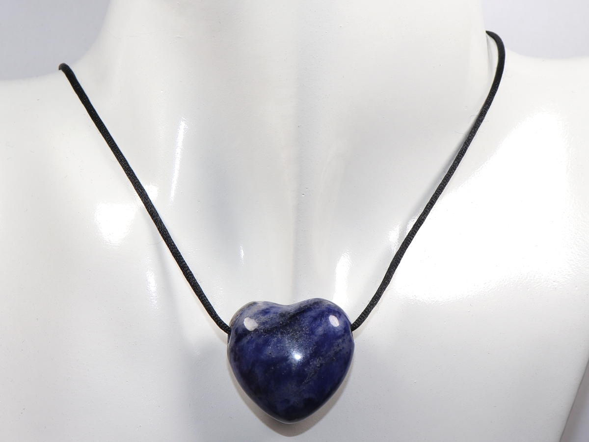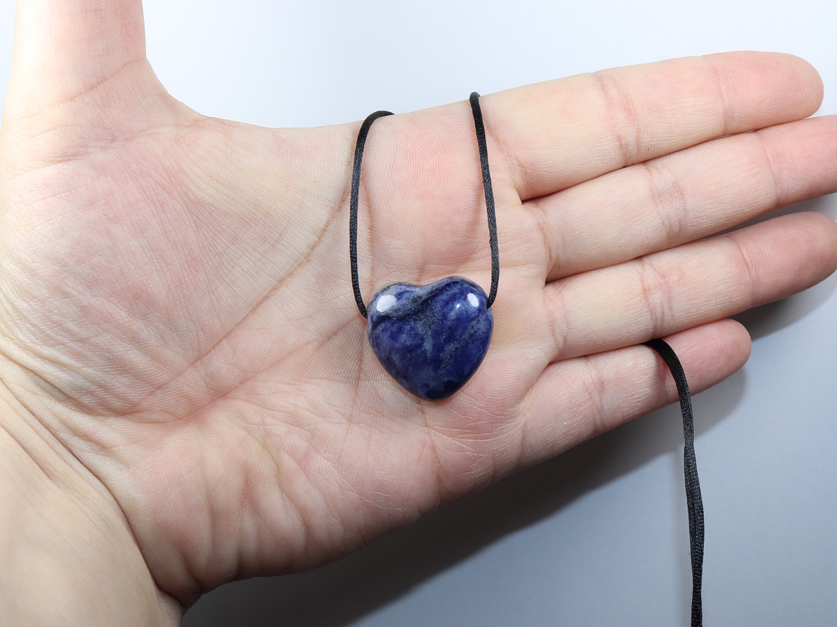 Die Halskette mit dem Herz aus Sodalith wird nach Ihren Angaben individualisiert. Sie haben die Wahl zwischen einem schwarzen Band mit einem Verschluss aus Edelstahl oder einer Kette aus Silber 925.