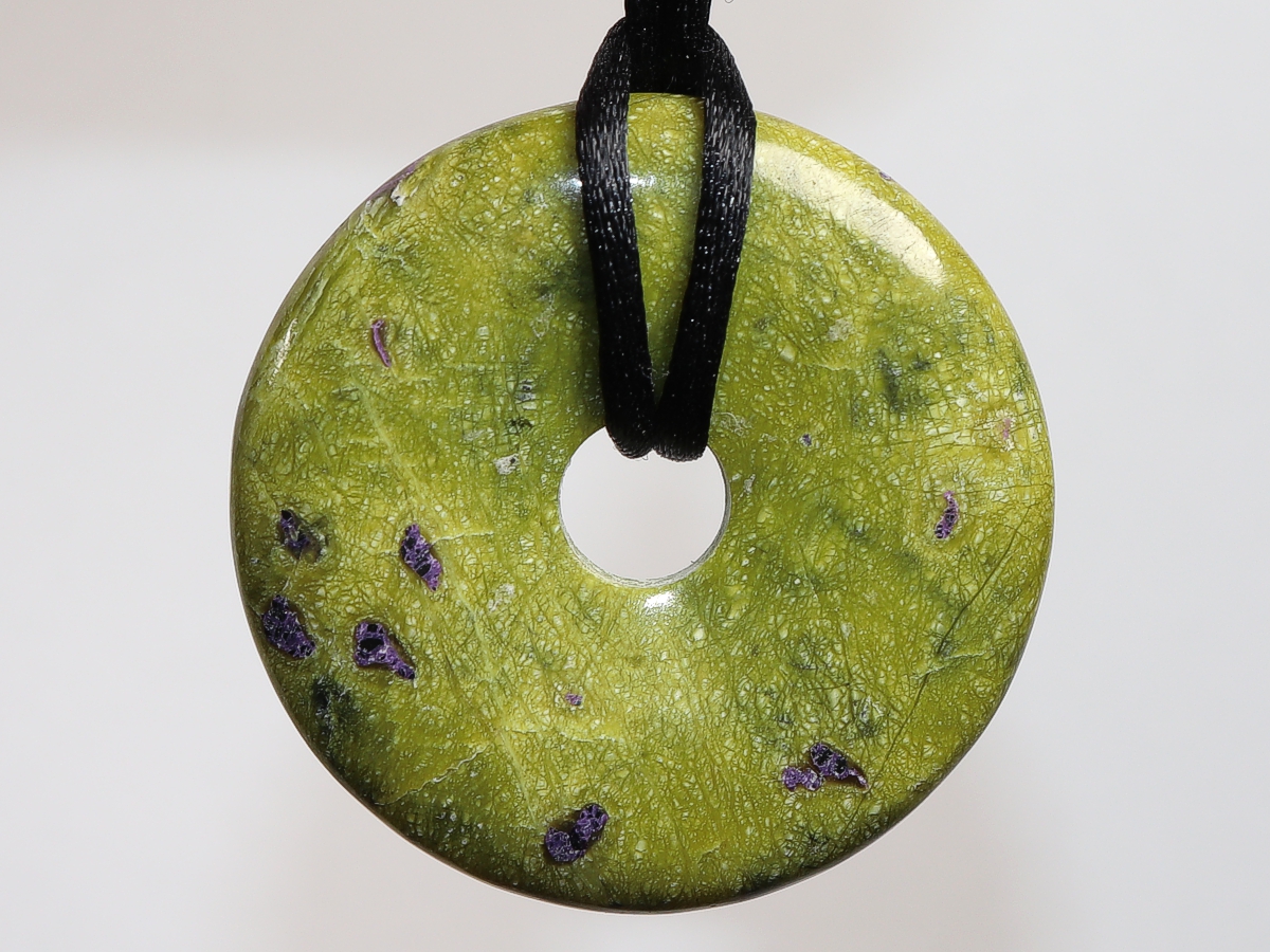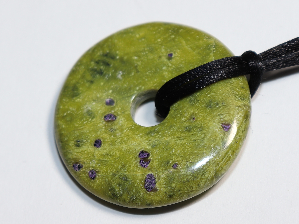 Die Halskette mit dem Donut aus Stichtit in Serpentin und einem schwarzen Band wird nach Ihren Angaben individualisiert. Der Verschluss ist aus Edelstahl.