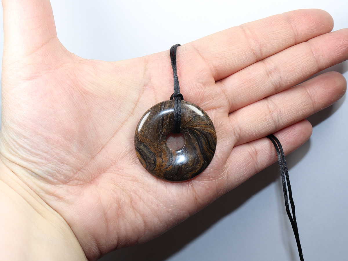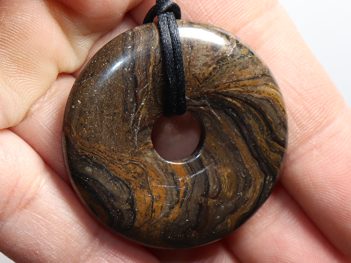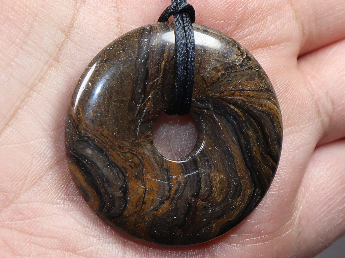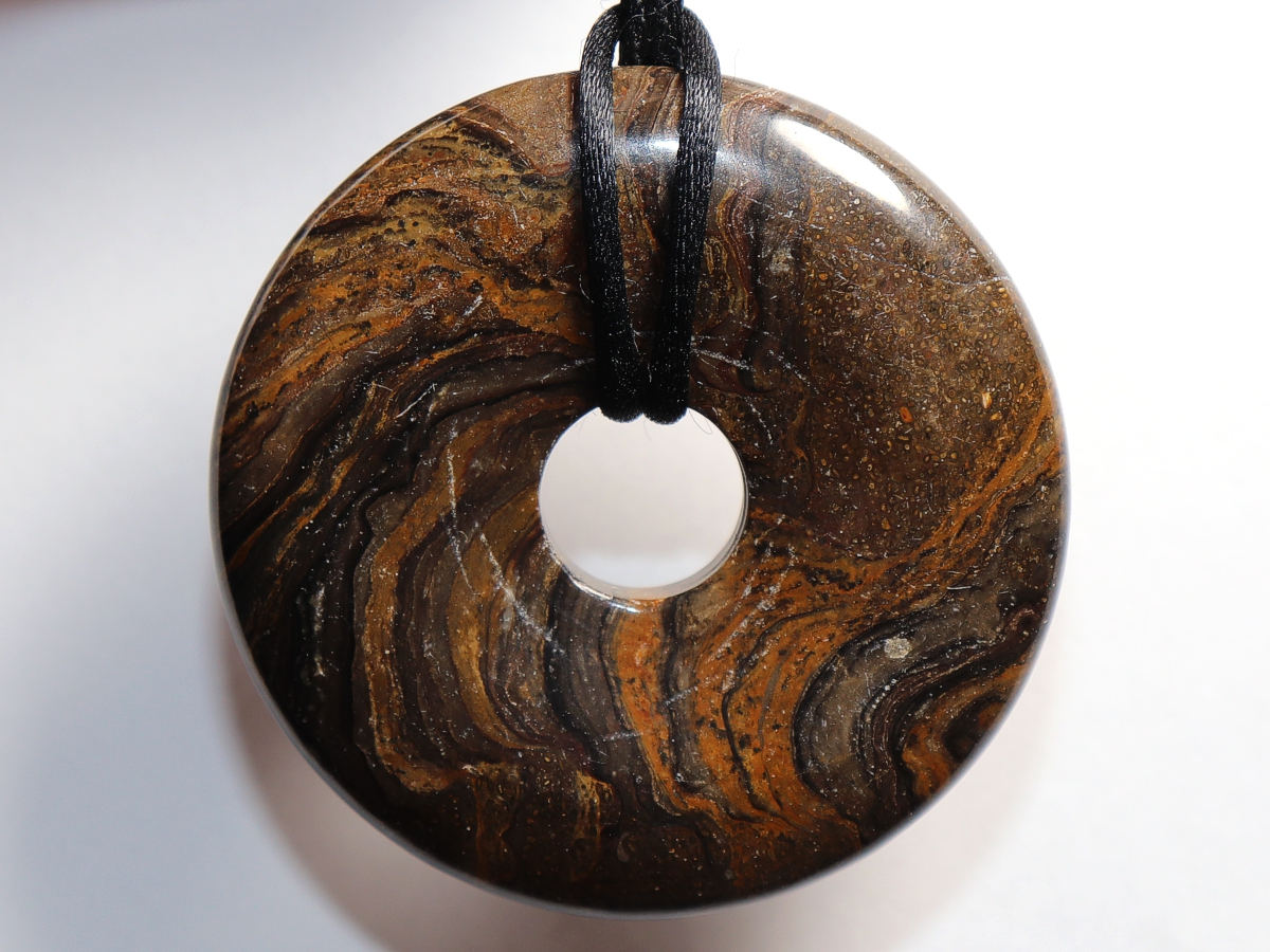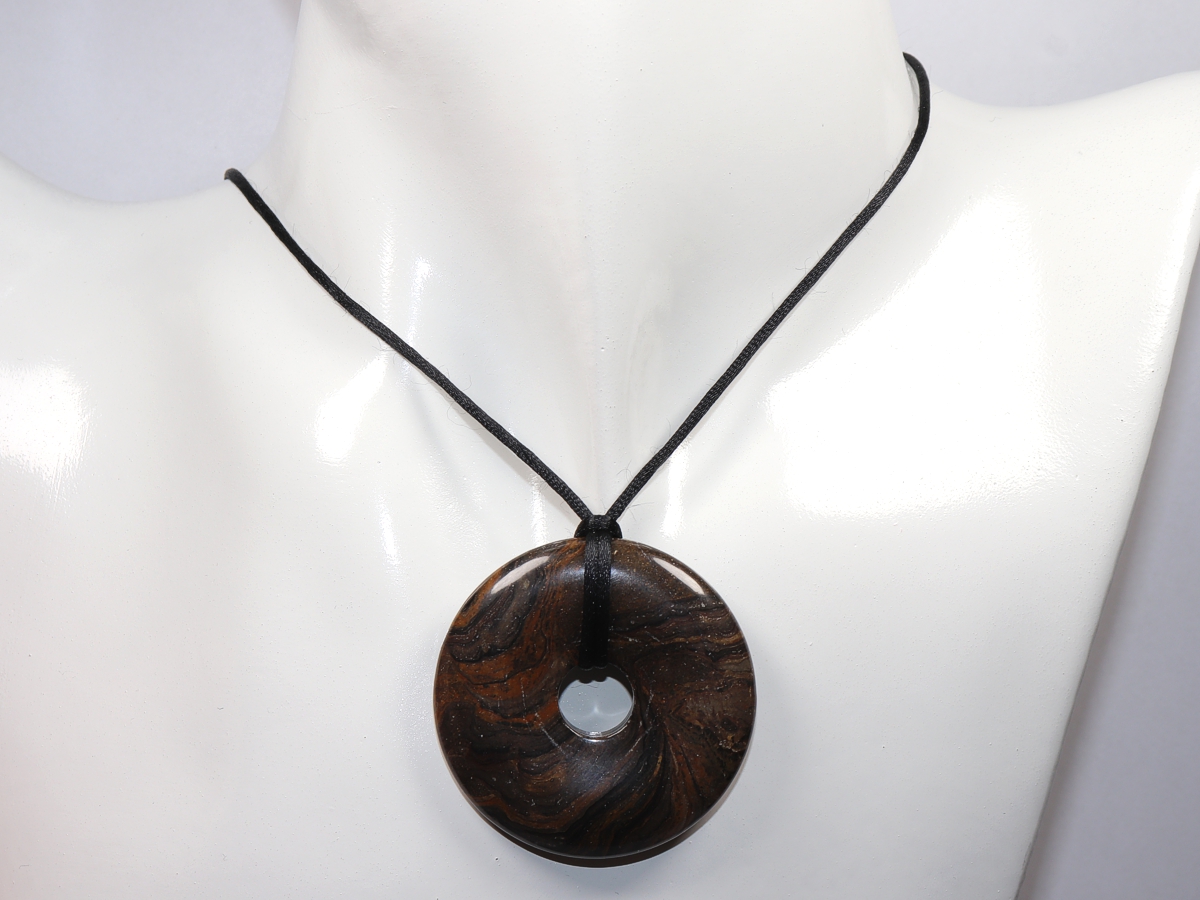 Die Halskette mit dem Donut aus Stromatolith und einem schwarzen Band wird nach Ihren Angaben individualisiert. Der Verschluss ist aus Edelstahl.
