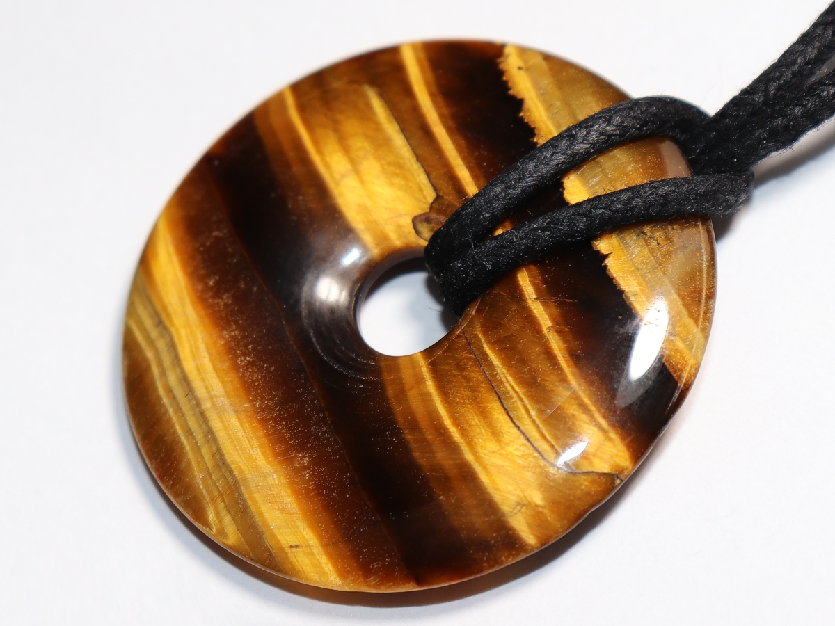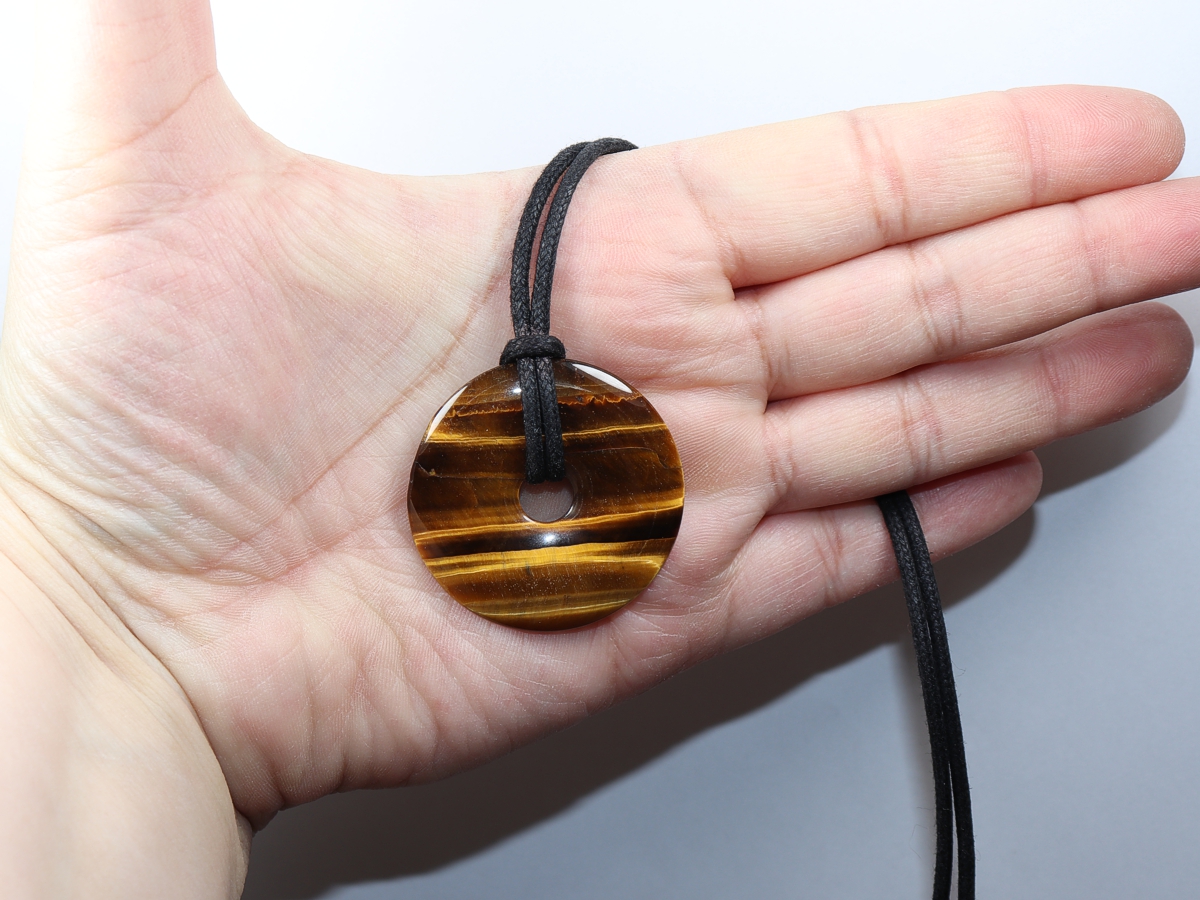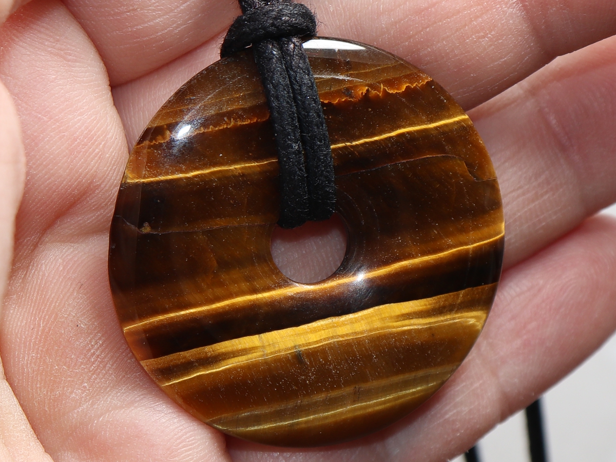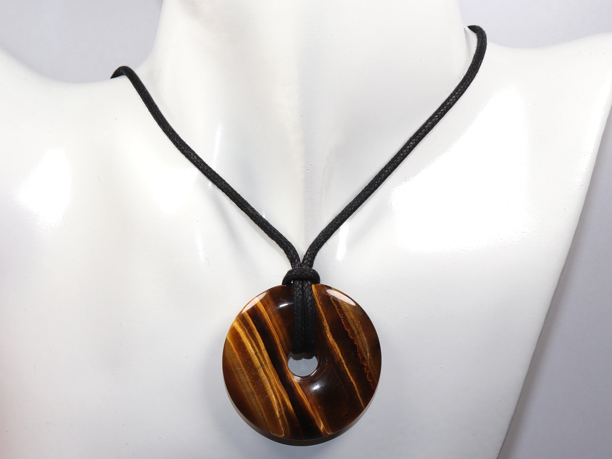 Die Halskette mit dem Donut aus Tigerauge und einem schwarzen Band wird nach Ihren Angaben individualisiert. Der Verschluss ist aus Edelstahl.