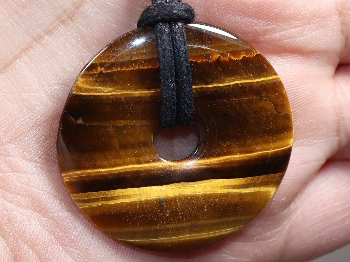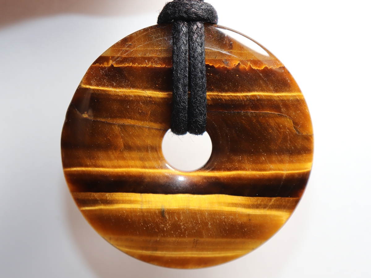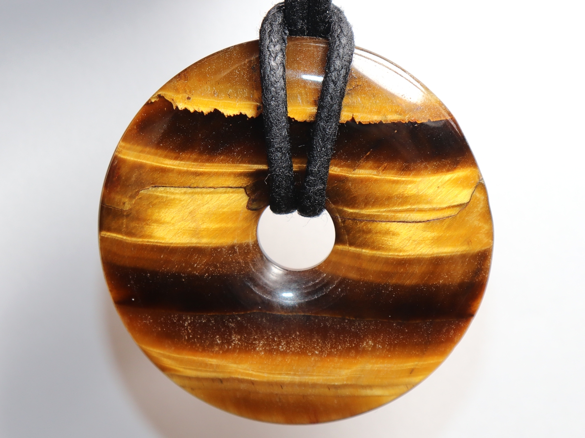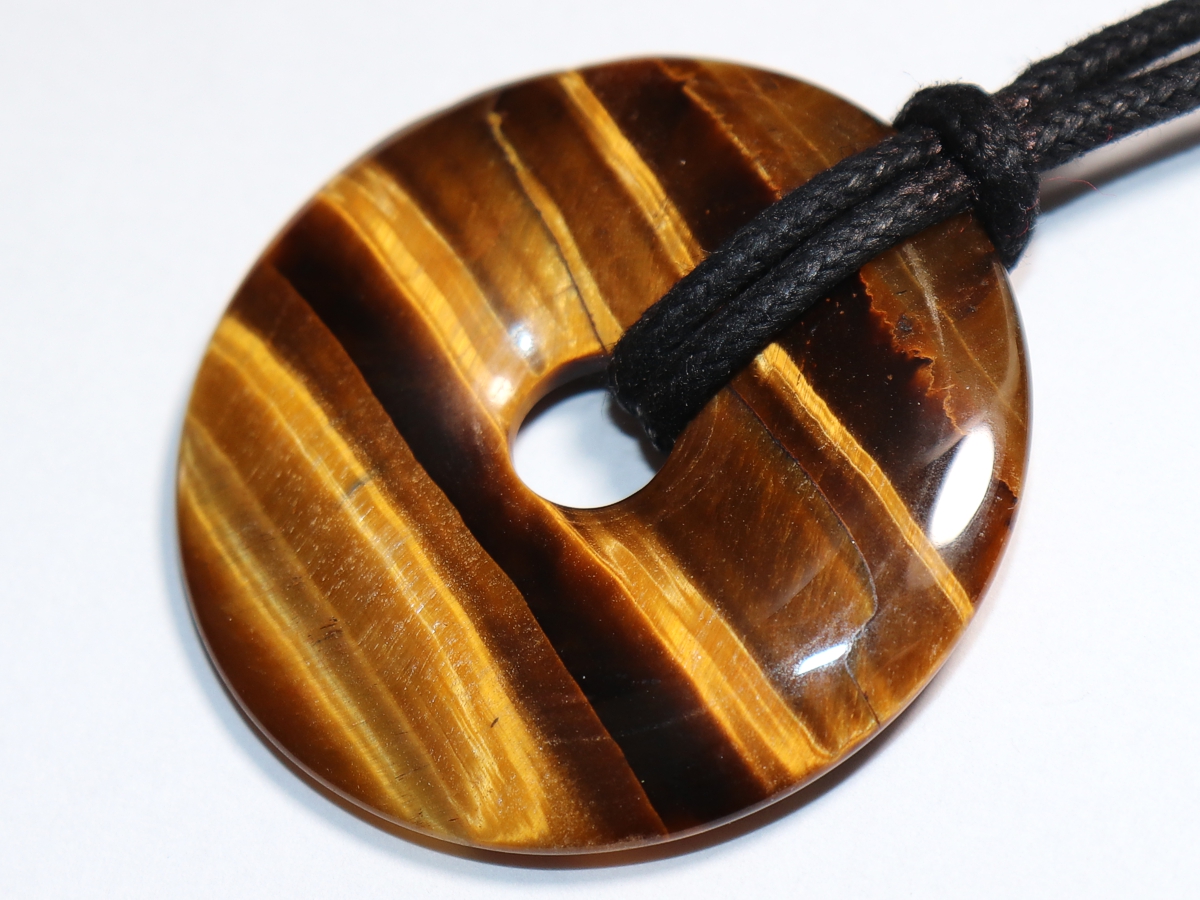 Die Halskette mit dem Donut aus Tigerauge und einem schwarzen Band wird nach Ihren Angaben individualisiert. Der Verschluss ist aus Edelstahl.