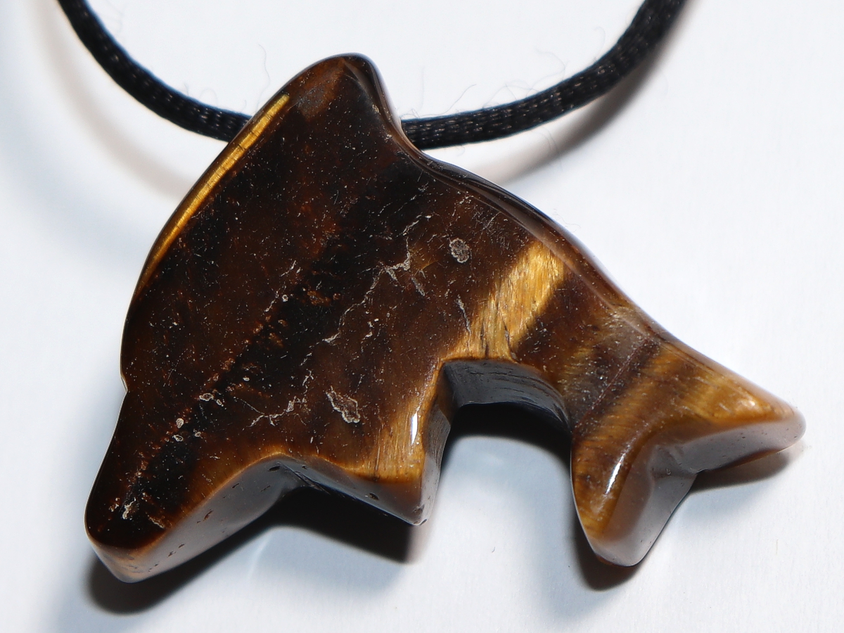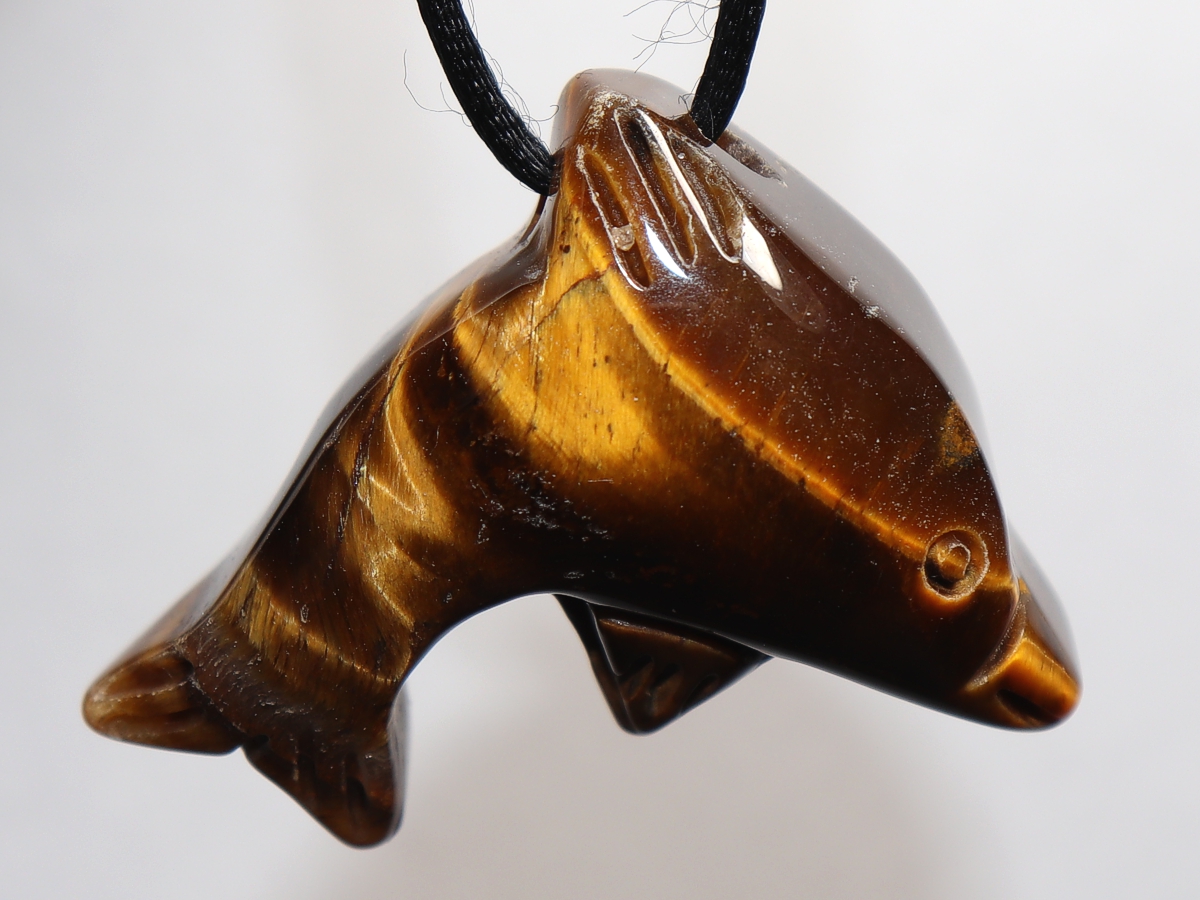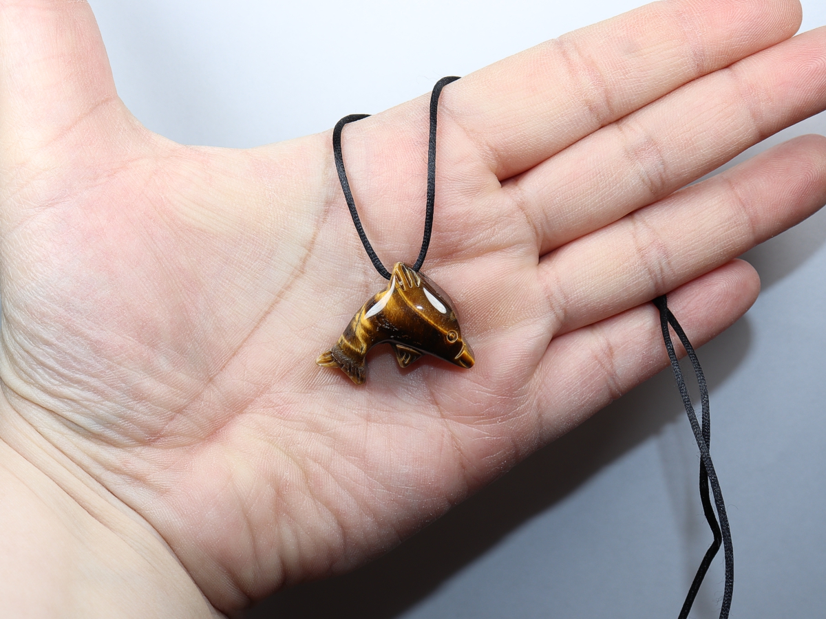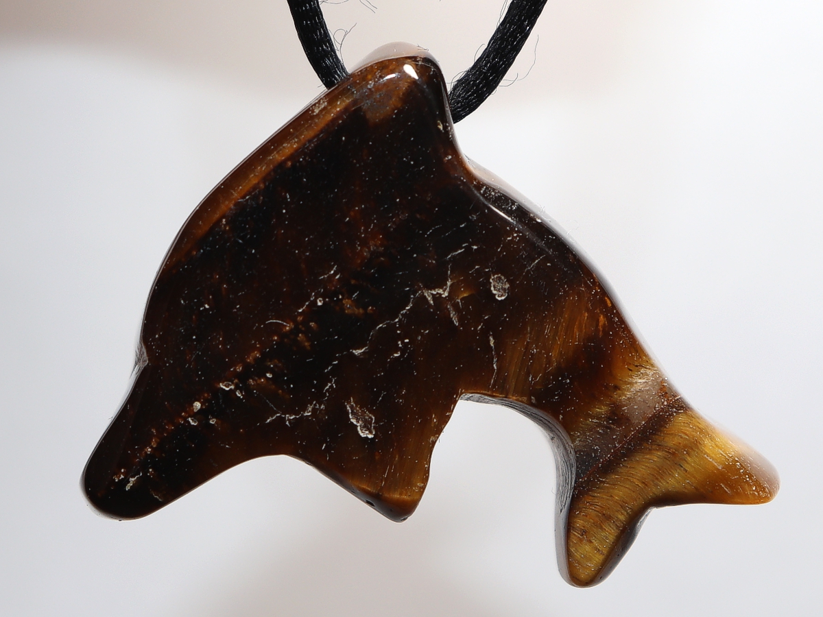 Die Halskette mit dem Delfin aus Tigerauge wird nach Ihren Angaben individualisiert. Sie haben die Wahl zwischen einem schwarzen Band mit einem Verschluss aus Edelstahl oder einer Kette aus Silber 925.