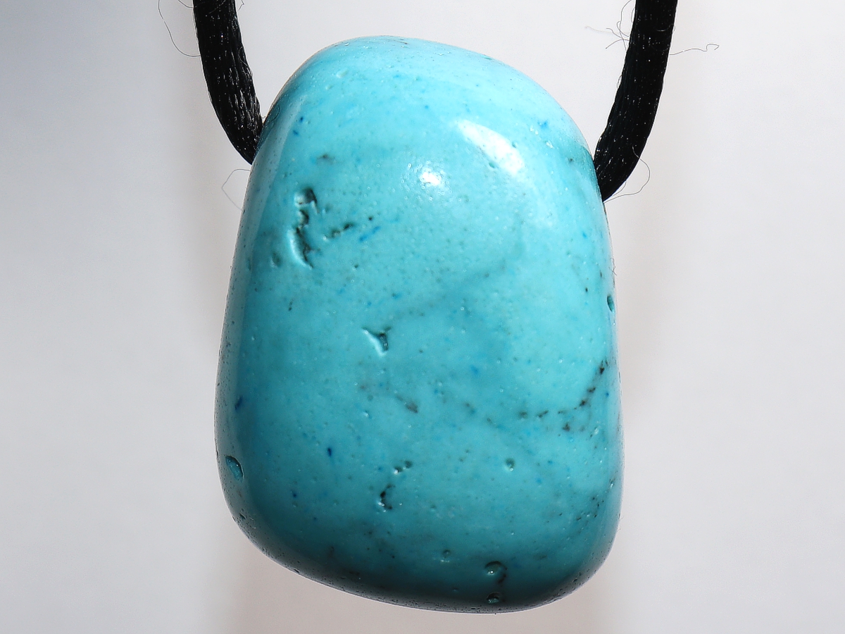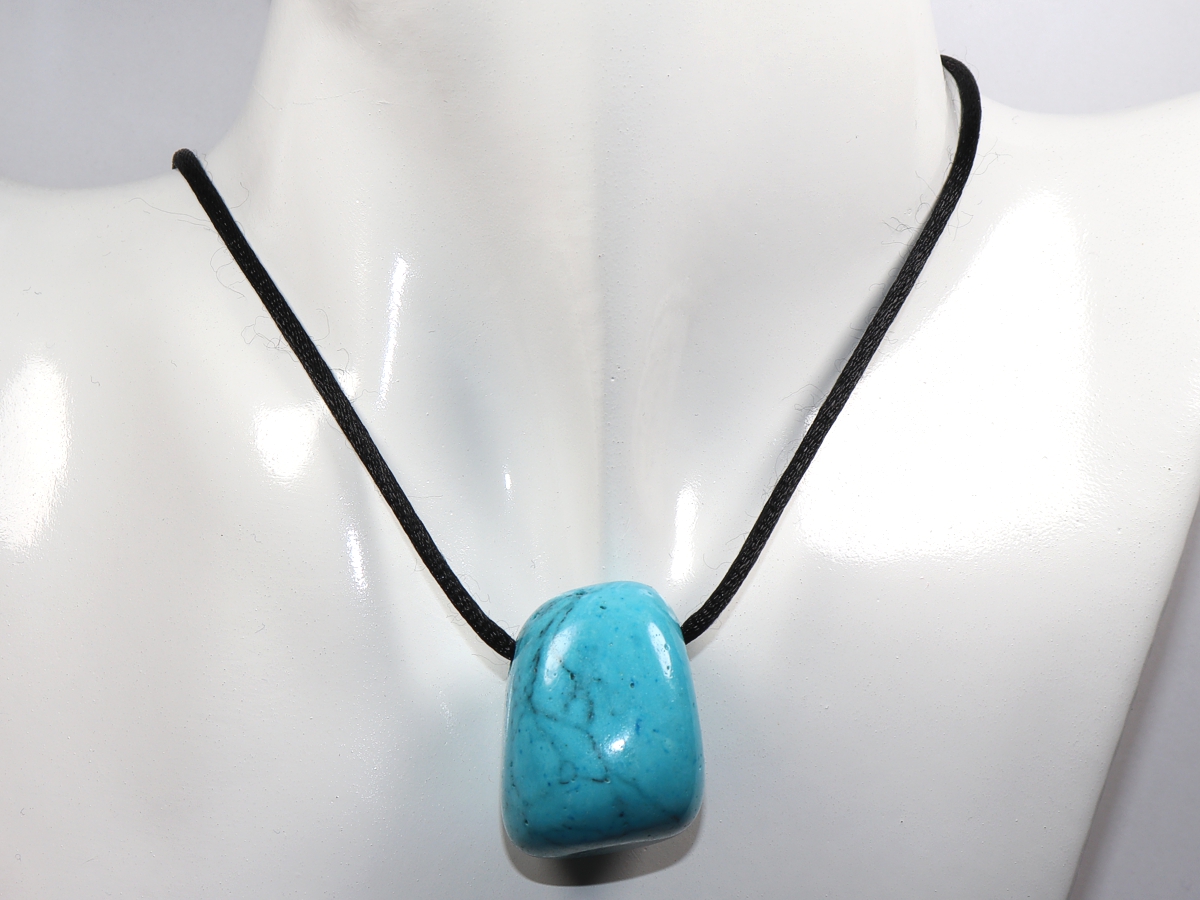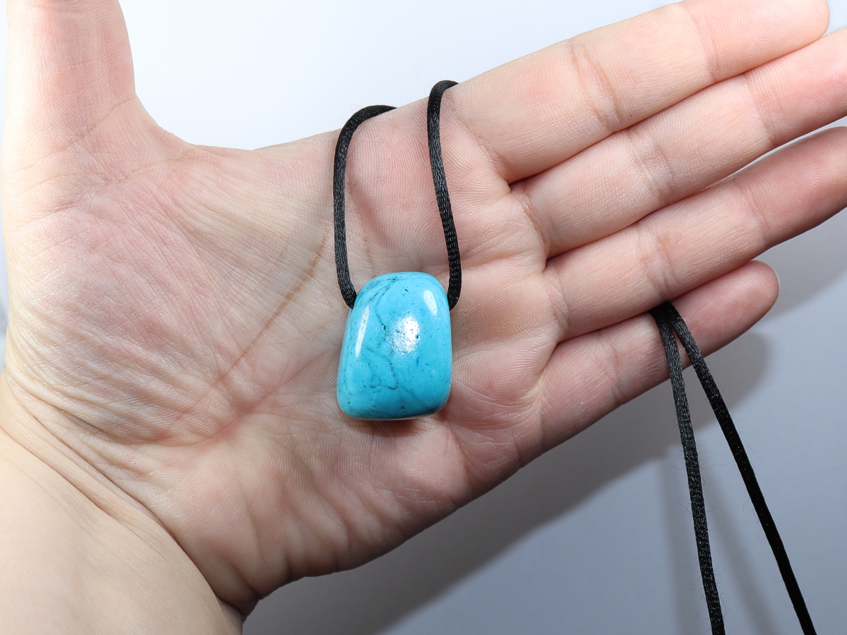 Der Anhänger aus Türkis (rek.) wird mit einem schwarzen Nylonband geliefert.