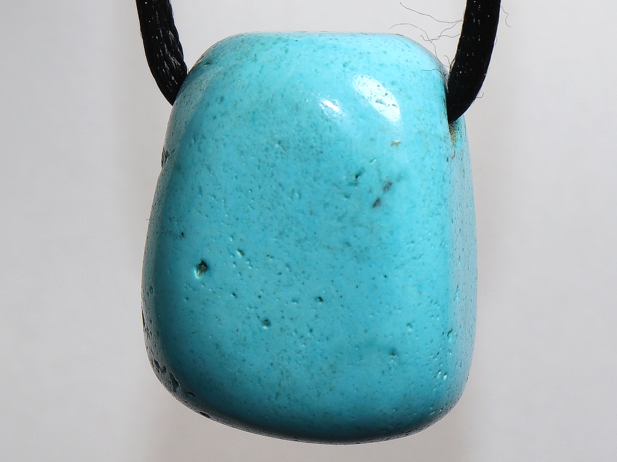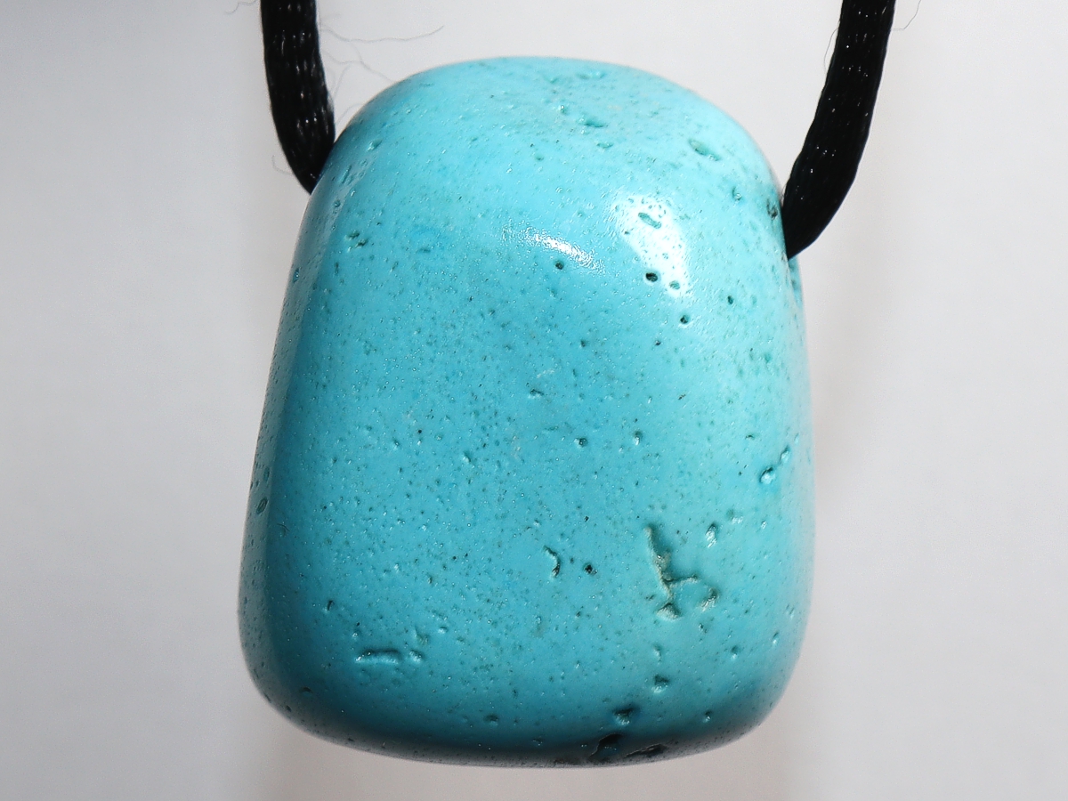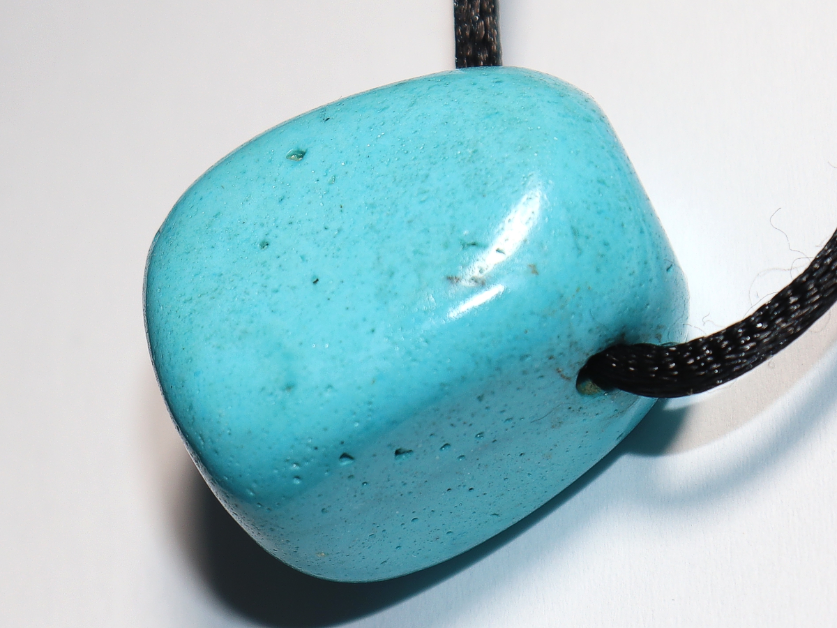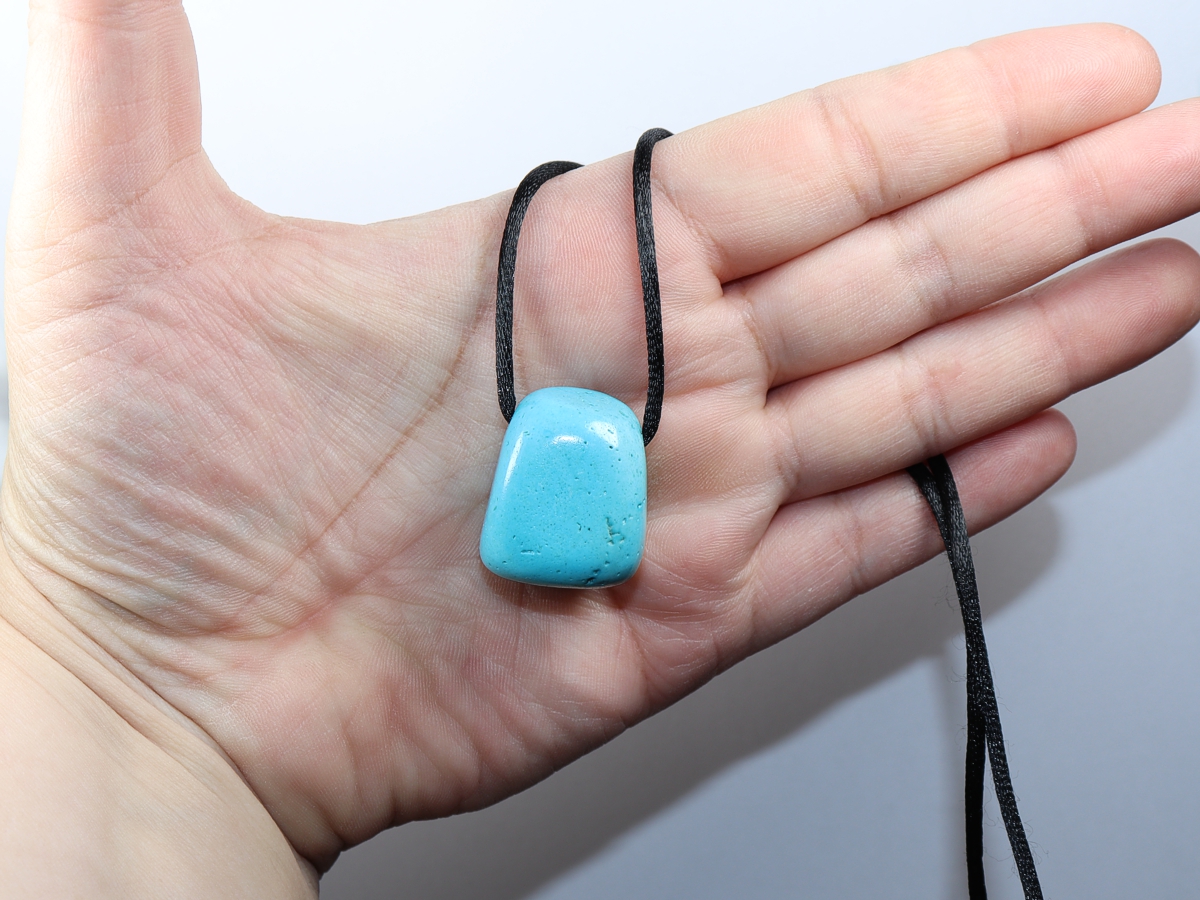 Der Anhänger aus Türkis (rek.) wird mit einem schwarzen Nylonband geliefert.