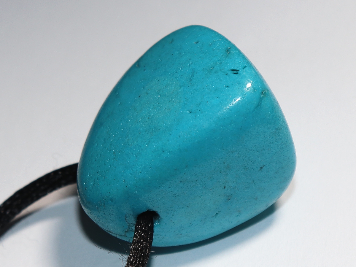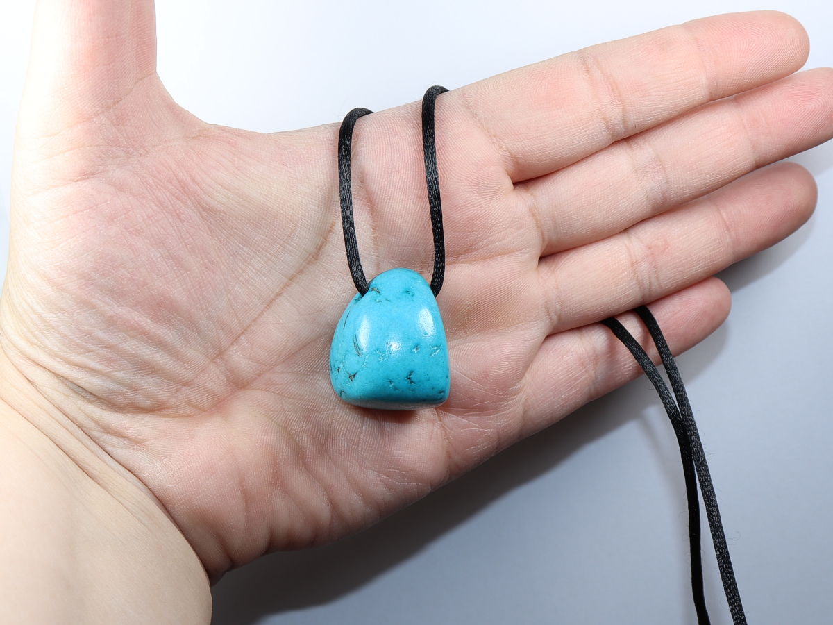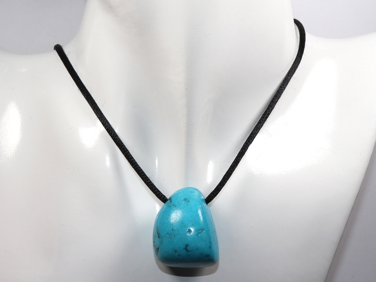 Der Anhänger aus Türkis (rek.) wird mit einem schwarzen Nylonband geliefert.