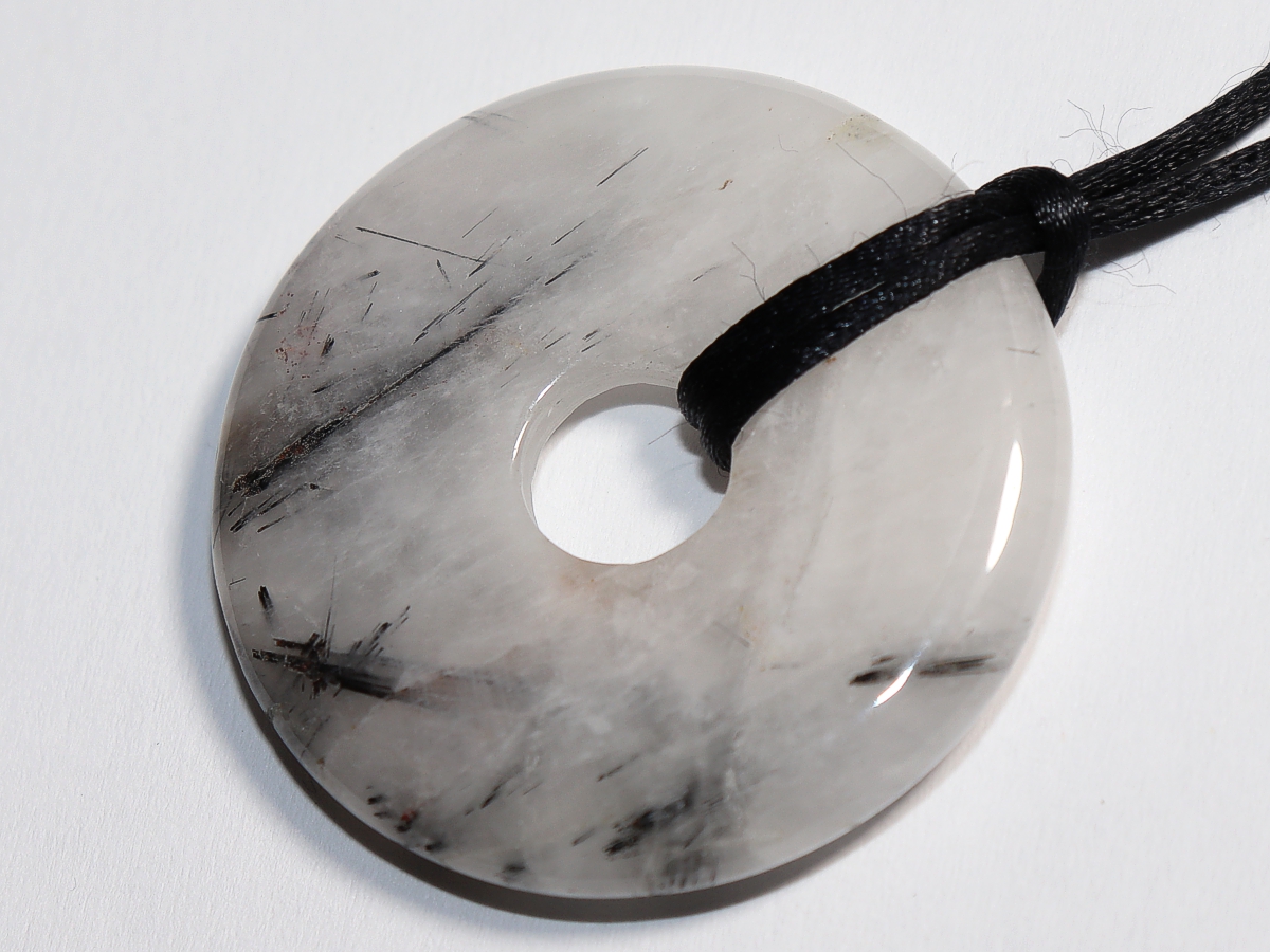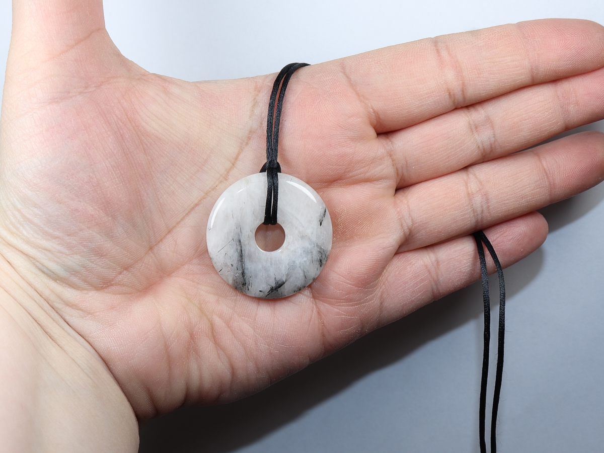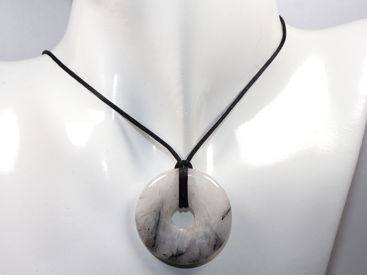 Die Halskette mit dem Donut aus Turmalinquarz und einem schwarzen Band wird nach Ihren Angaben individualisiert. Der Verschluss ist aus Edelstahl.