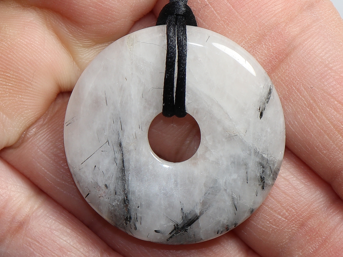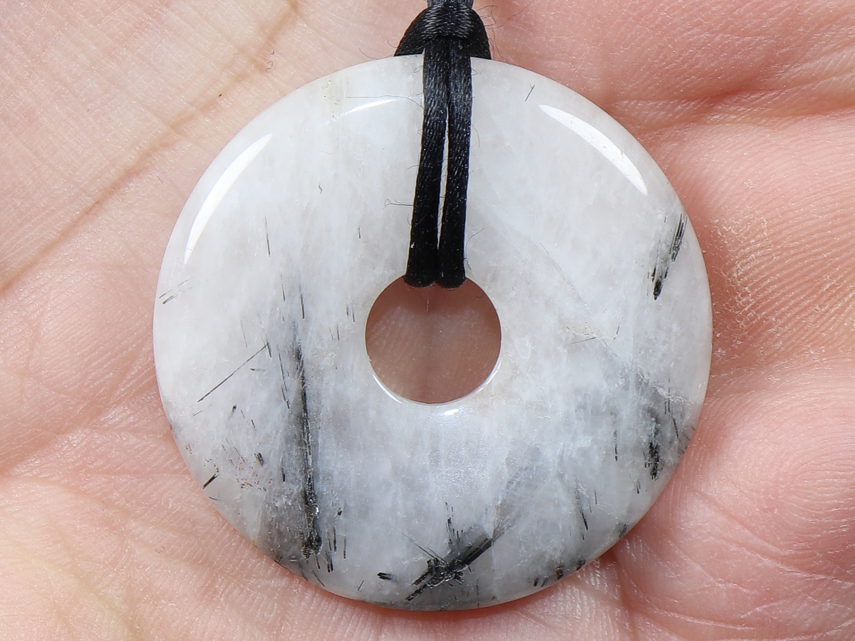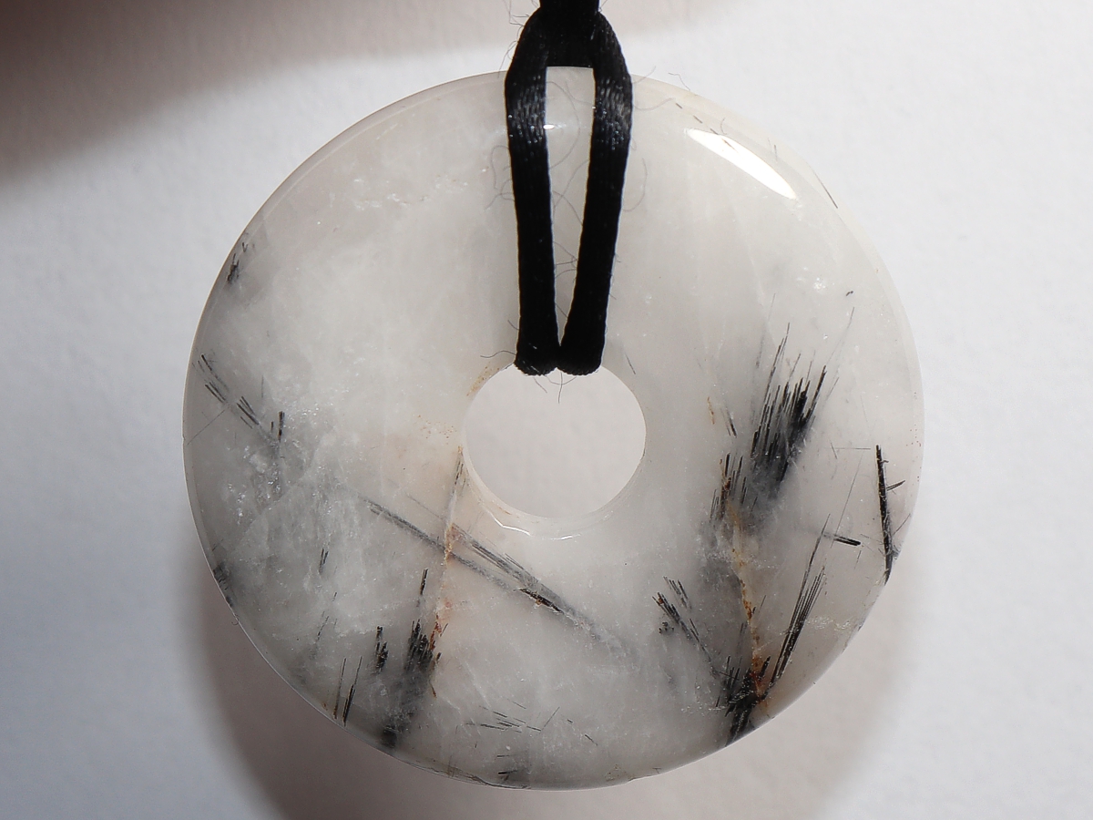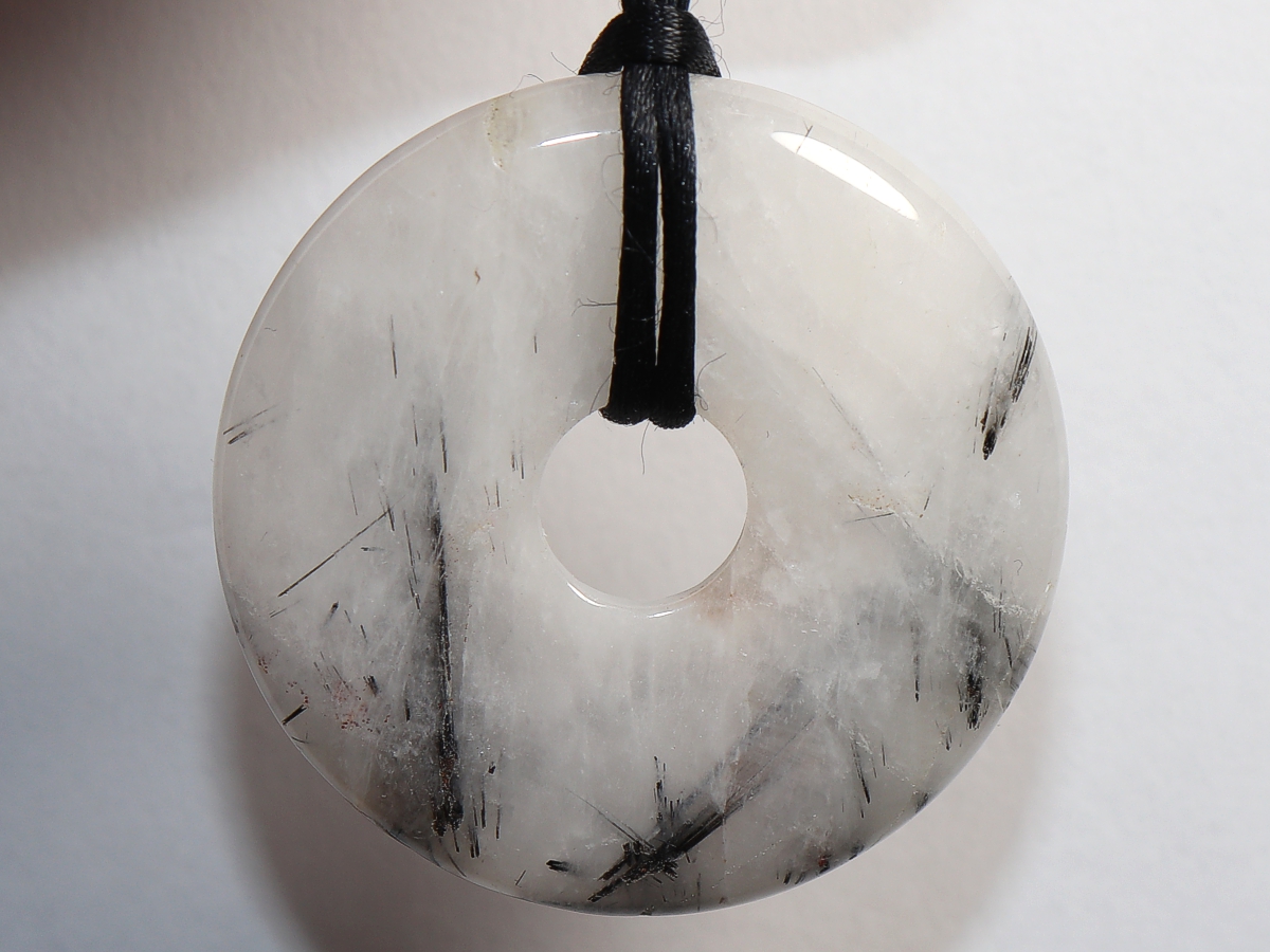 Die Halskette mit dem Donut aus Turmalinquarz und einem schwarzen Band wird nach Ihren Angaben individualisiert. Der Verschluss ist aus Edelstahl.