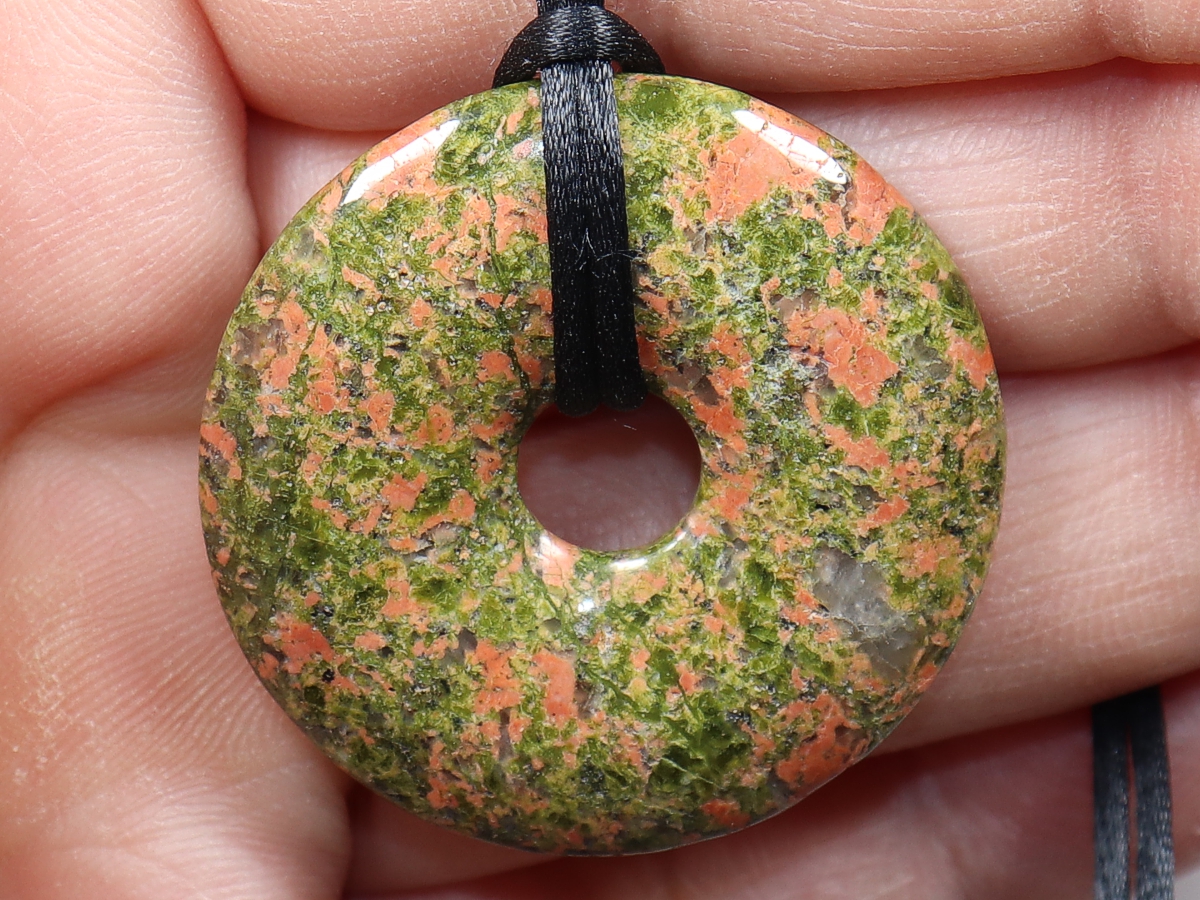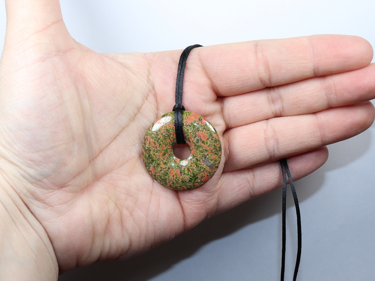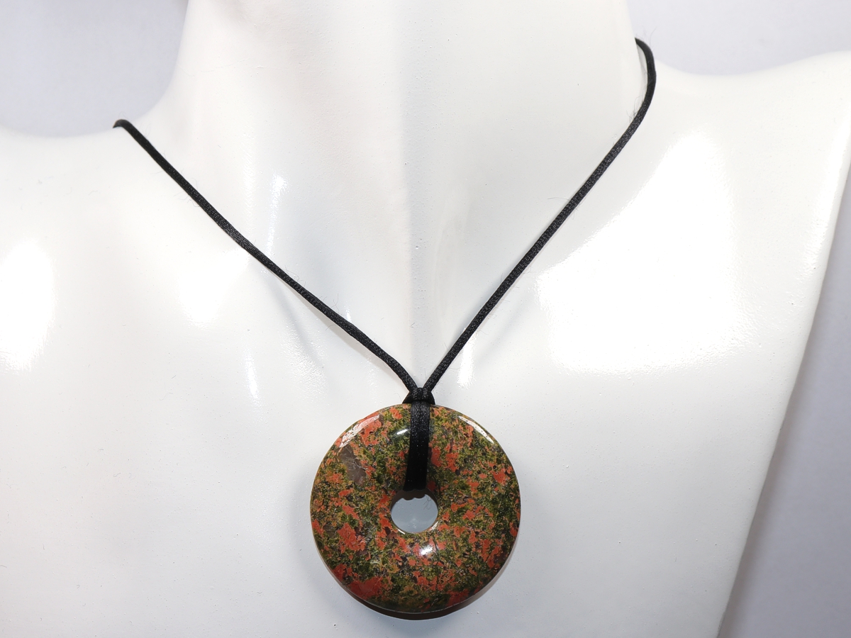 Die Halskette mit dem Donut aus Unakit und einem schwarzen Band wird nach Ihren Angaben individualisiert. Der Verschluss ist aus Edelstahl.