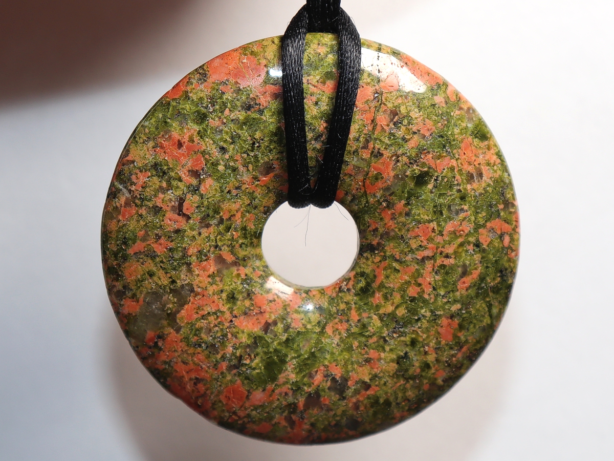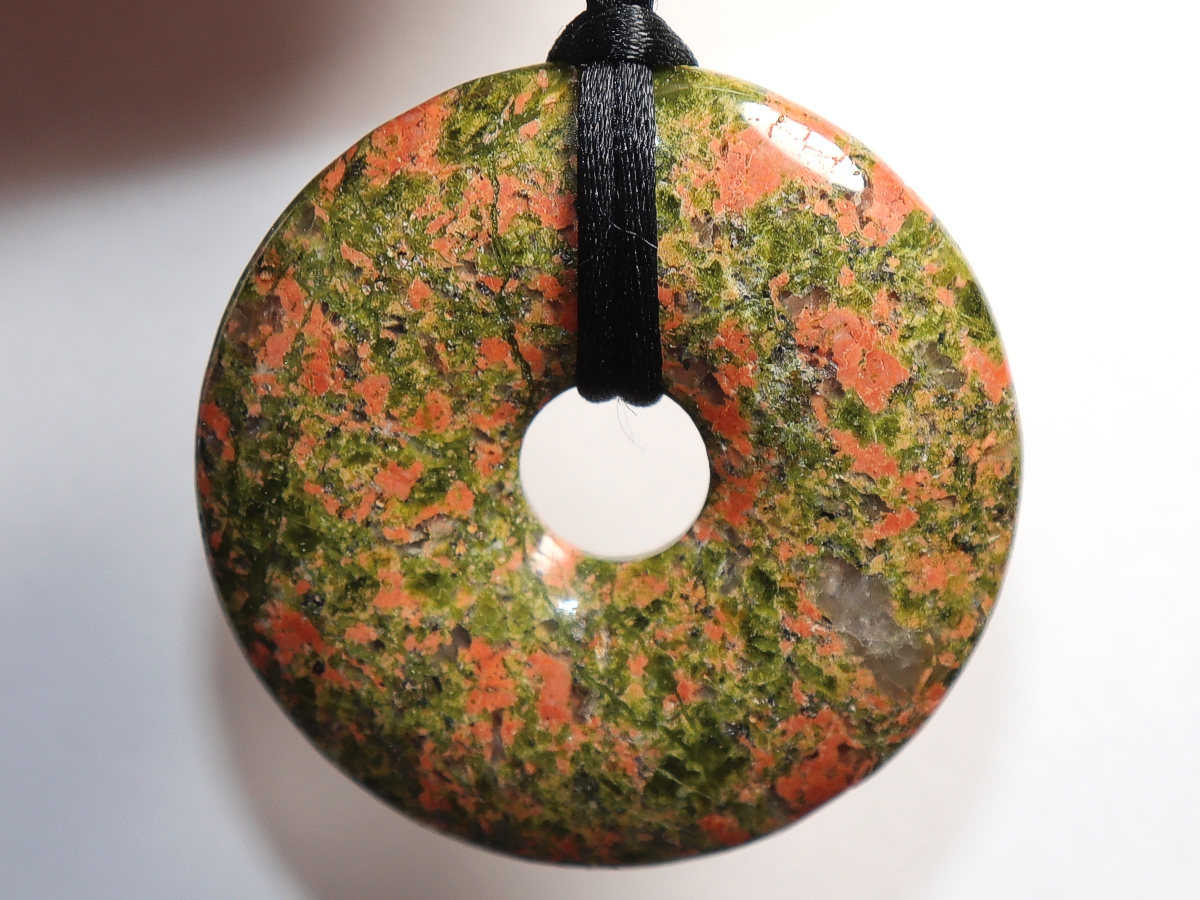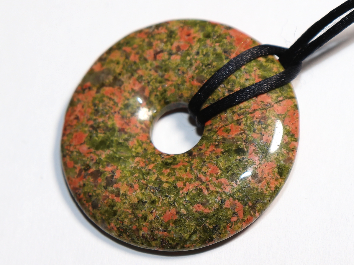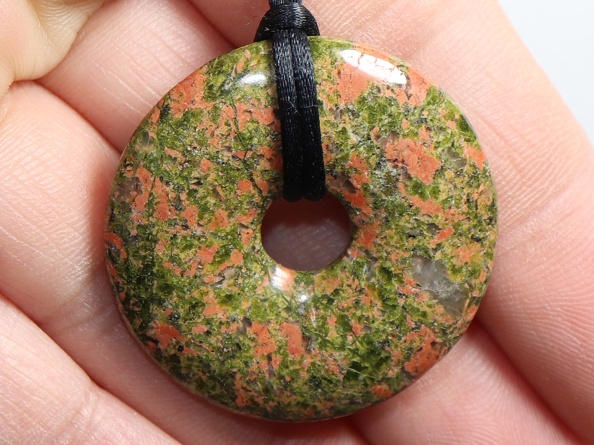 Die Halskette mit dem Donut aus Unakit und einem schwarzen Band wird nach Ihren Angaben individualisiert. Der Verschluss ist aus Edelstahl.