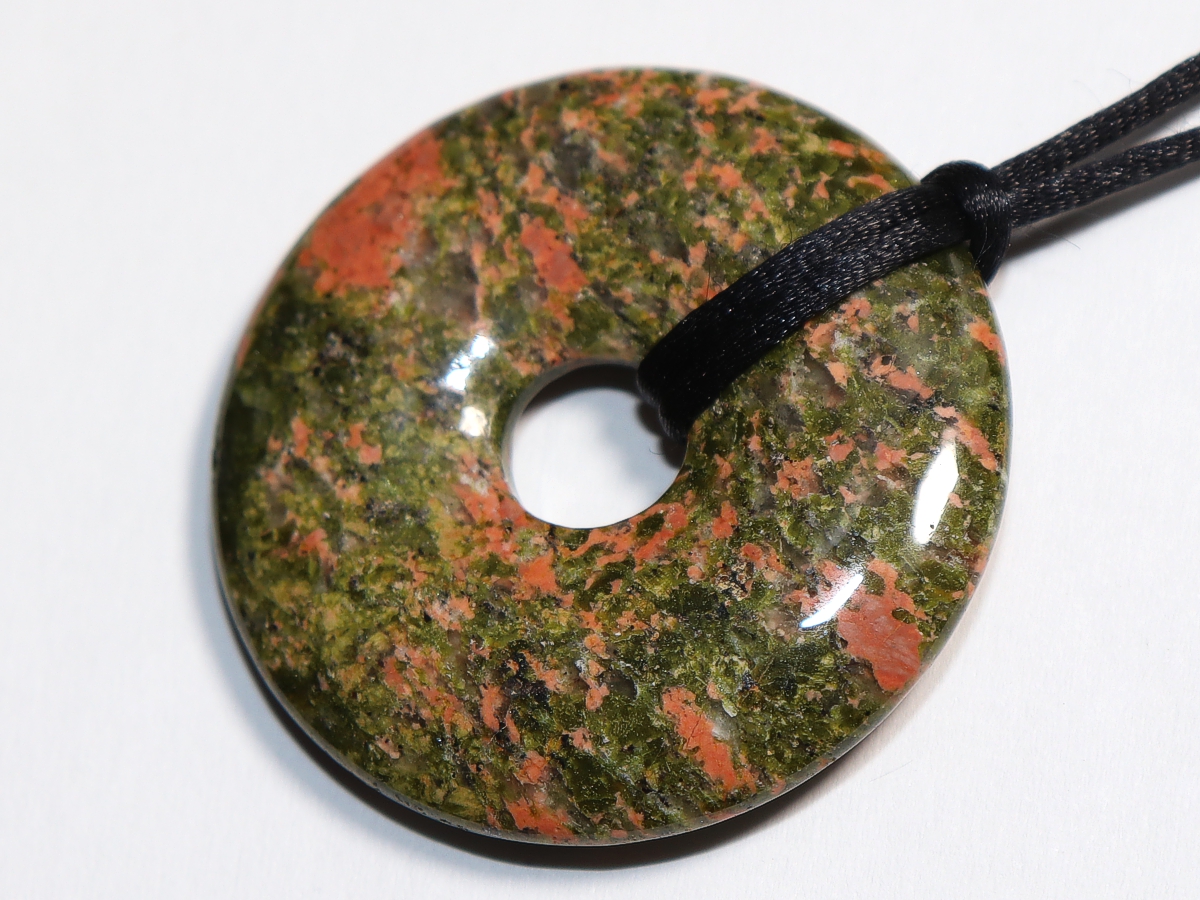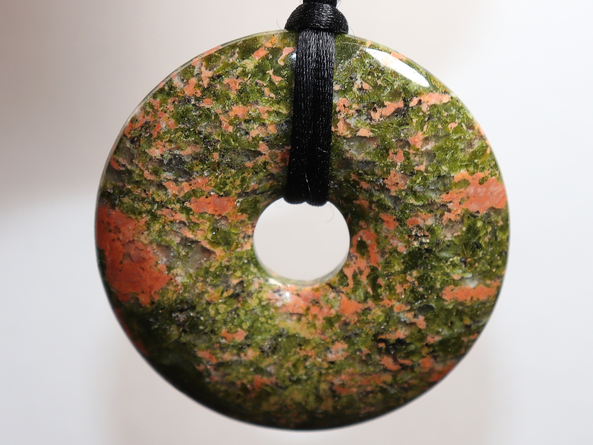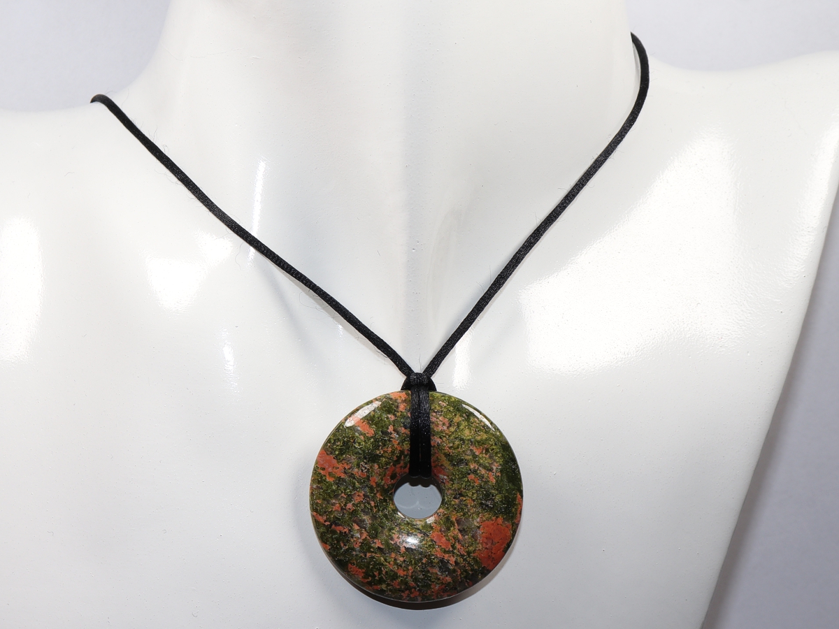 Die Halskette mit dem Donut aus Unakit und einem schwarzen Band wird nach Ihren Angaben individualisiert. Der Verschluss ist aus Edelstahl.