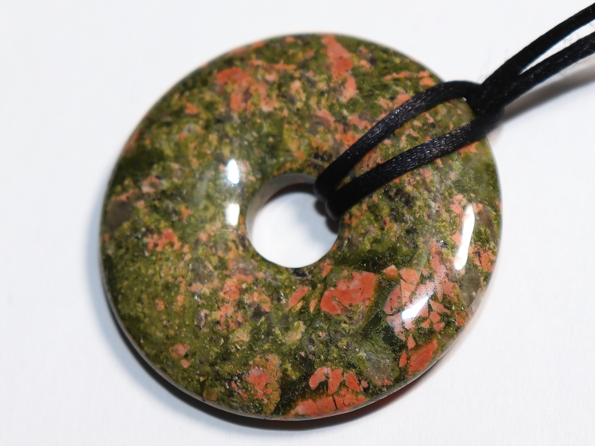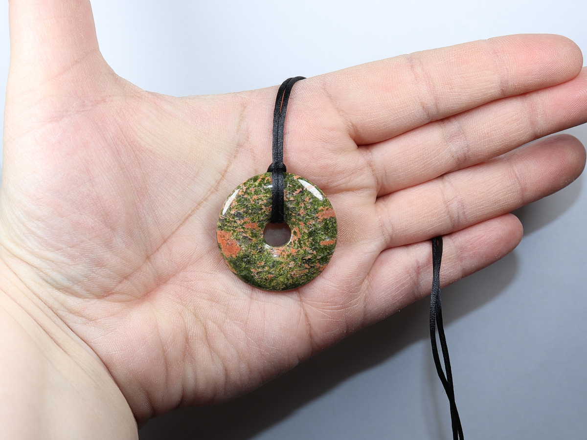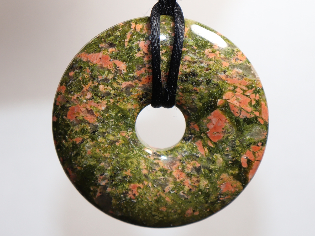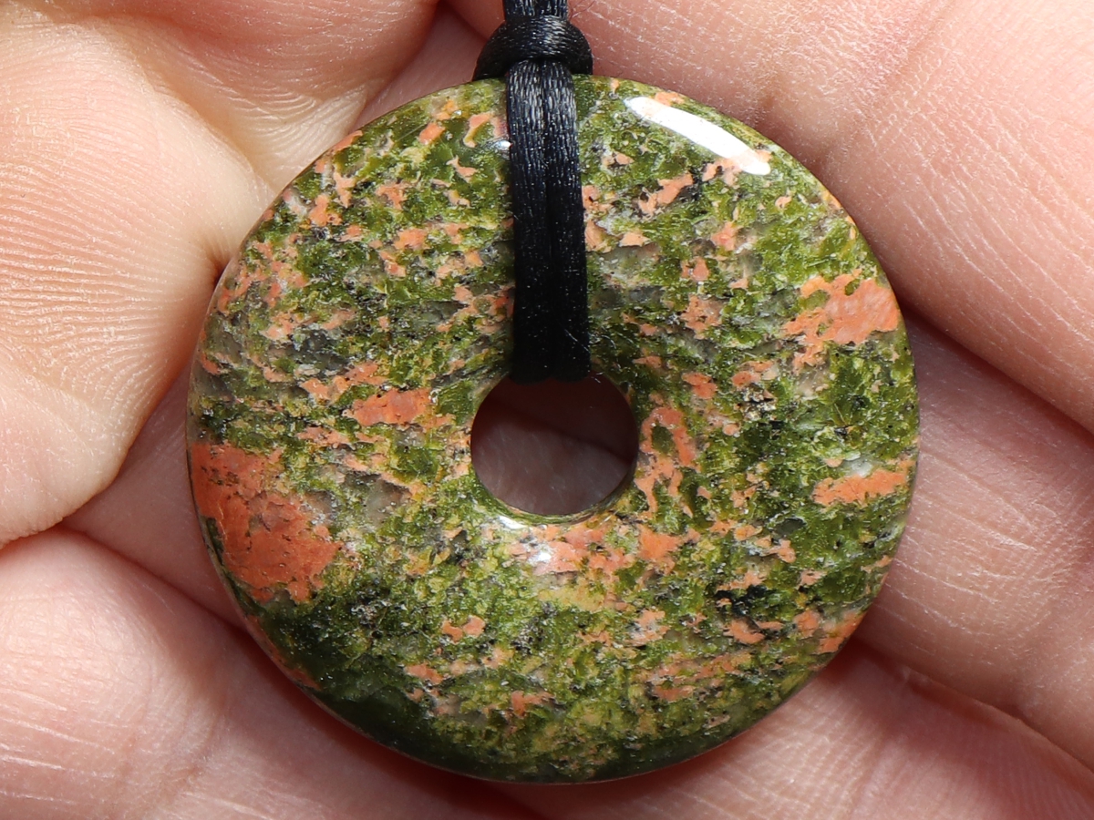 Die Halskette mit dem Donut aus Unakit und einem schwarzen Band wird nach Ihren Angaben individualisiert. Der Verschluss ist aus Edelstahl.
