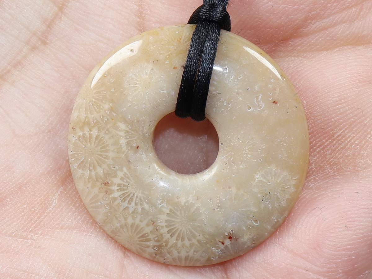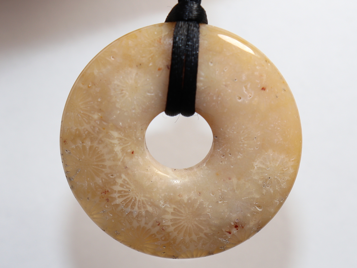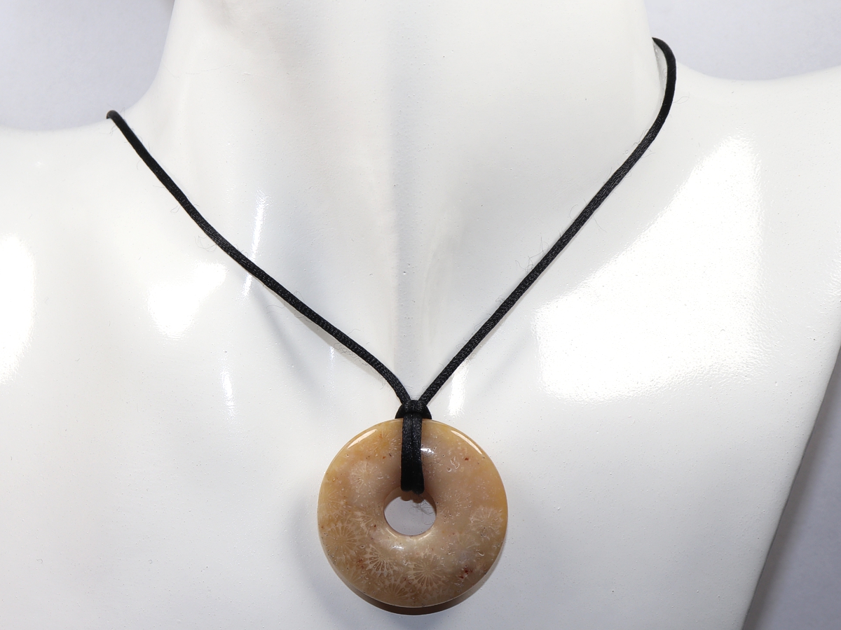 Die Halskette mit dem Donut aus versteinerter Koralle und einem schwarzen Band wird nach Ihren Angaben individualisiert. Der Verschluss ist aus Edelstahl.