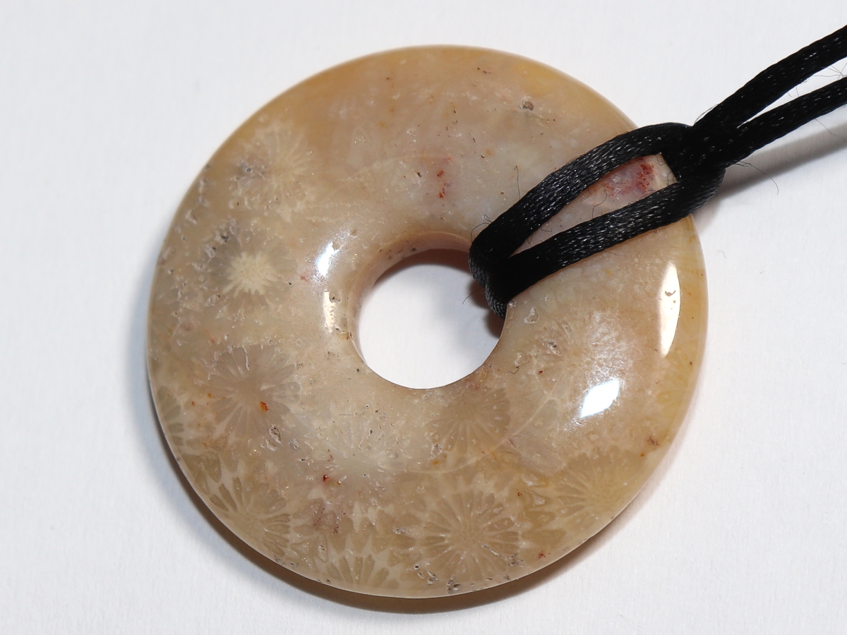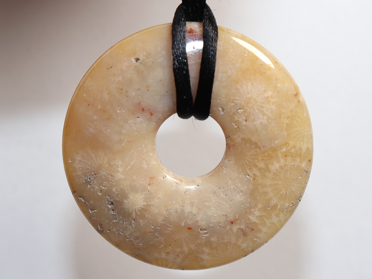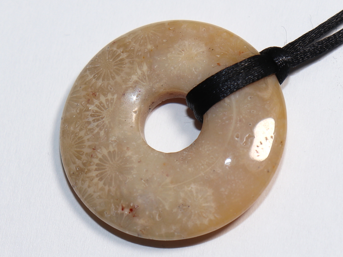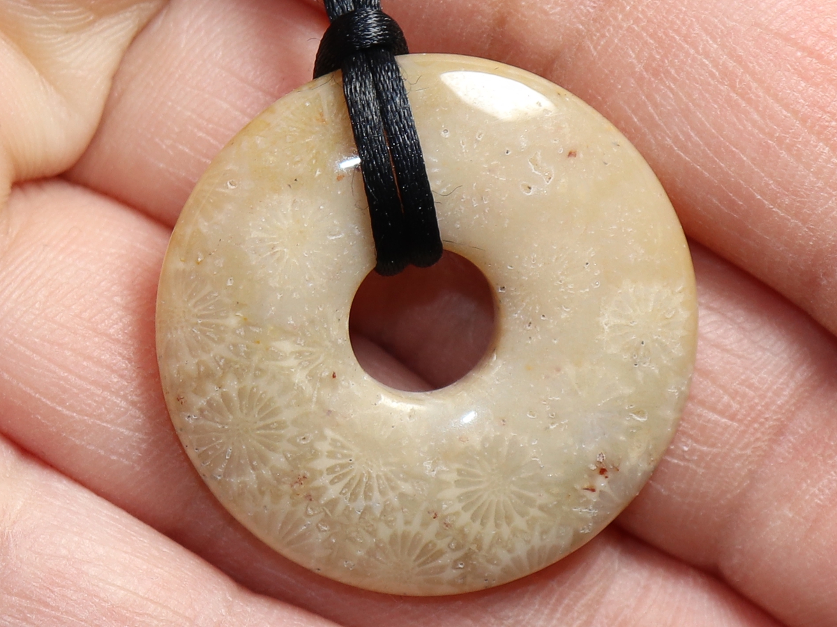 Die Halskette mit dem Donut aus versteinerter Koralle und einem schwarzen Band wird nach Ihren Angaben individualisiert. Der Verschluss ist aus Edelstahl.