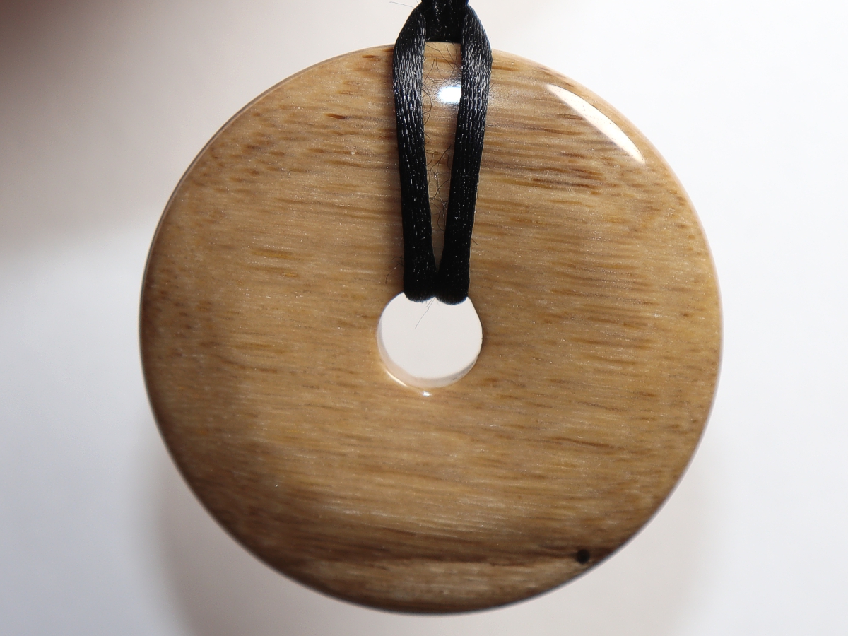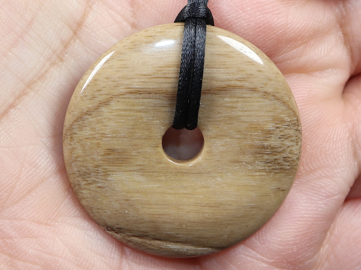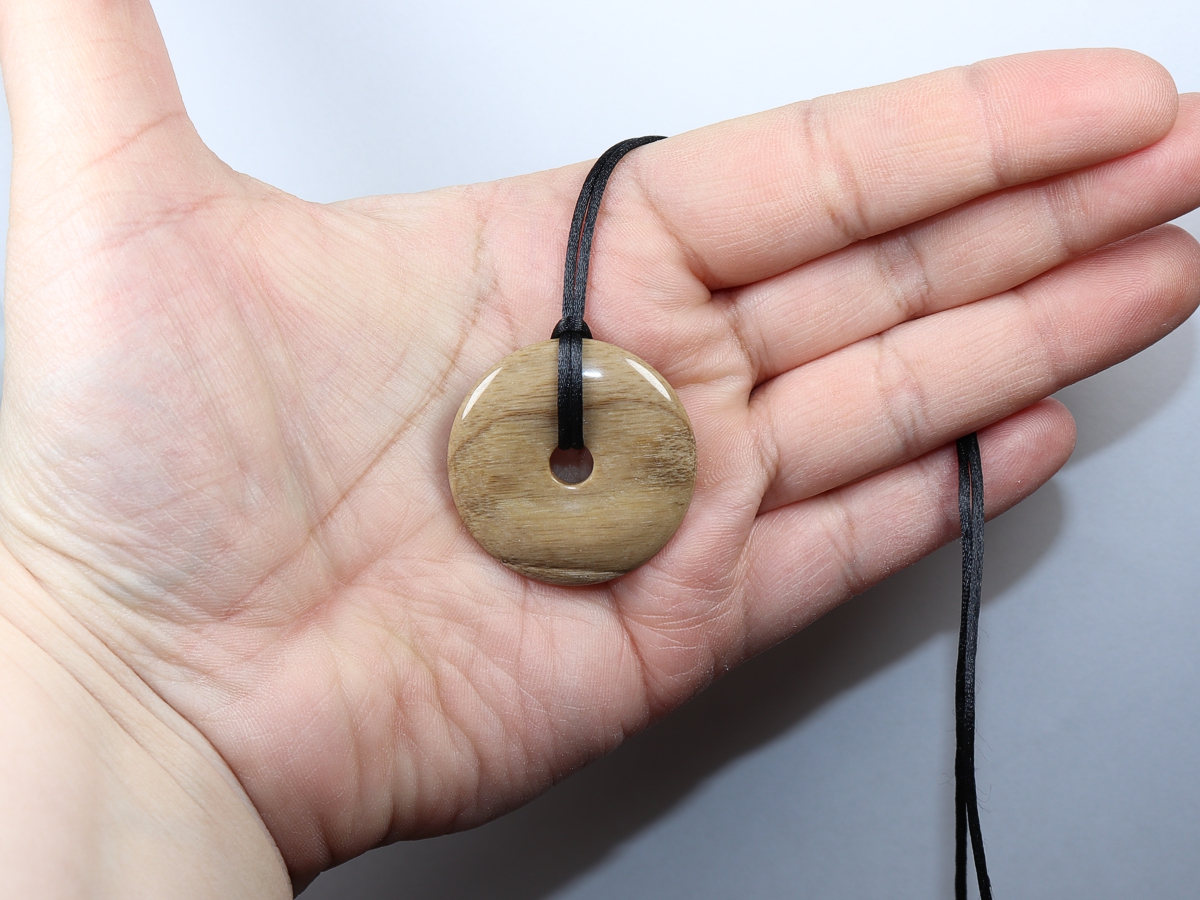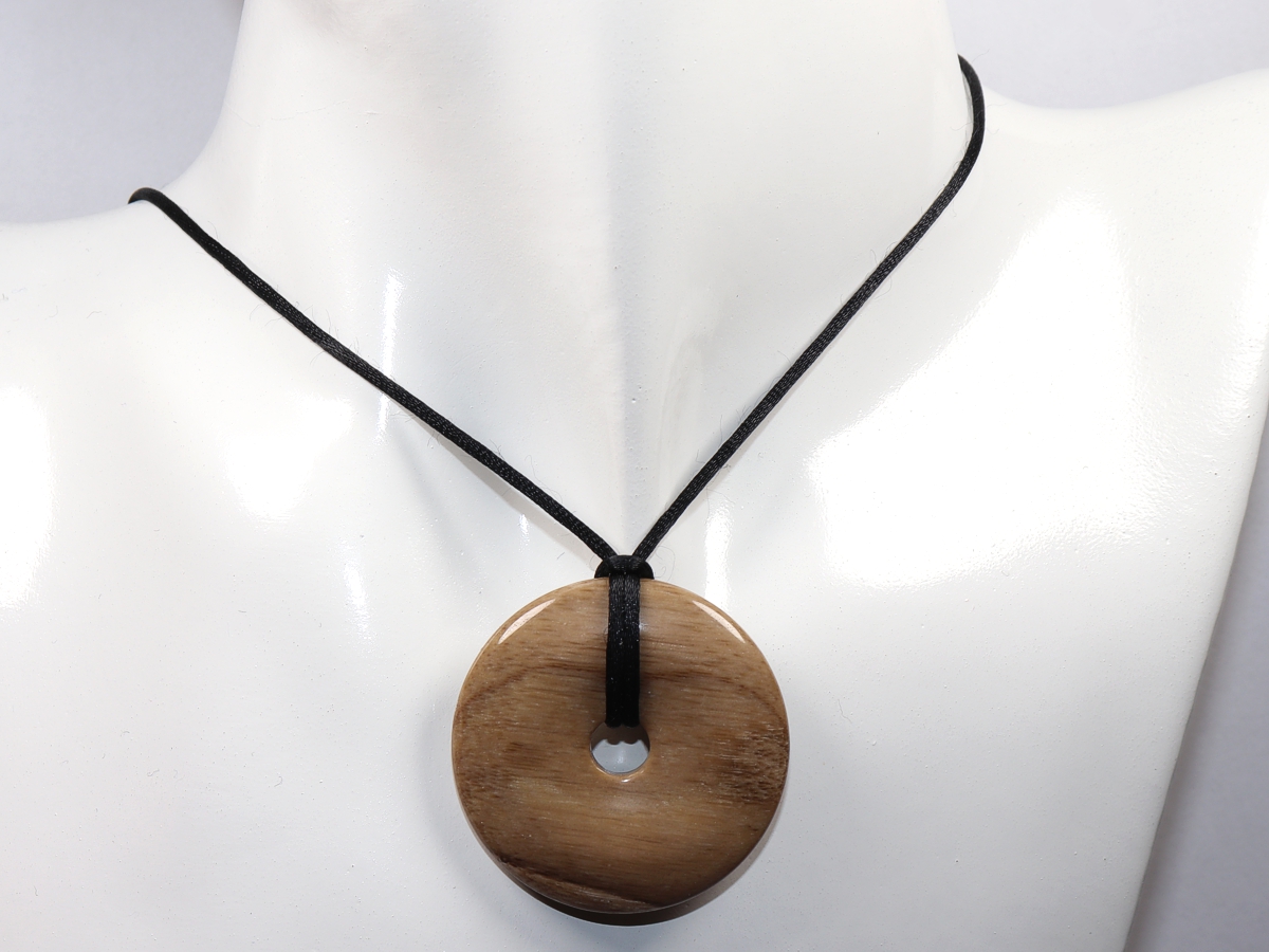 Die Halskette mit dem Donut aus versteinertem Holz und einem schwarzen Band wird nach Ihren Angaben individualisiert. Der Verschluss ist aus Edelstahl.