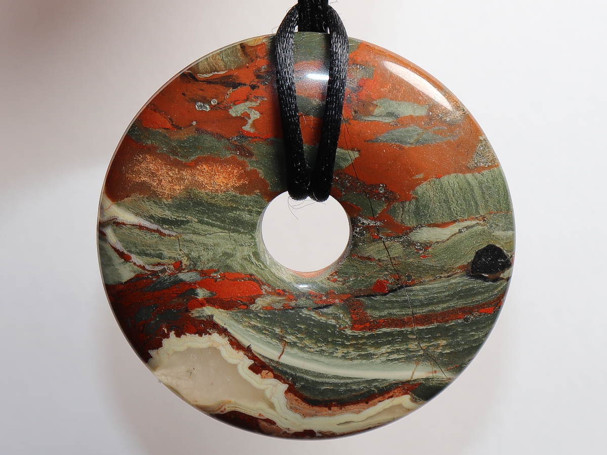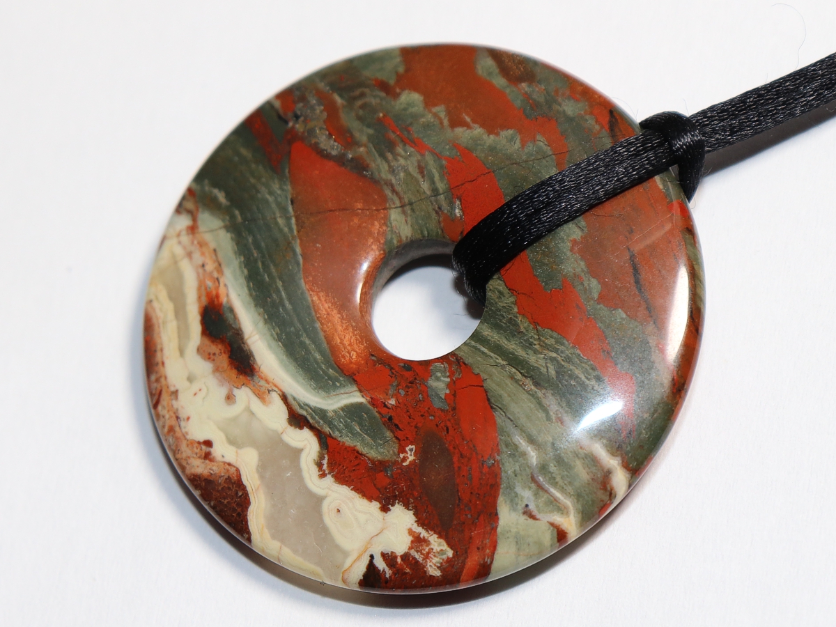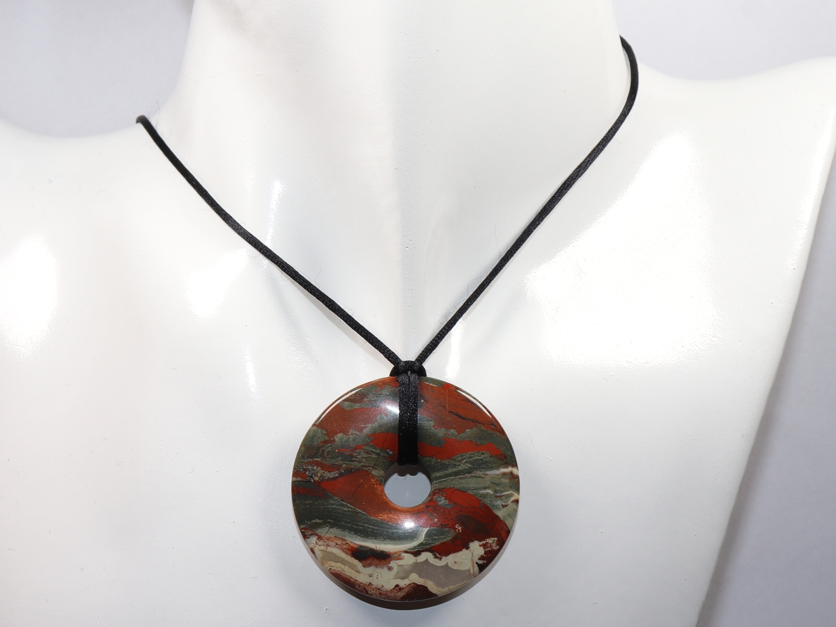 Die Halskette mit dem Donut aus Vulkanjaspis und einem schwarzen Band wird nach Ihren Angaben individualisiert. Der Verschluss ist aus Edelstahl.