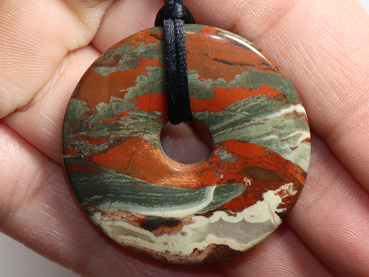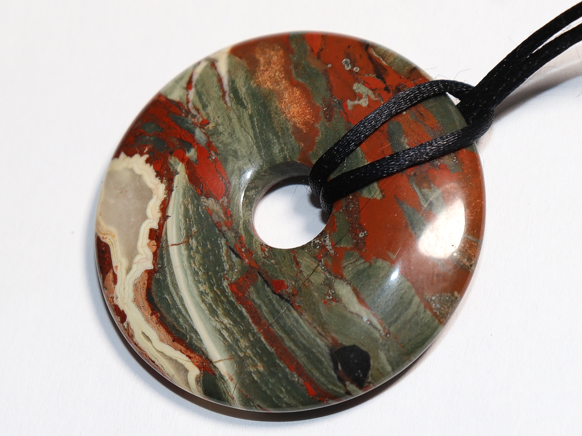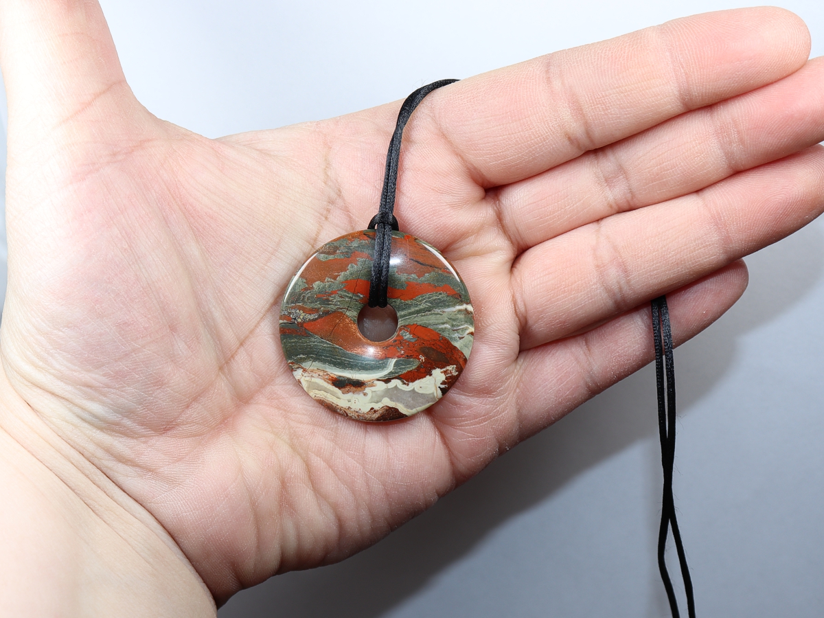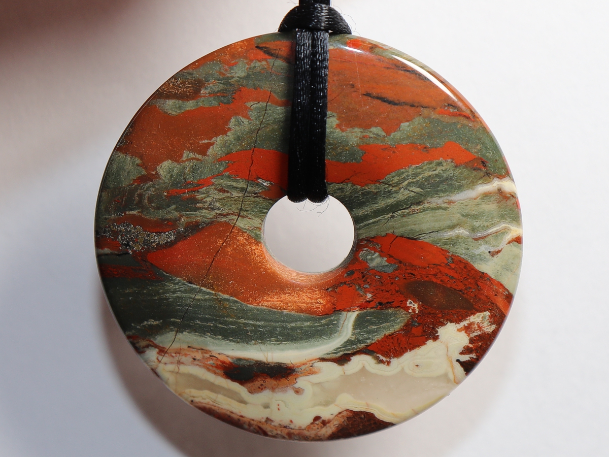 Die Halskette mit dem Donut aus Vulkanjaspis und einem schwarzen Band wird nach Ihren Angaben individualisiert. Der Verschluss ist aus Edelstahl.
