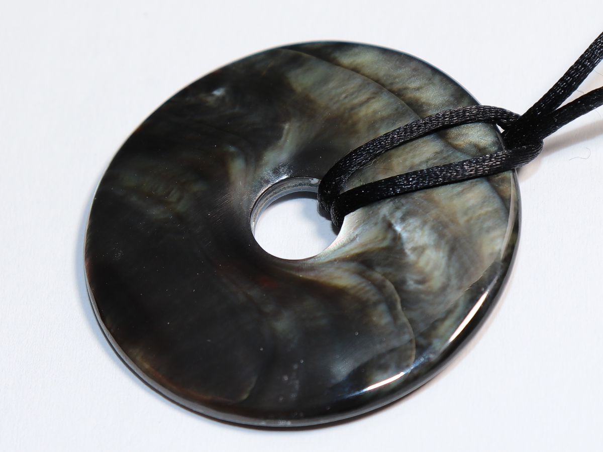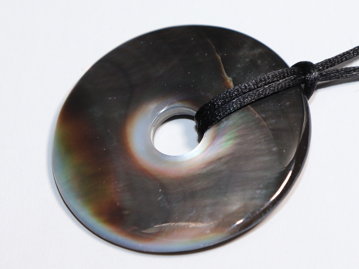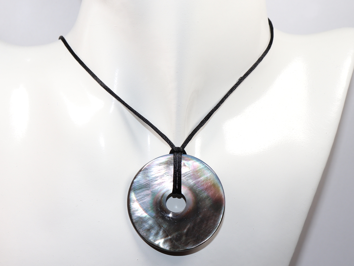 The necklace with the donut made of abalone shell and a black cord will be individualized according to your specifications. The closure is made of stainless steel.