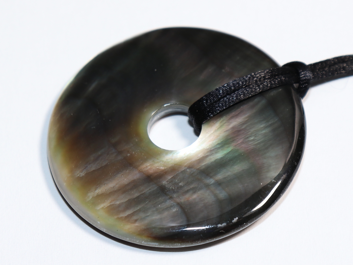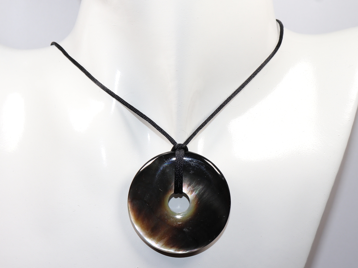 The necklace with the donut made of abalone shell and a black cord will be individualized according to your specifications. The closure is made of stainless steel.